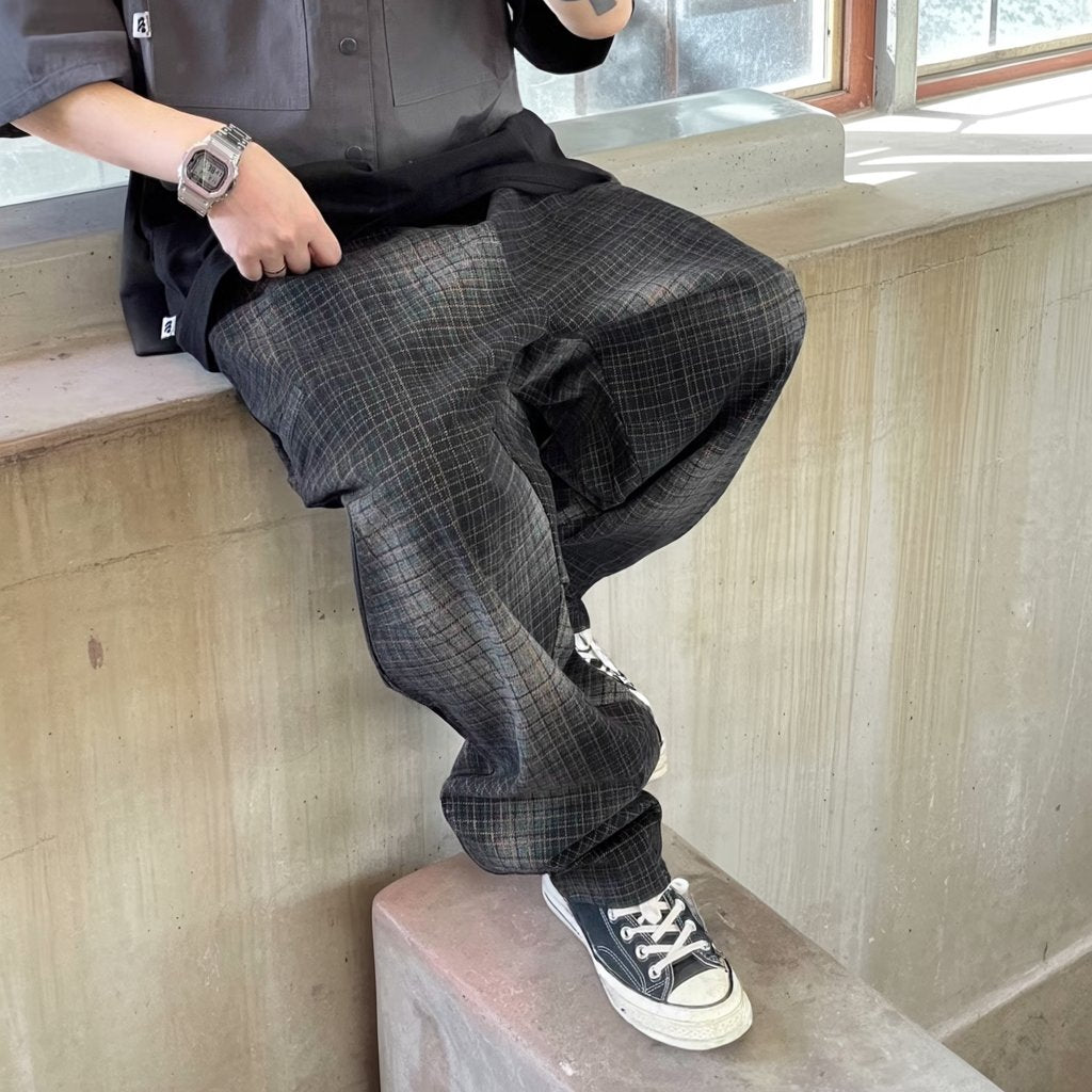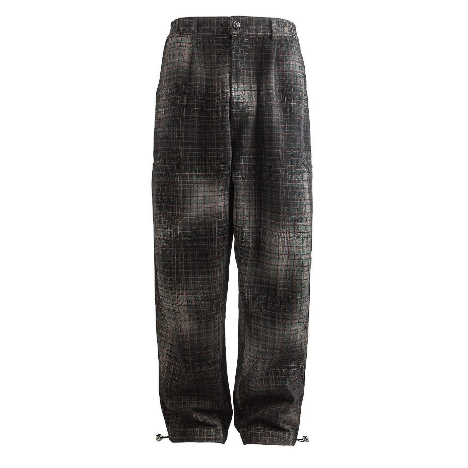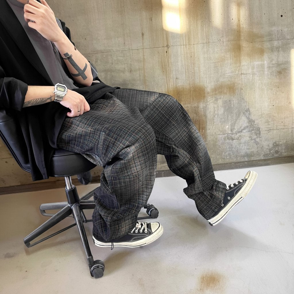 深みのあるダークトーンに細かなチェック柄をのせたルーズシルエットのパンツ。