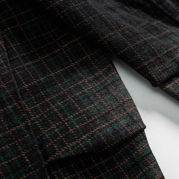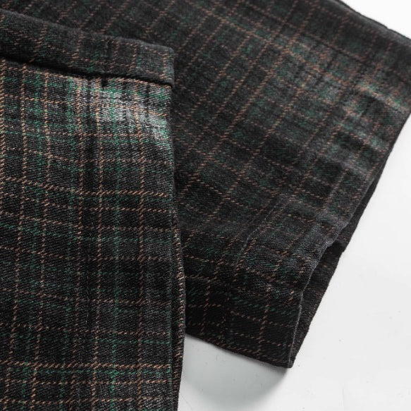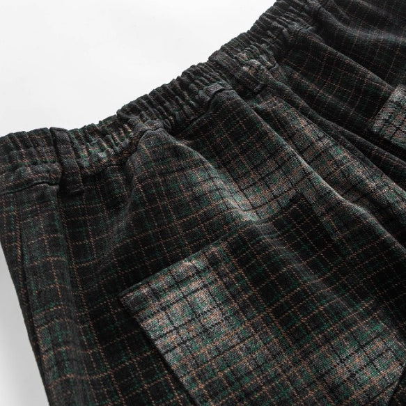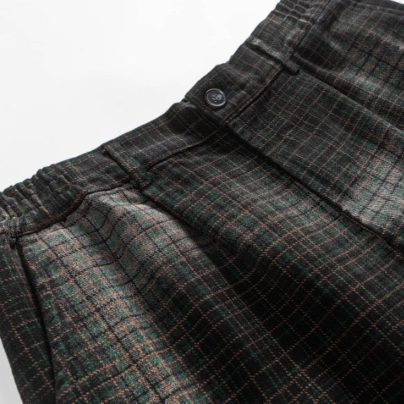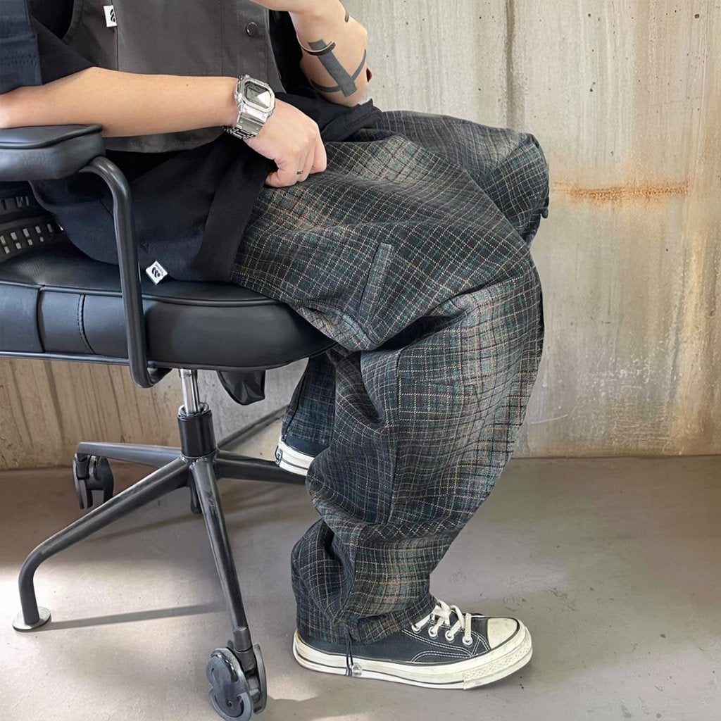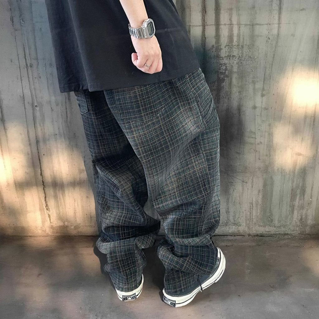 深みのあるダークトーンに細かなチェック柄をのせたルーズシルエットのパンツ。