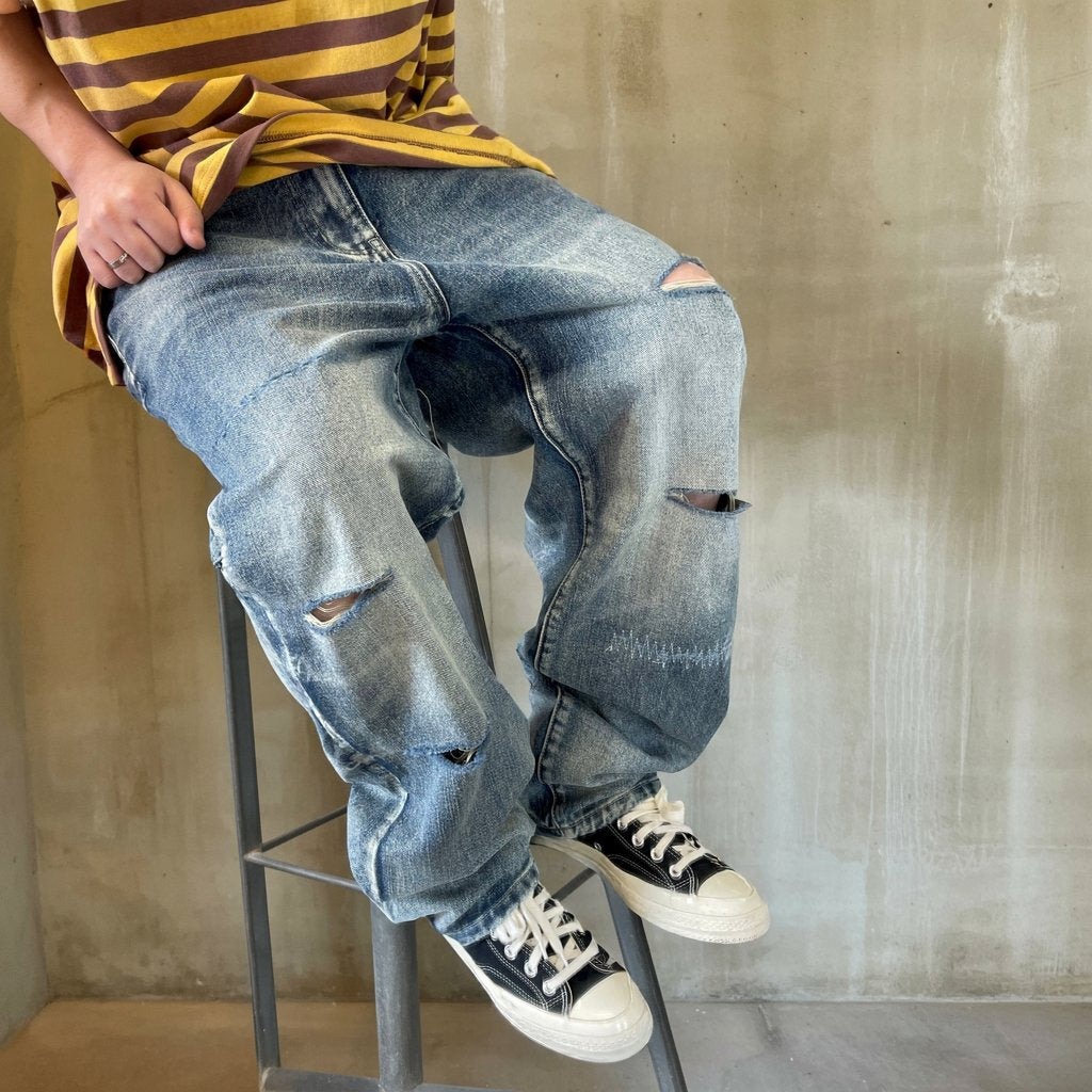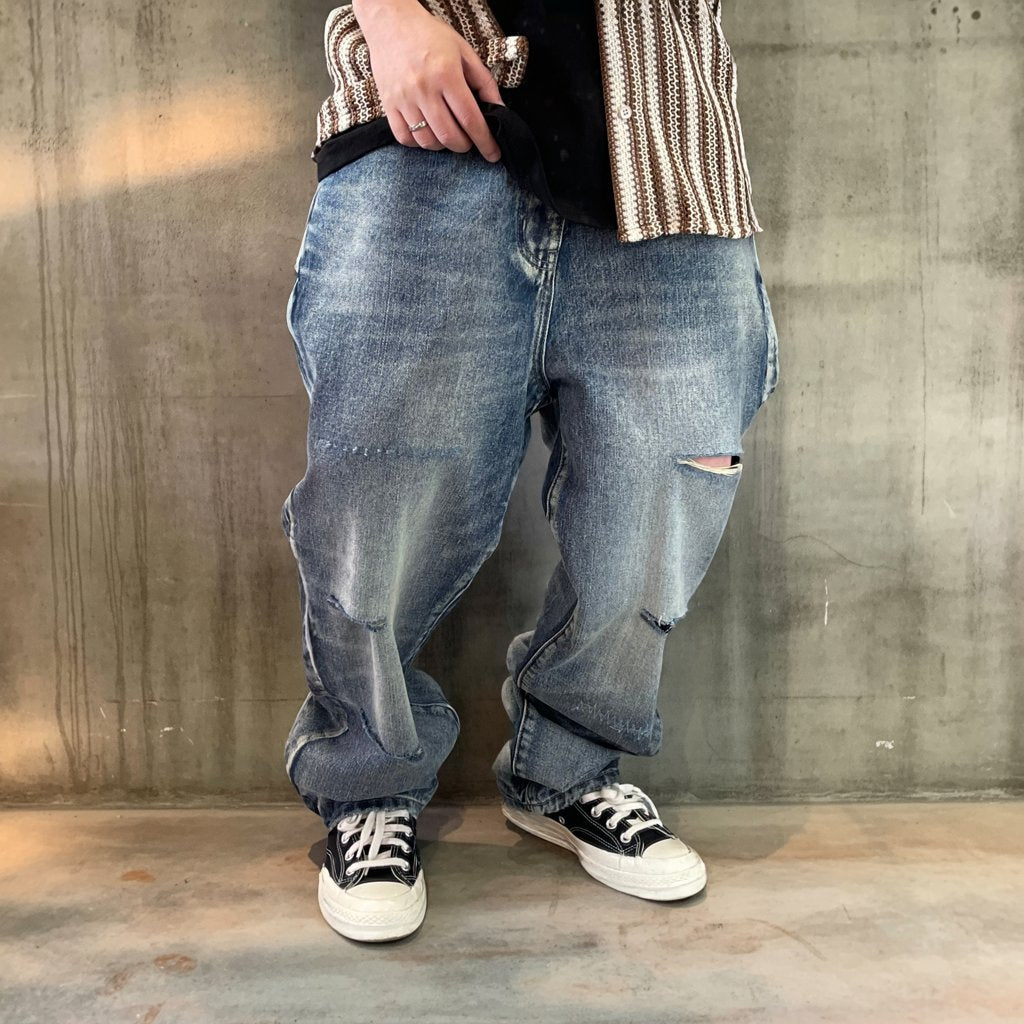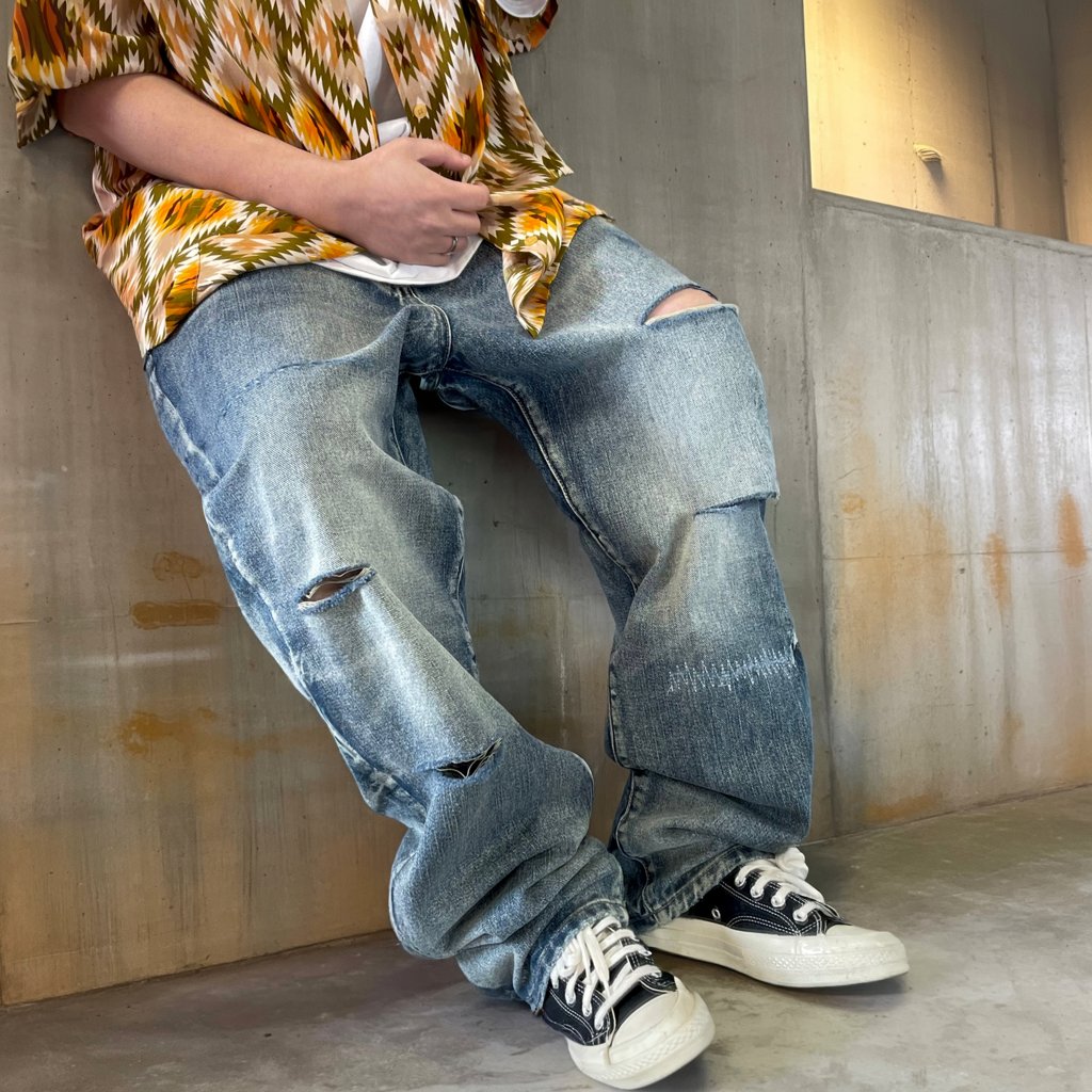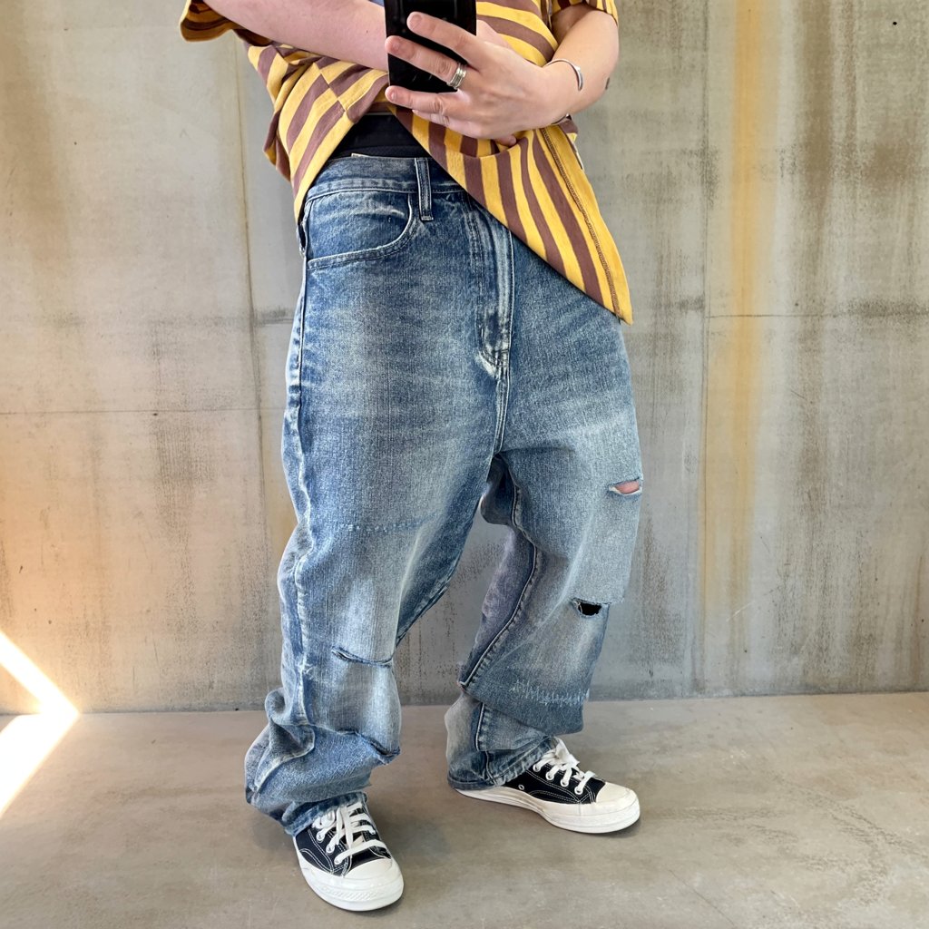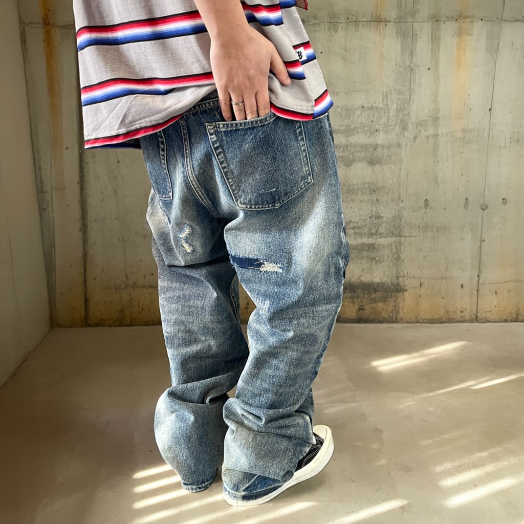 色落ち感のあるブルーデニムに、随所に施されたクラッシュ加工を組み合わせたワイドデニムパンツ。