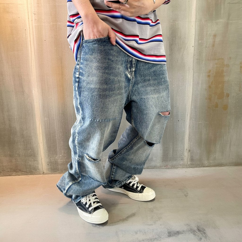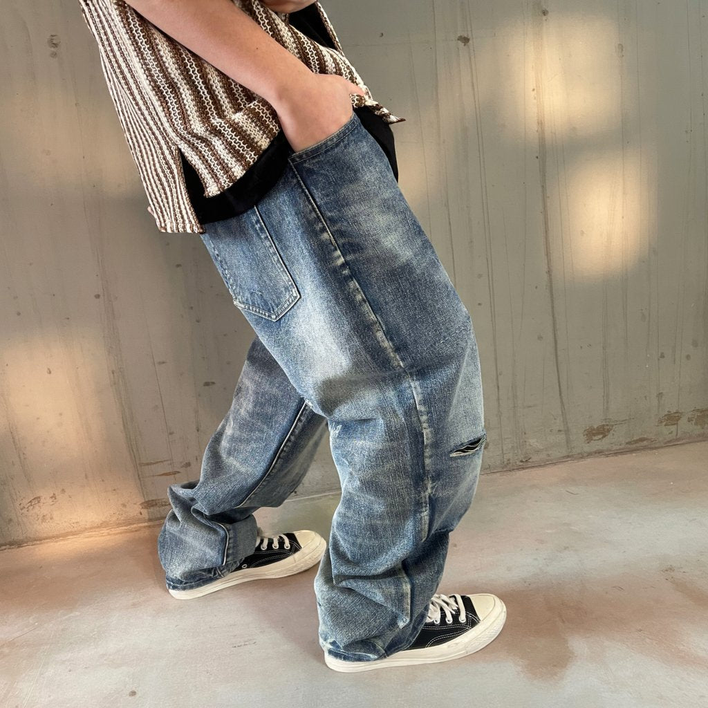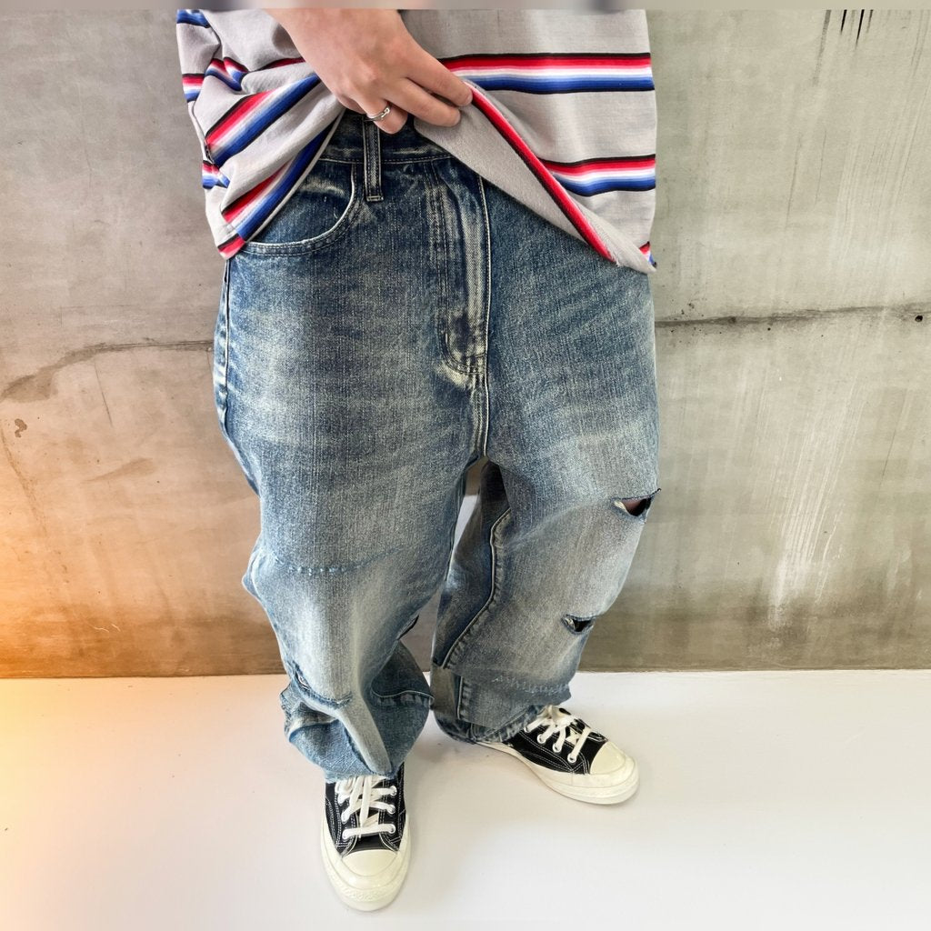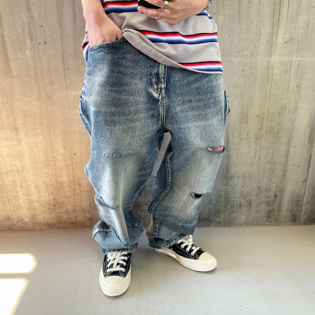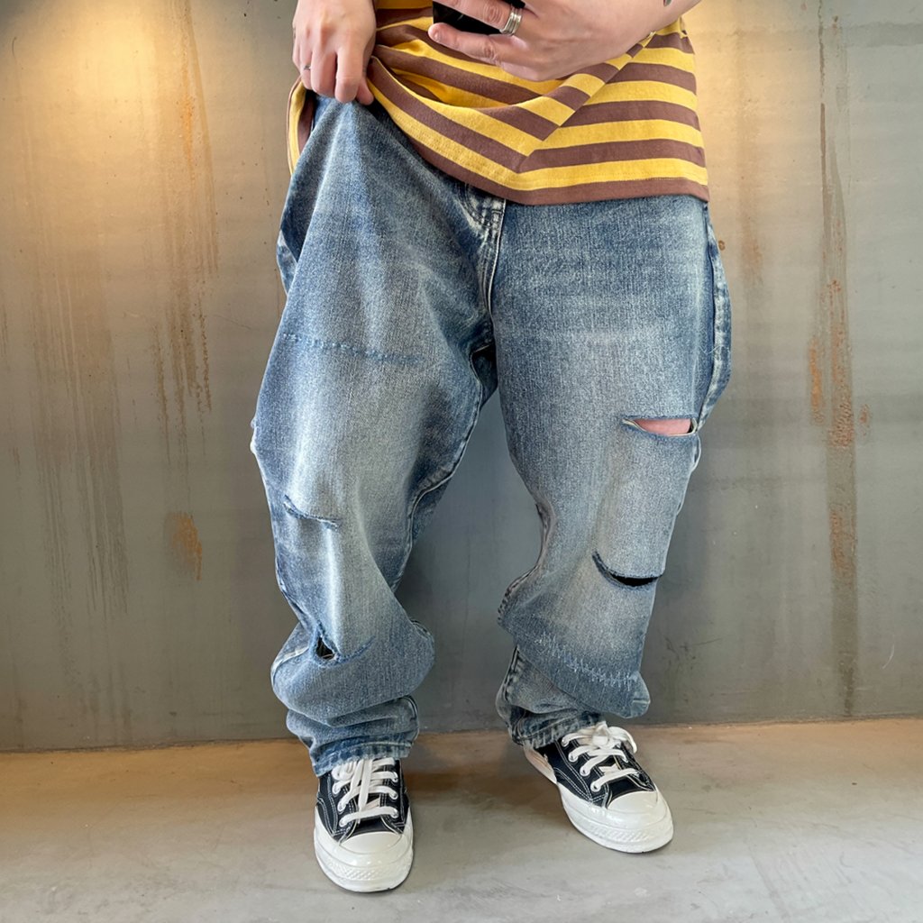 色落ち感のあるブルーデニムに、随所に施されたクラッシュ加工を組み合わせたワイドデニムパンツ。