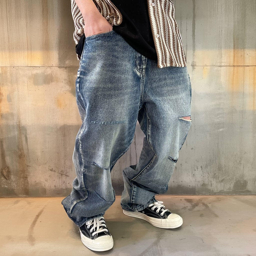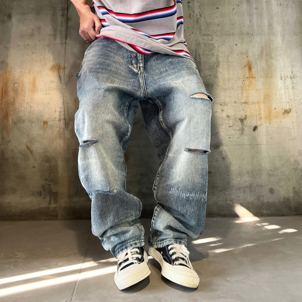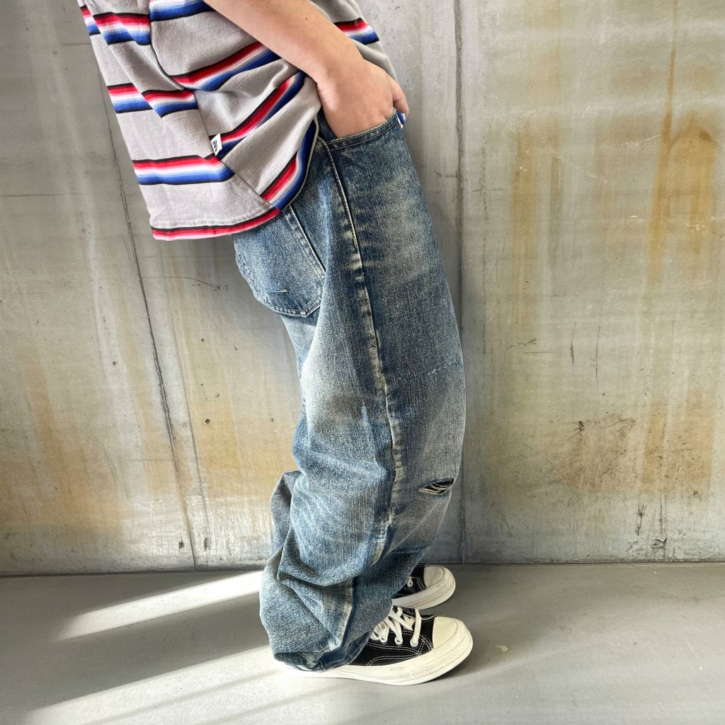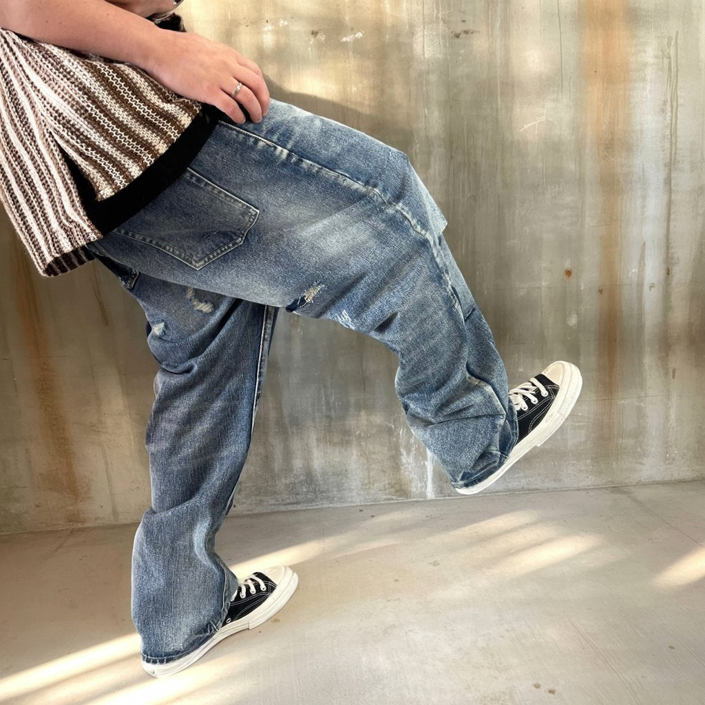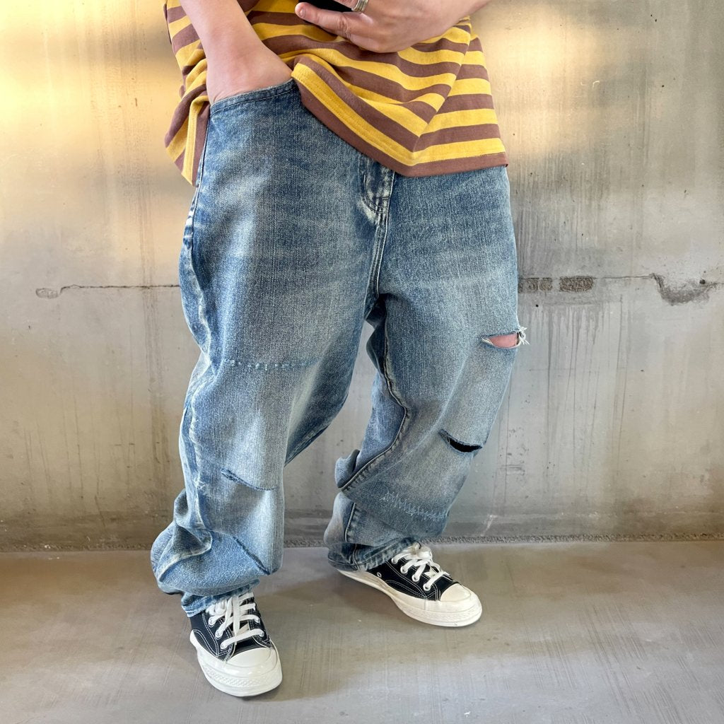 色落ち感のあるブルーデニムに、随所に施されたクラッシュ加工を組み合わせたワイドデニムパンツ。