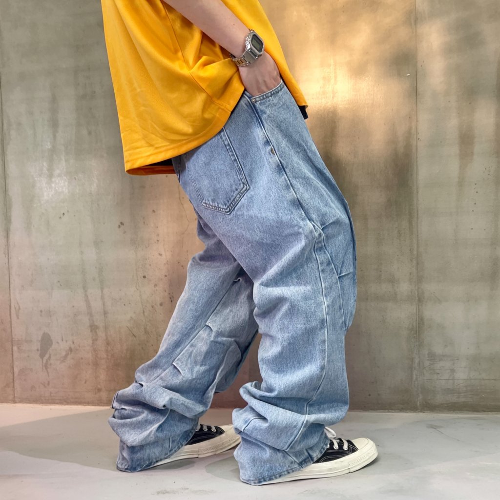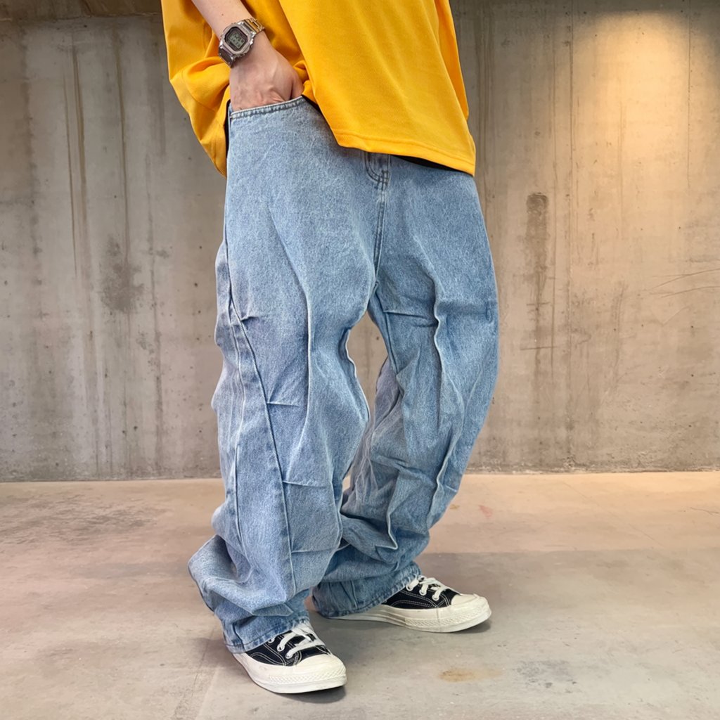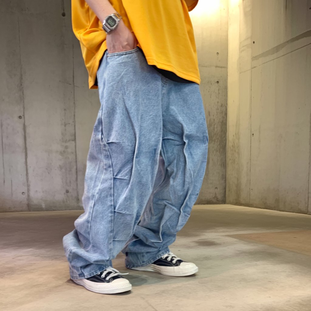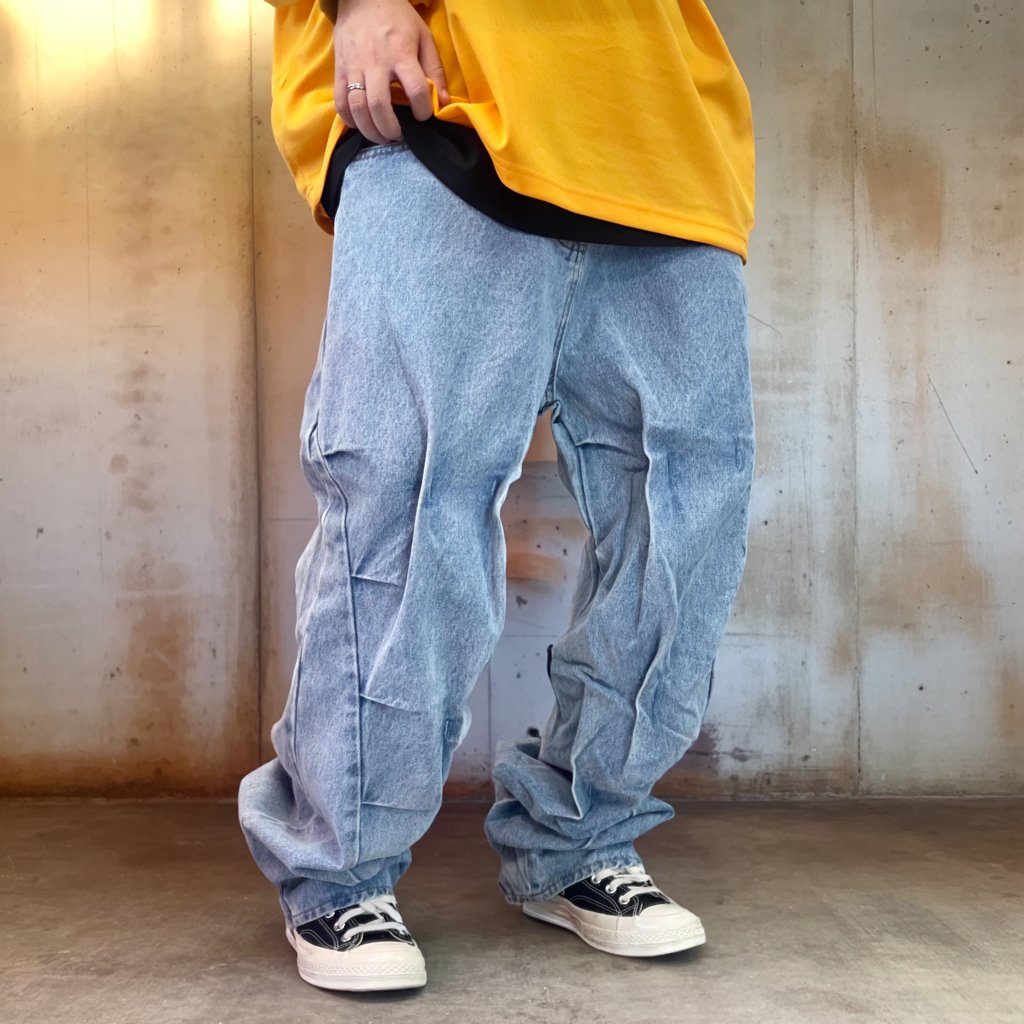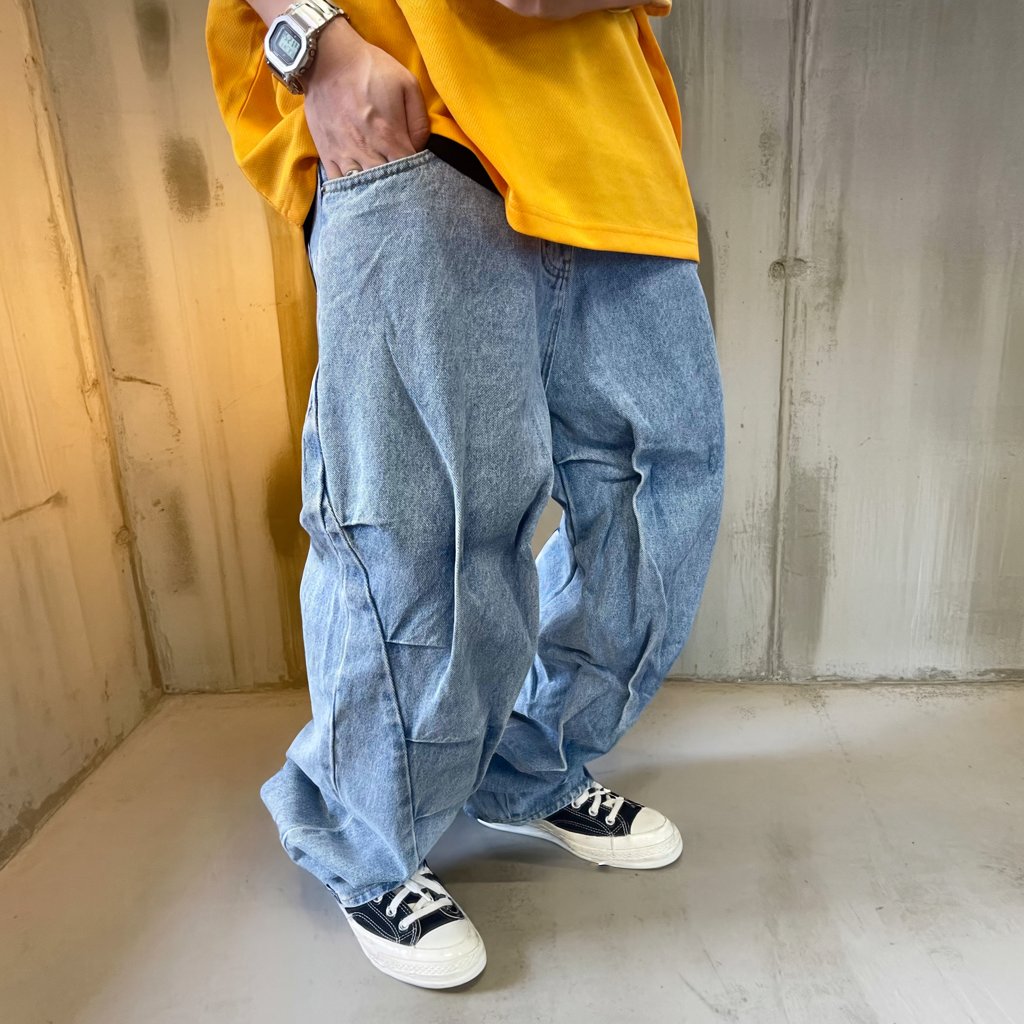 ライトブルーのデニムを使用した、ワイドシルエットのルーズフィットパンツ。