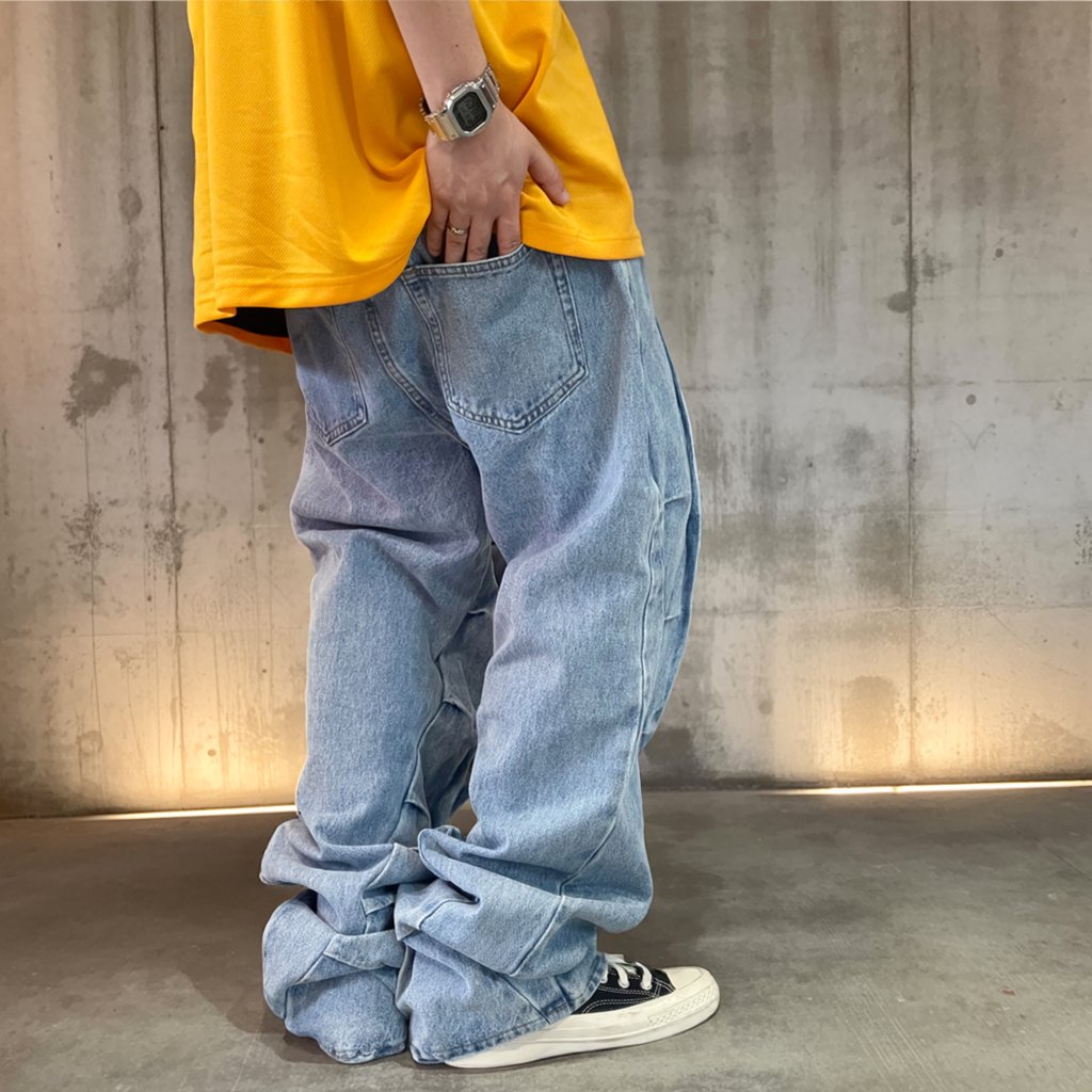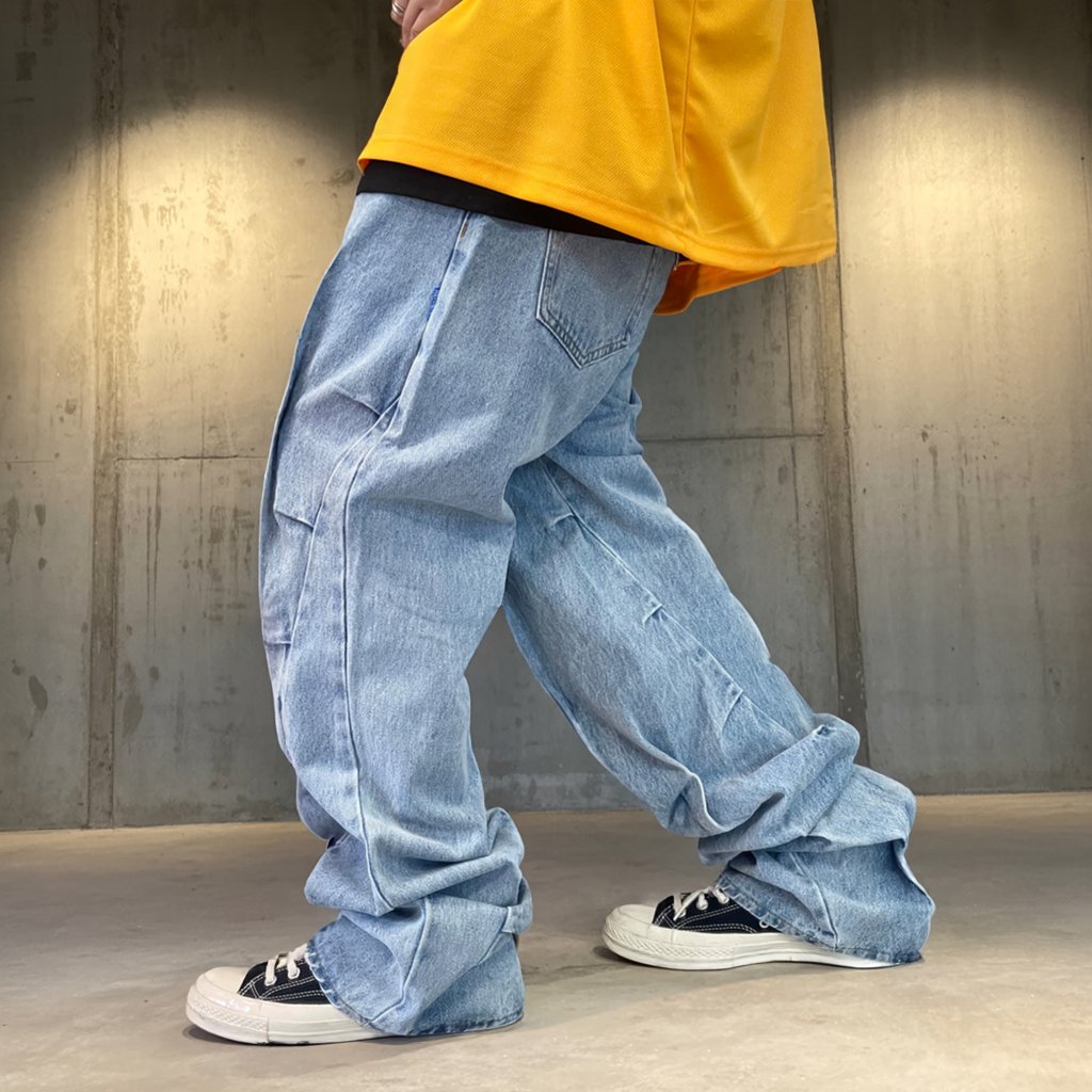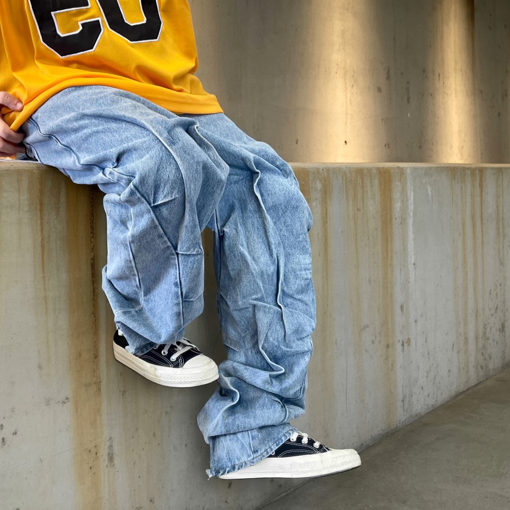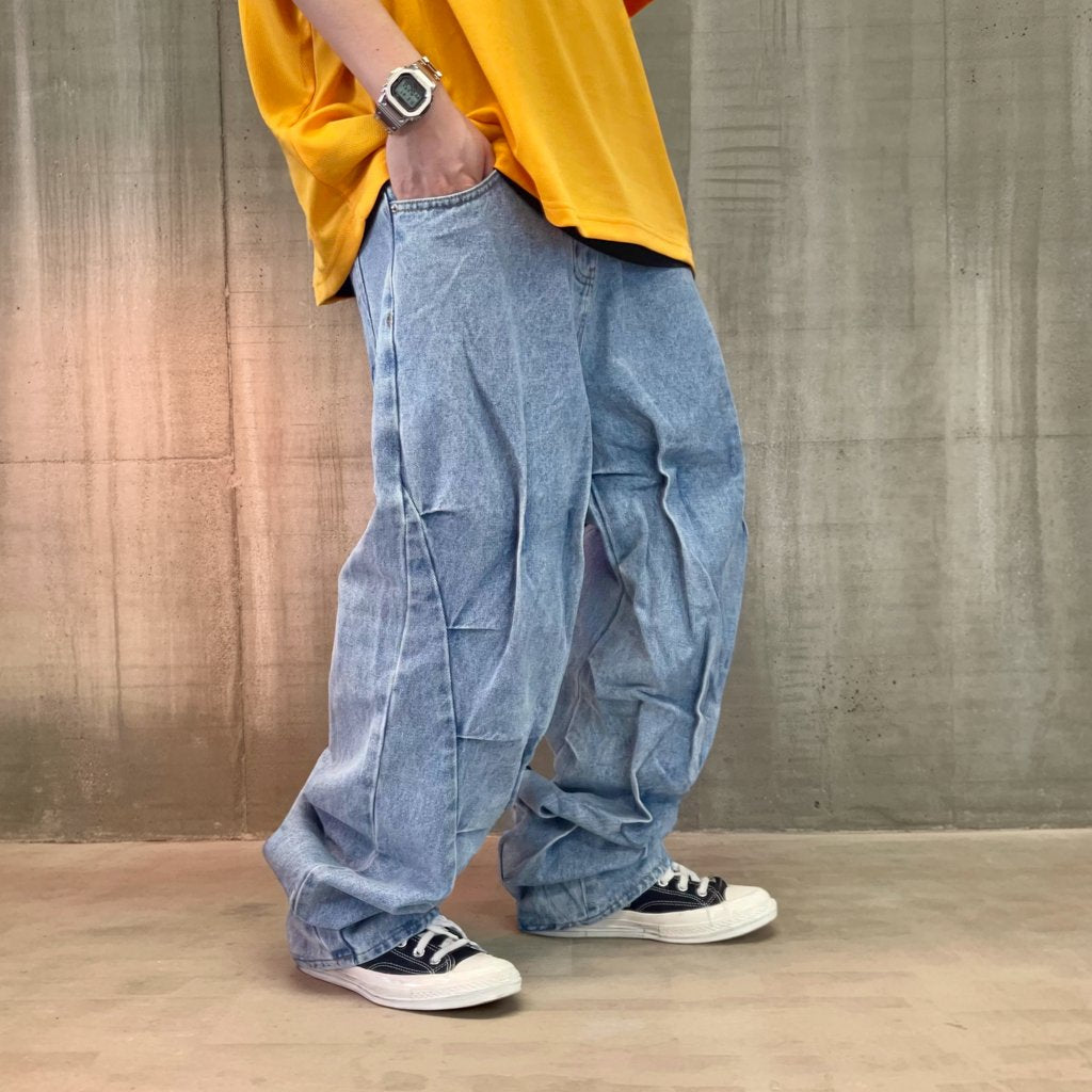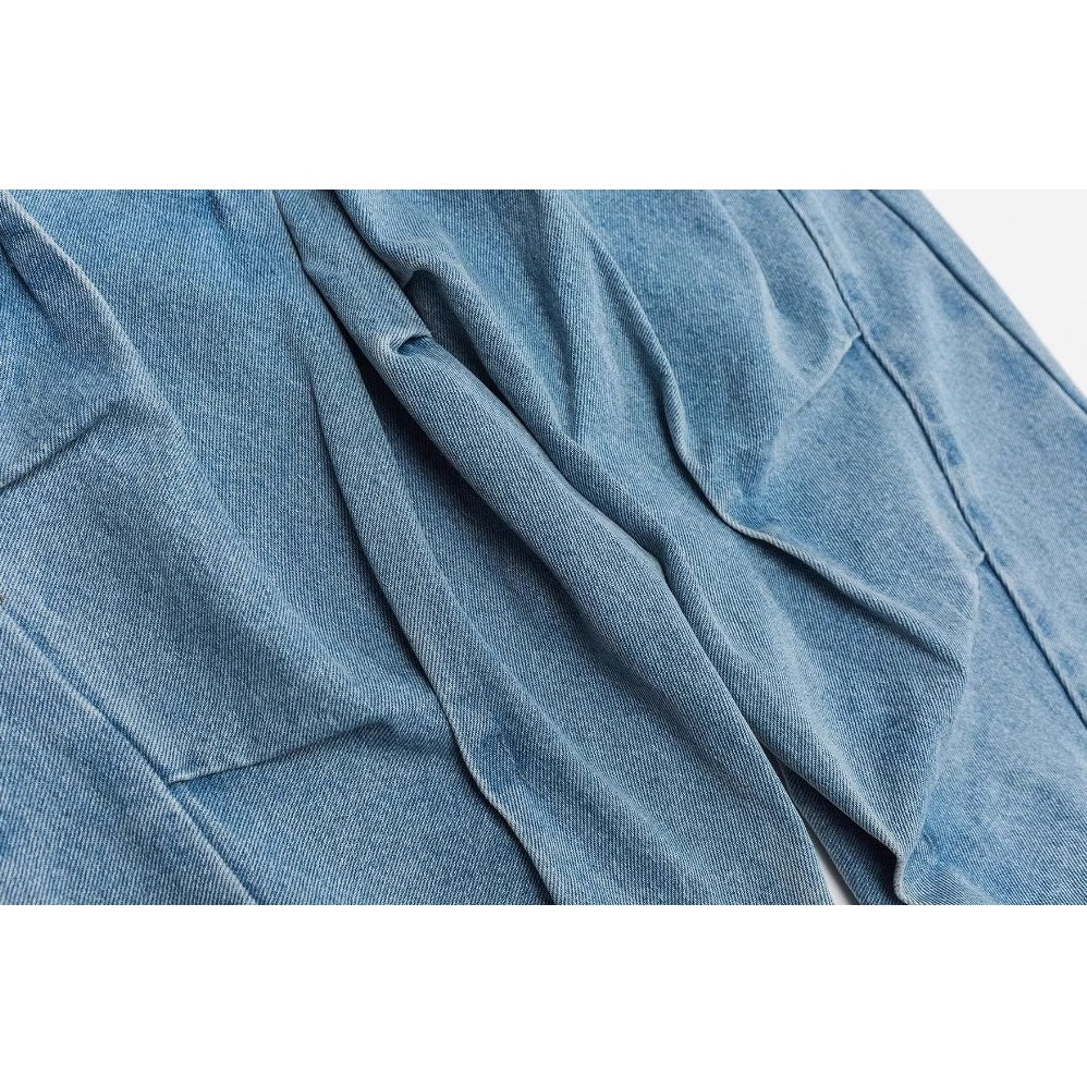 ライトブルーのデニムを使用した、ワイドシルエットのルーズフィットパンツ。