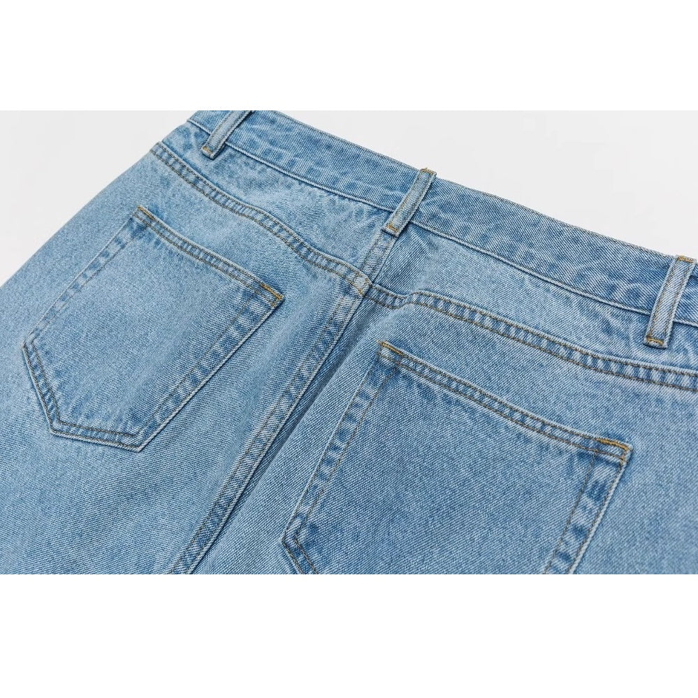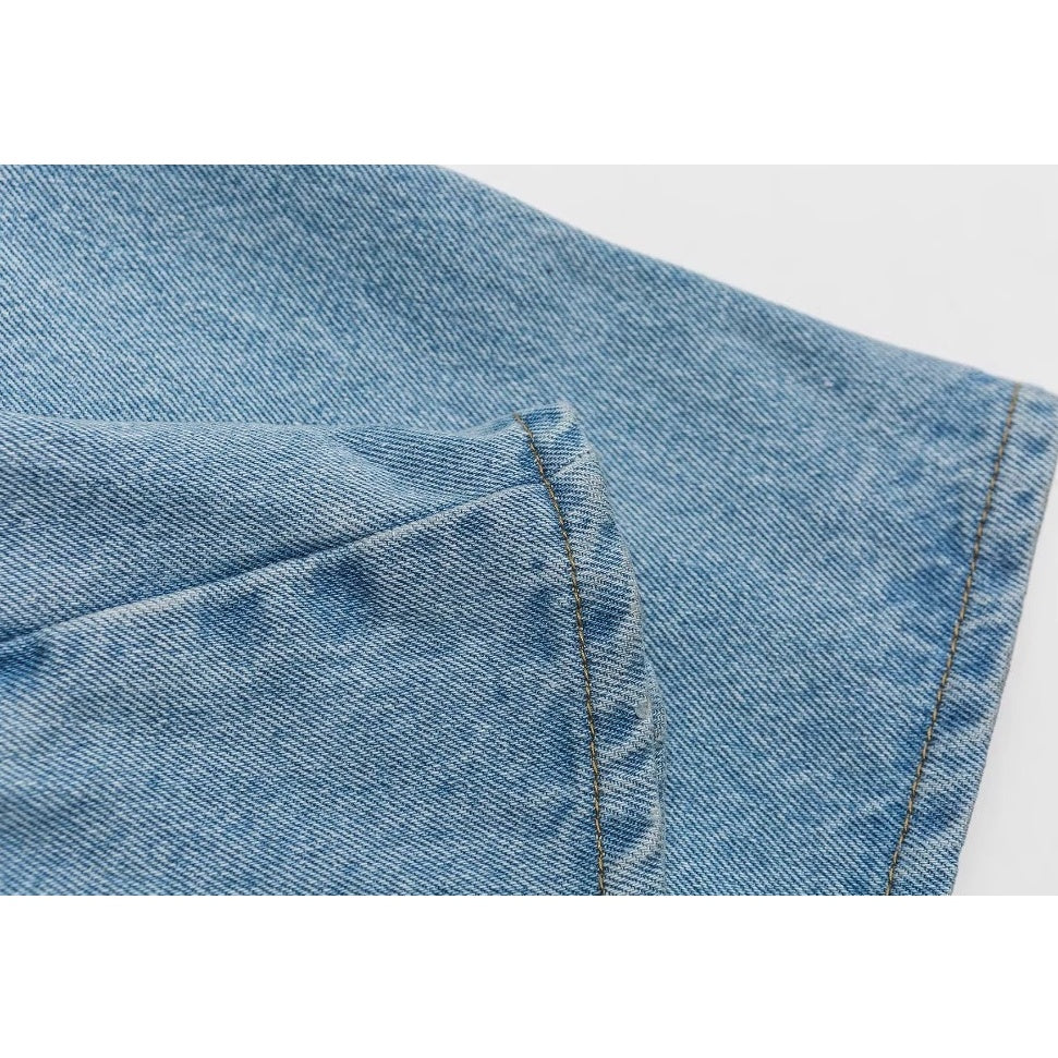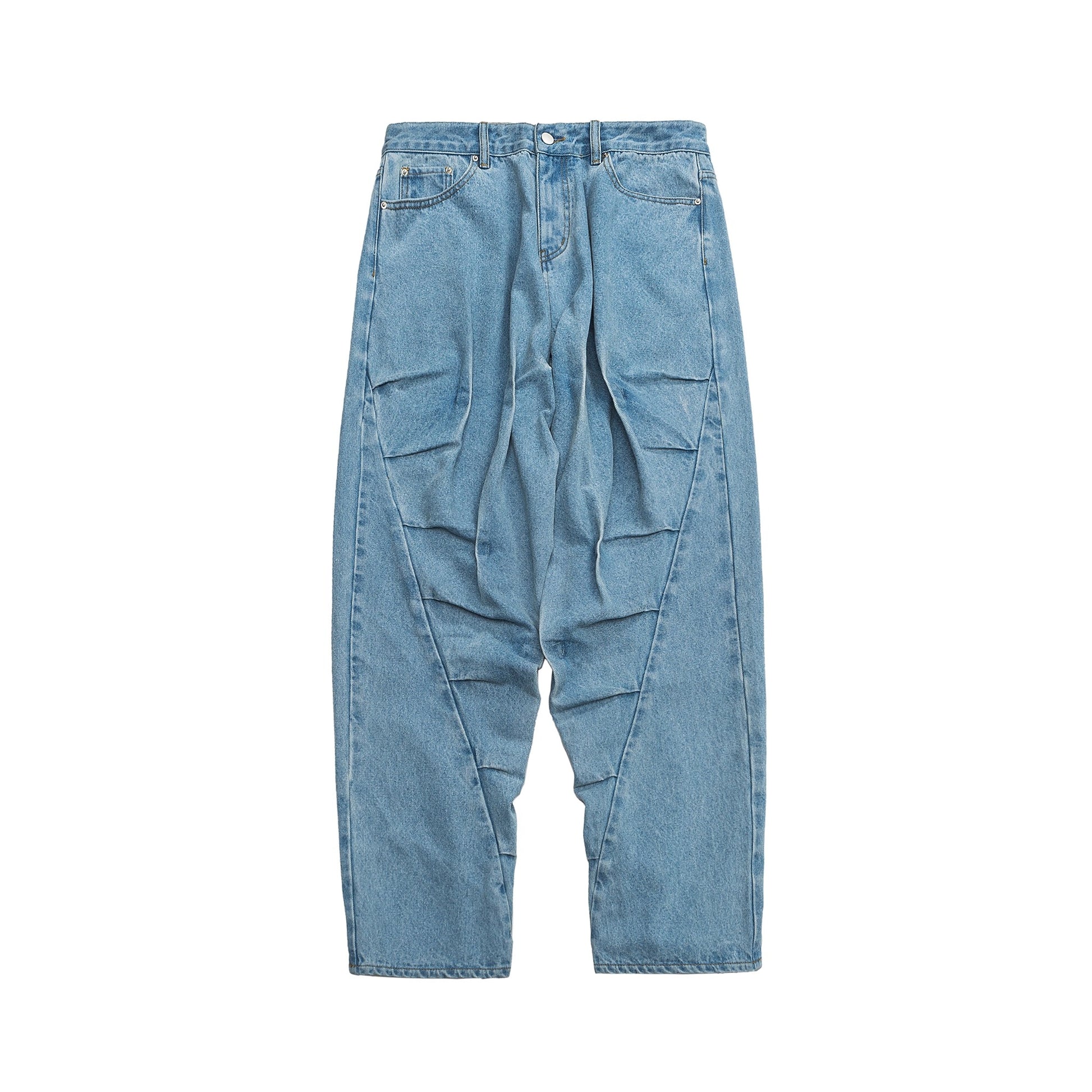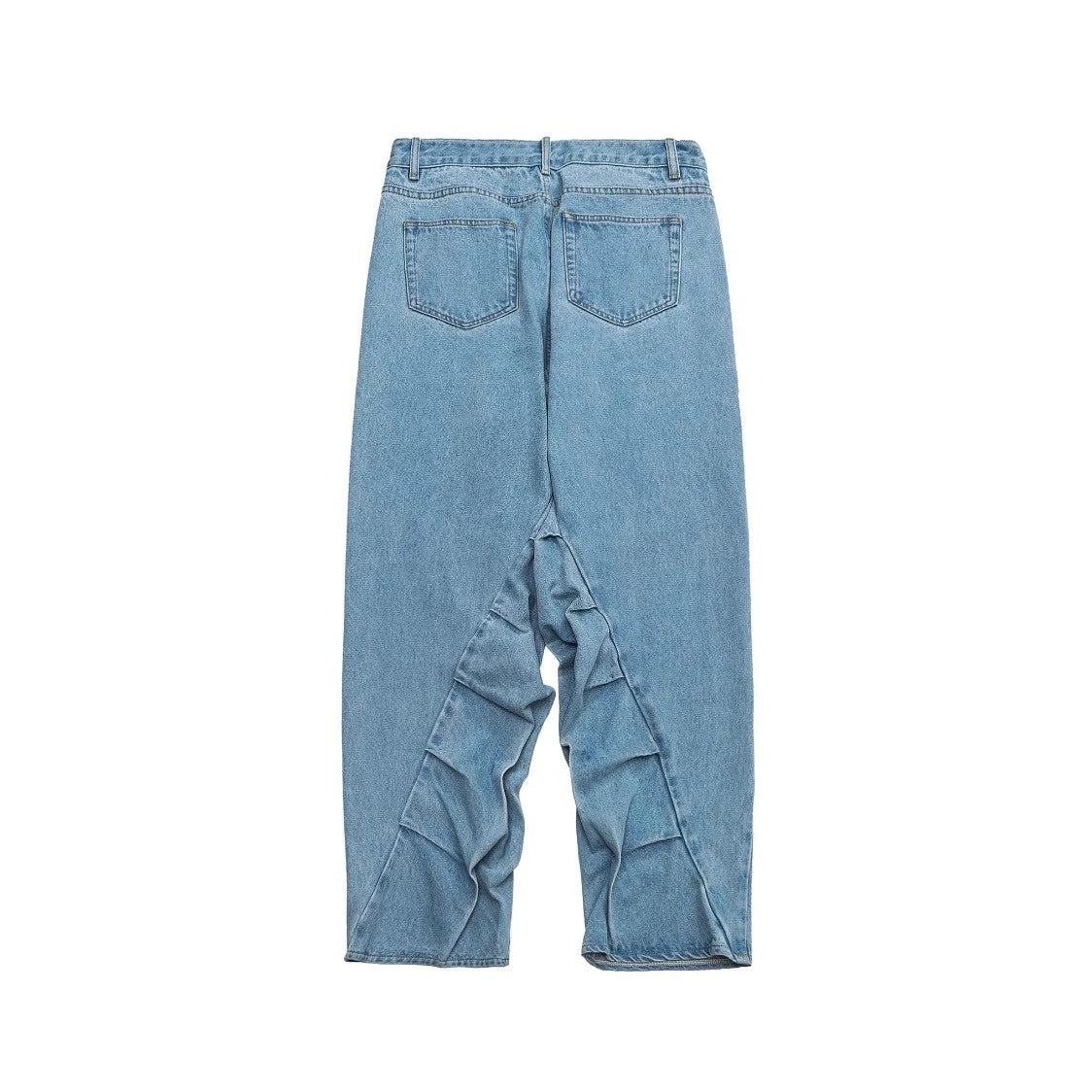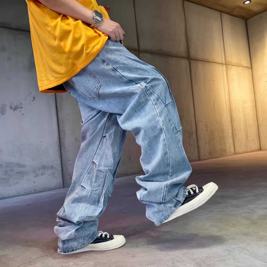 ライトブルーのデニムを使用した、ワイドシルエットのルーズフィットパンツ。