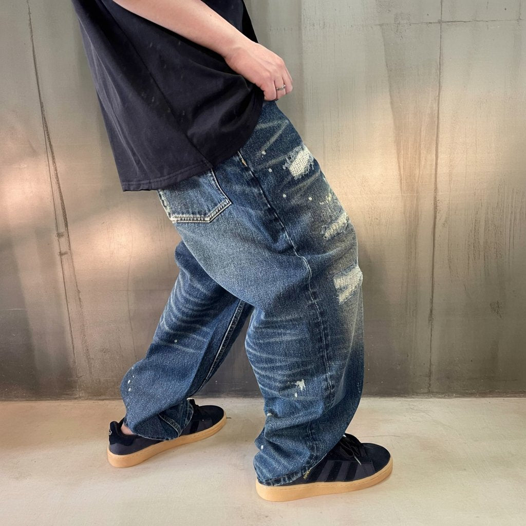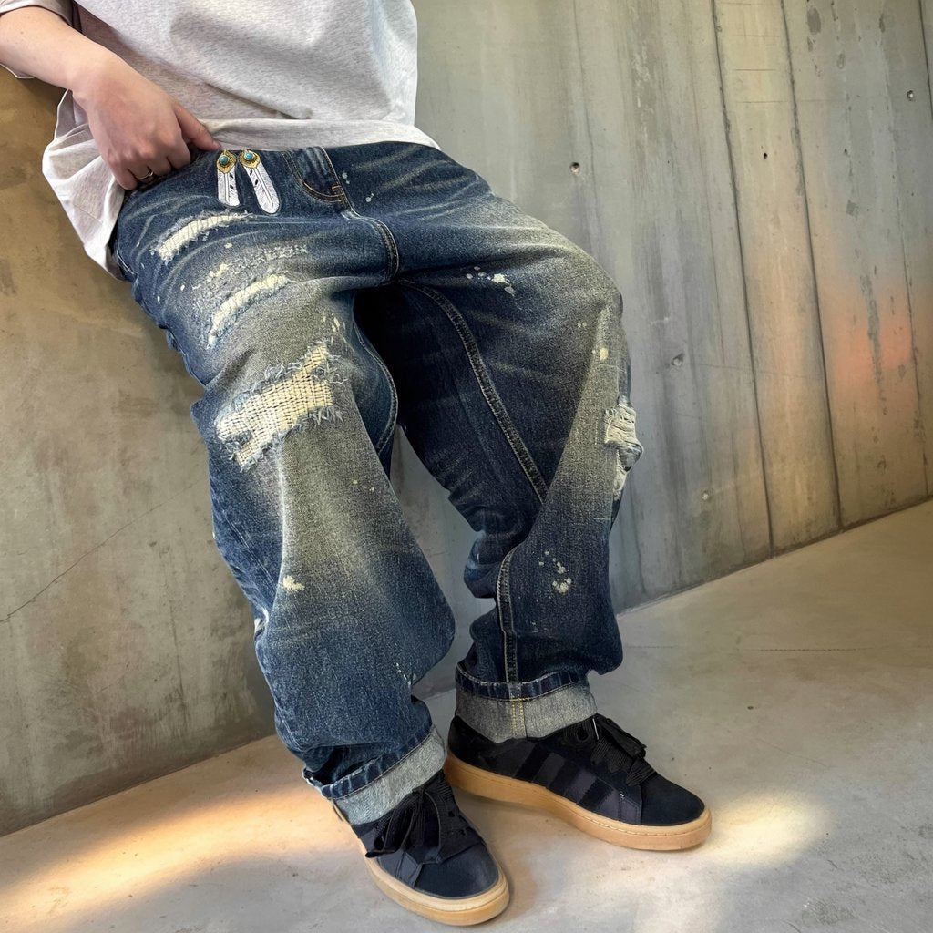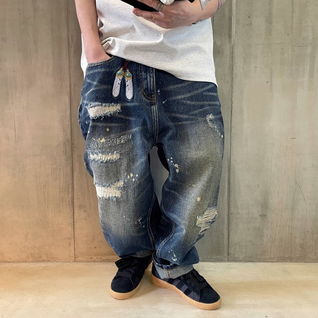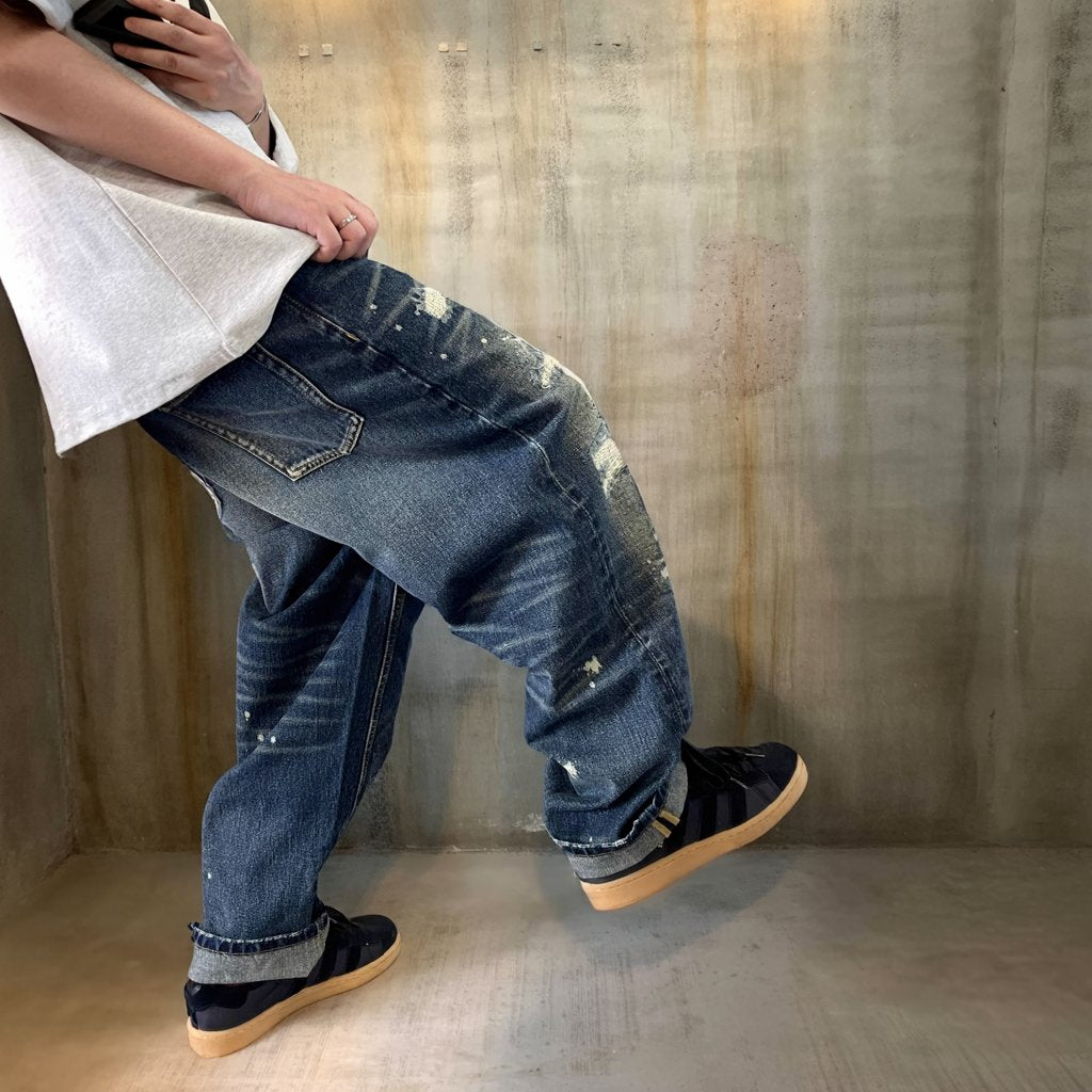 ダークトーンのブルーデニムに、クラッシュとペイント加工を施したワイドシルエットパンツ。