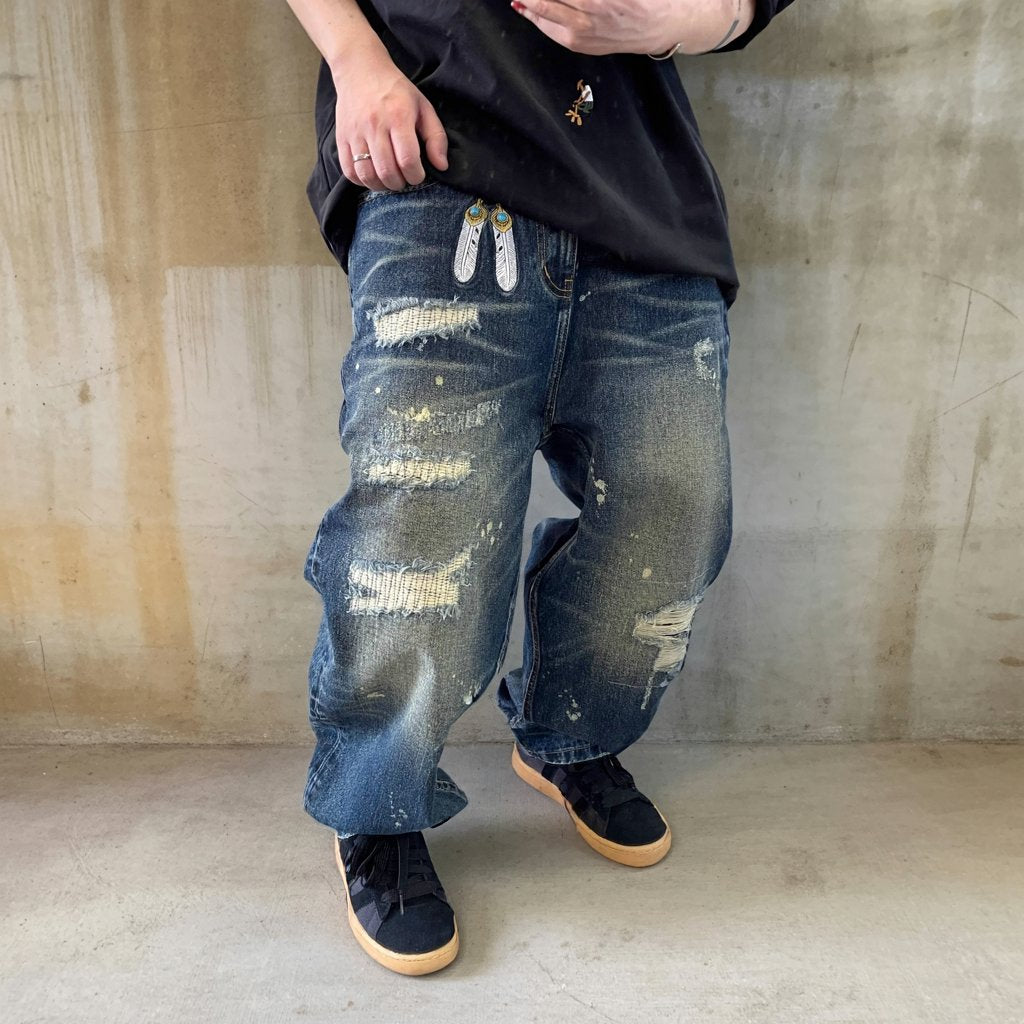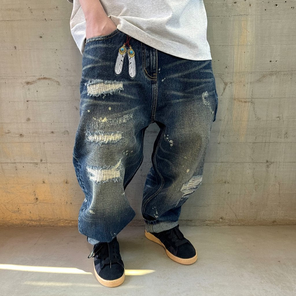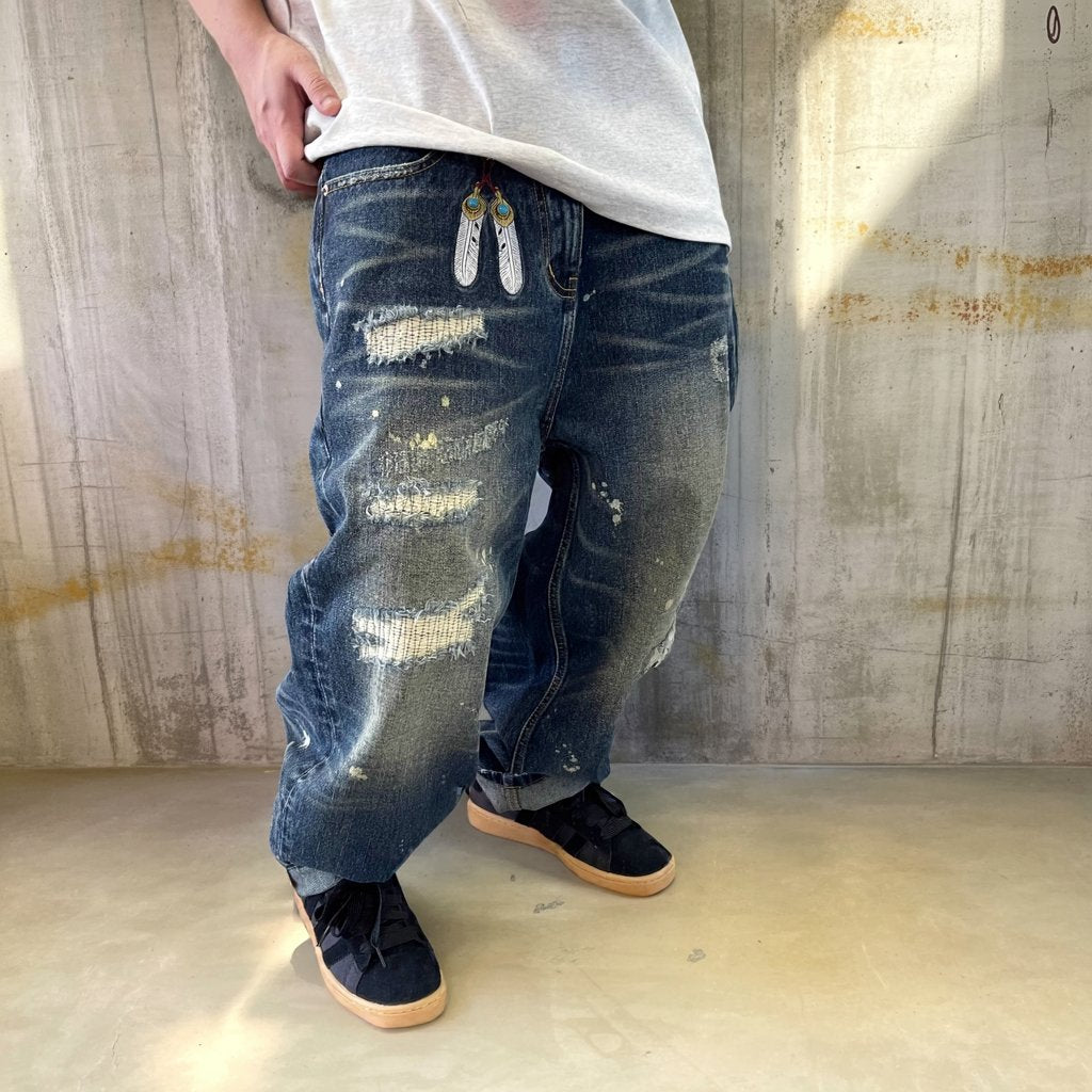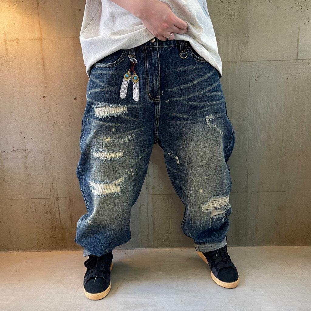 ダークトーンのブルーデニムに、クラッシュとペイント加工を施したワイドシルエットパンツ。