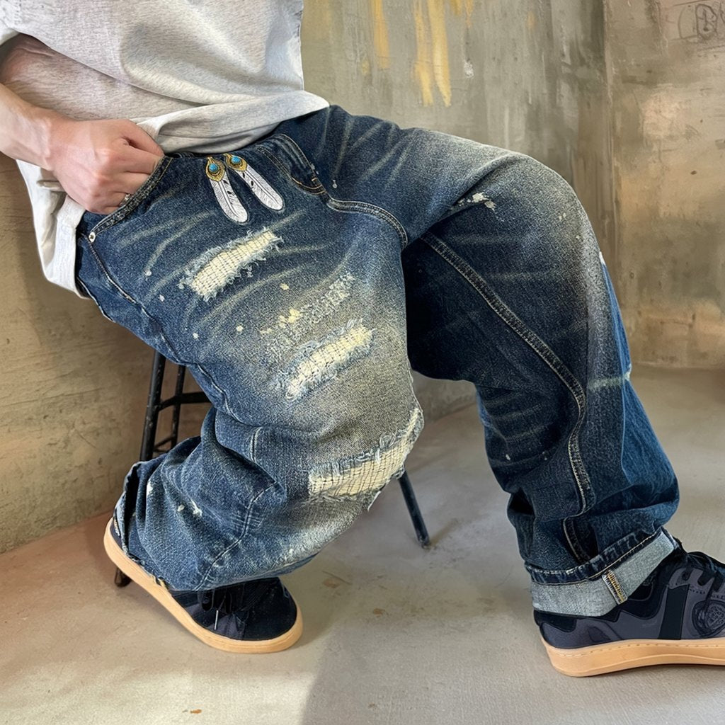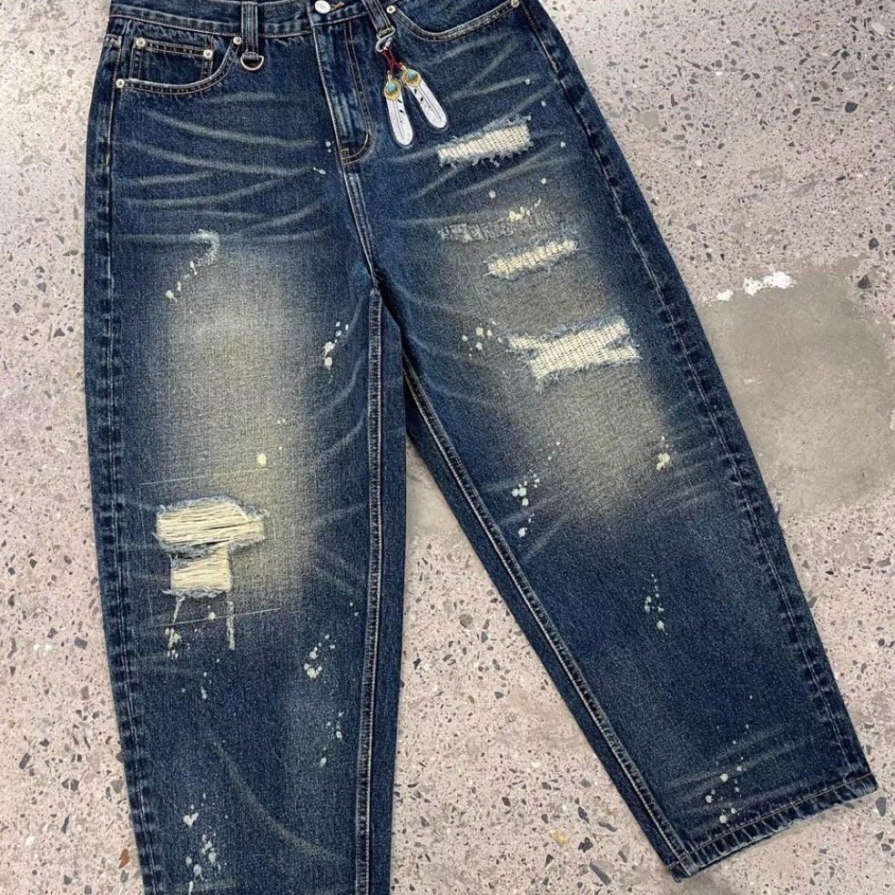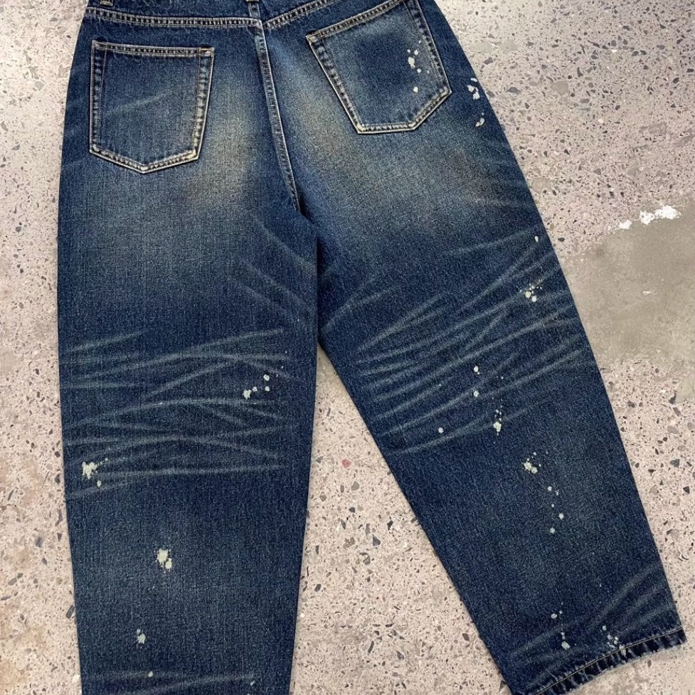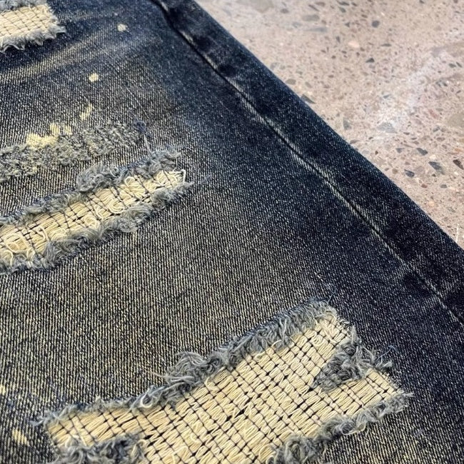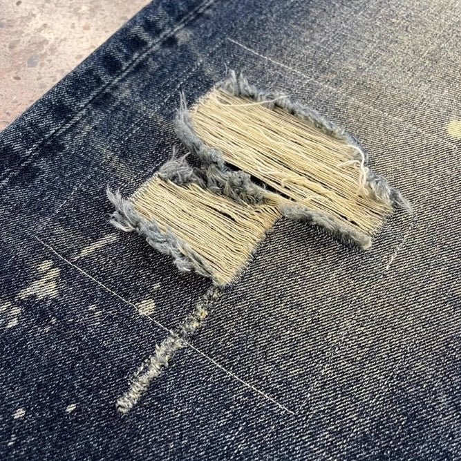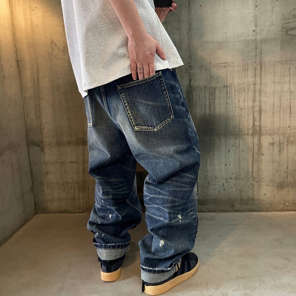 ダークトーンのブルーデニムに、クラッシュとペイント加工を施したワイドシルエットパンツ。