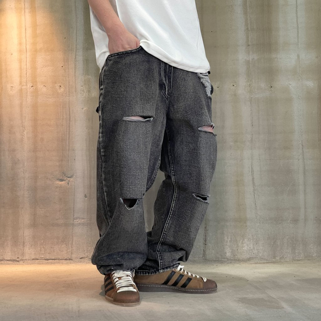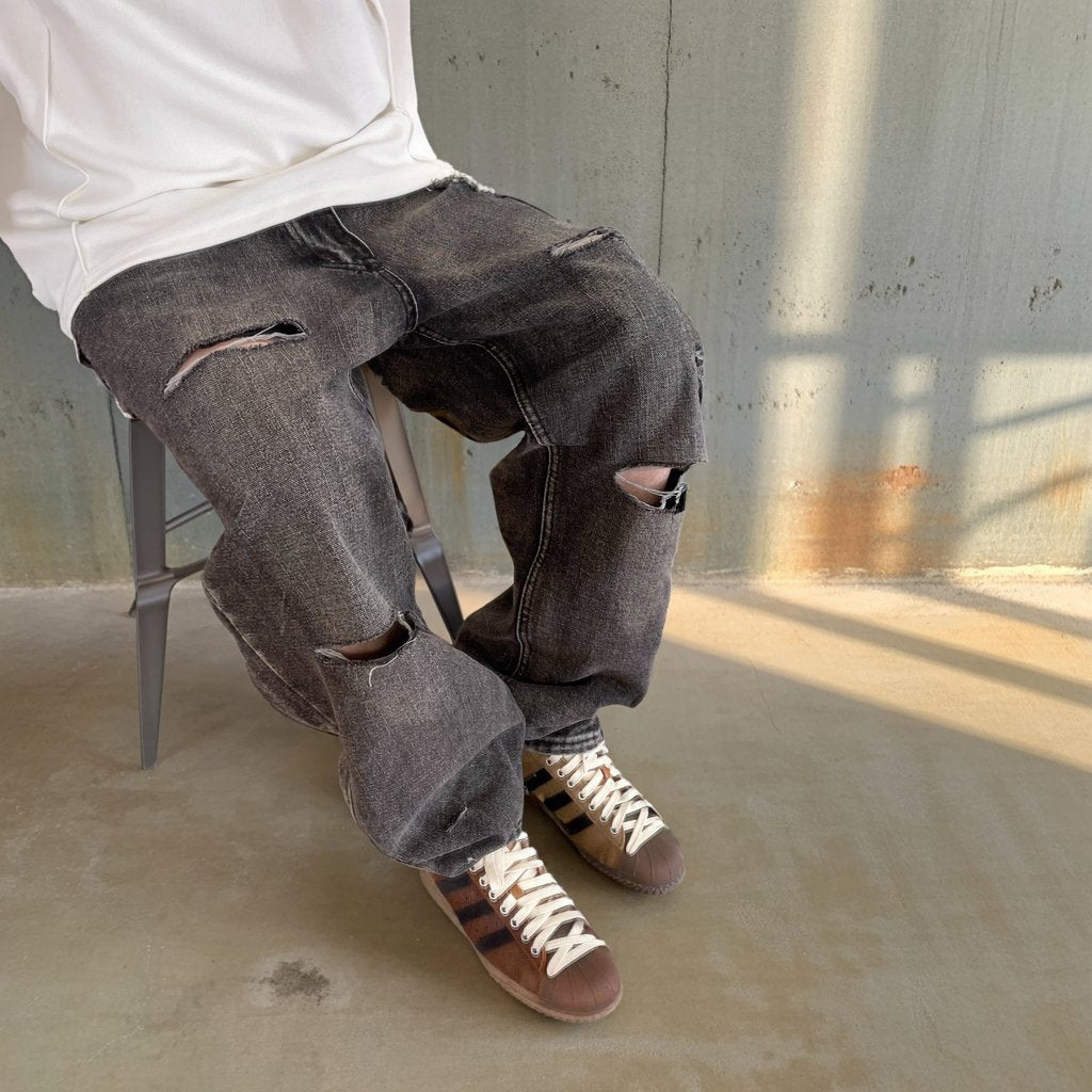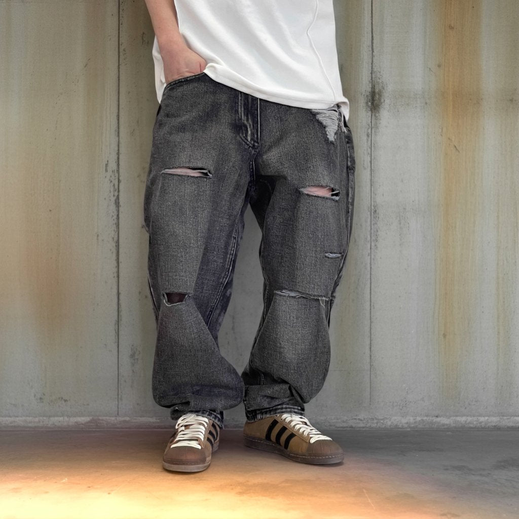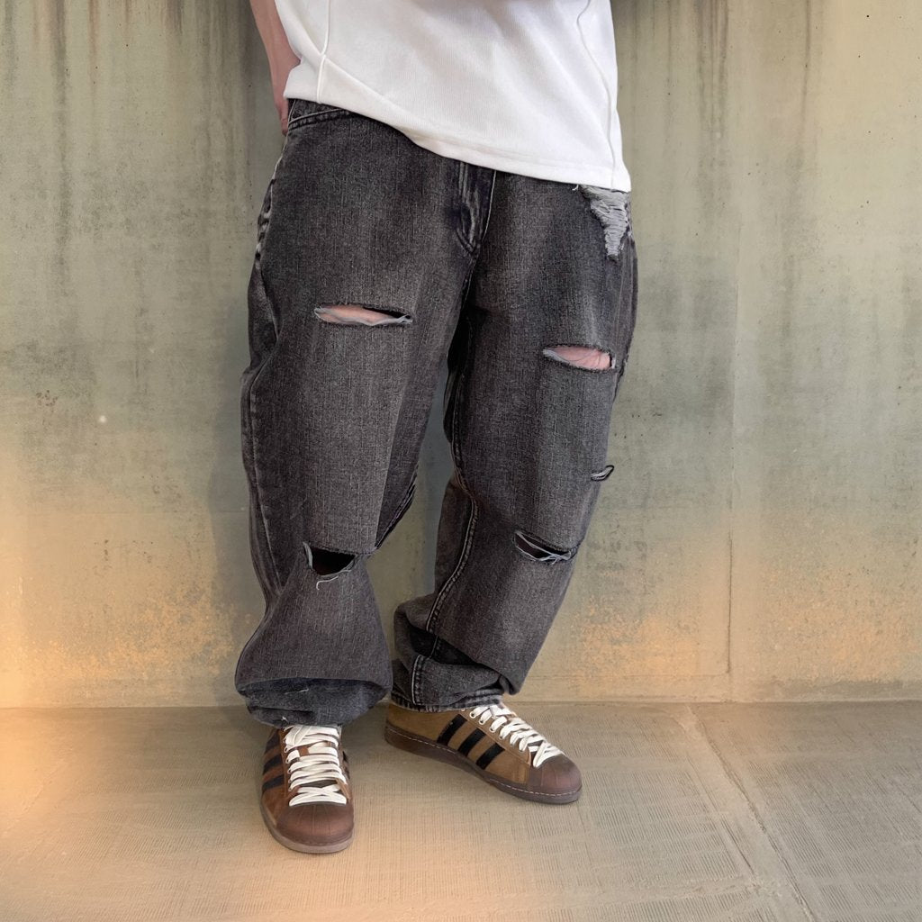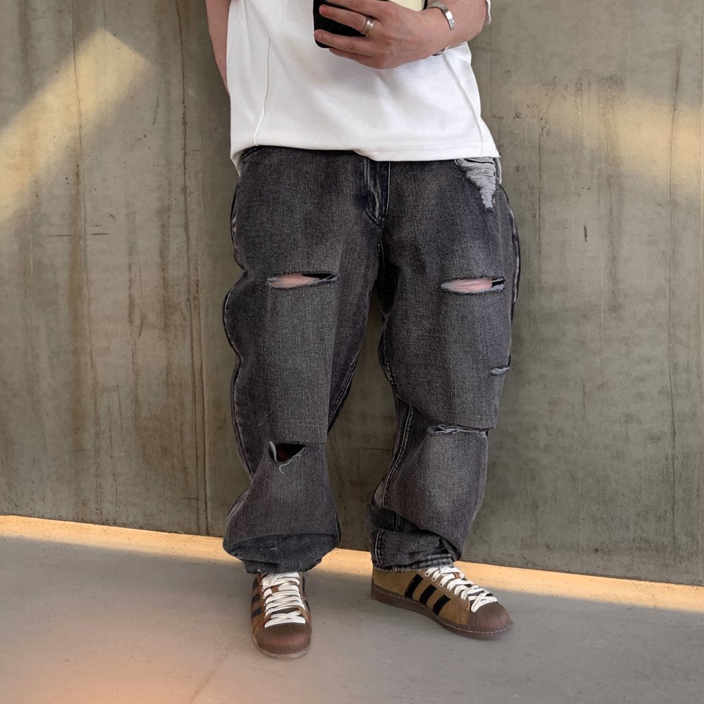 ブラックグレーのデニムに、大胆なダメージとウォッシュ加工を施したワイドシルエットパンツ。