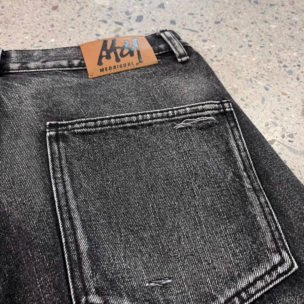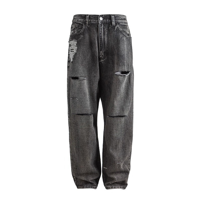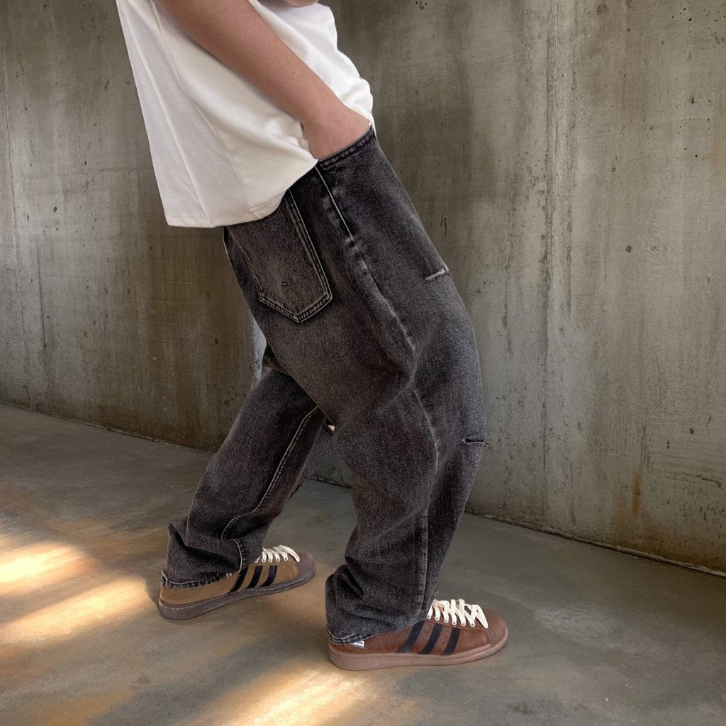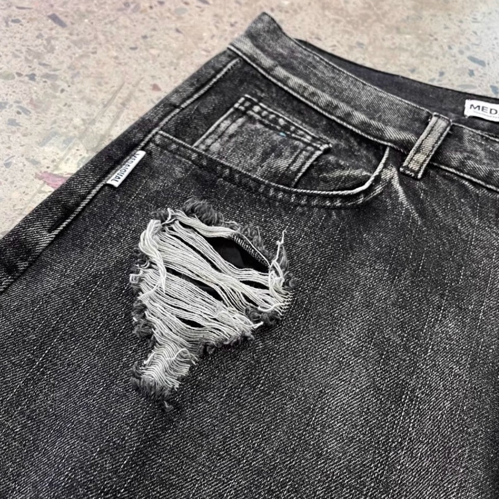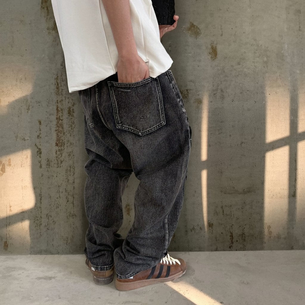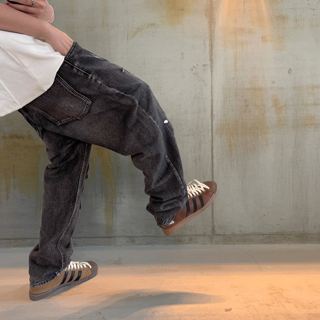 ブラックグレーのデニムに、大胆なダメージとウォッシュ加工を施したワイドシルエットパンツ。