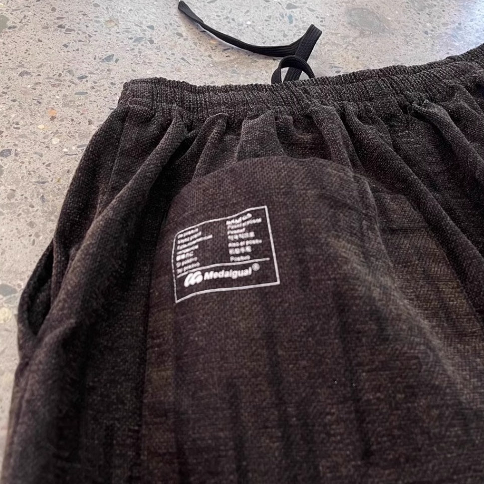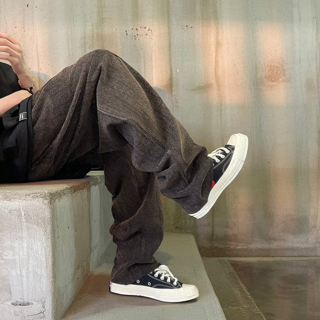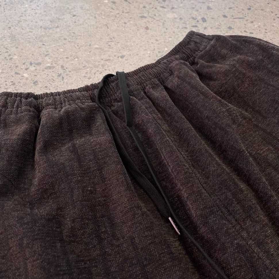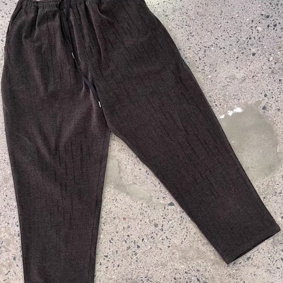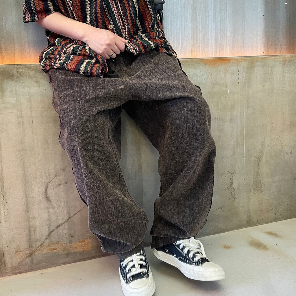 深みのあるダークブラウンをベースに、さりげない縦模様が織り込まれたワイドパンツ。