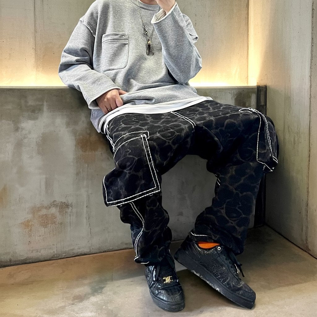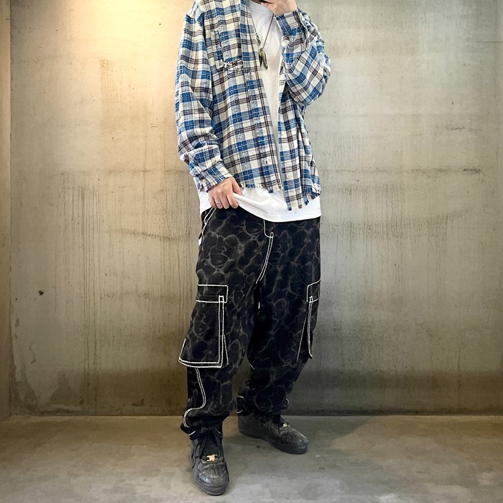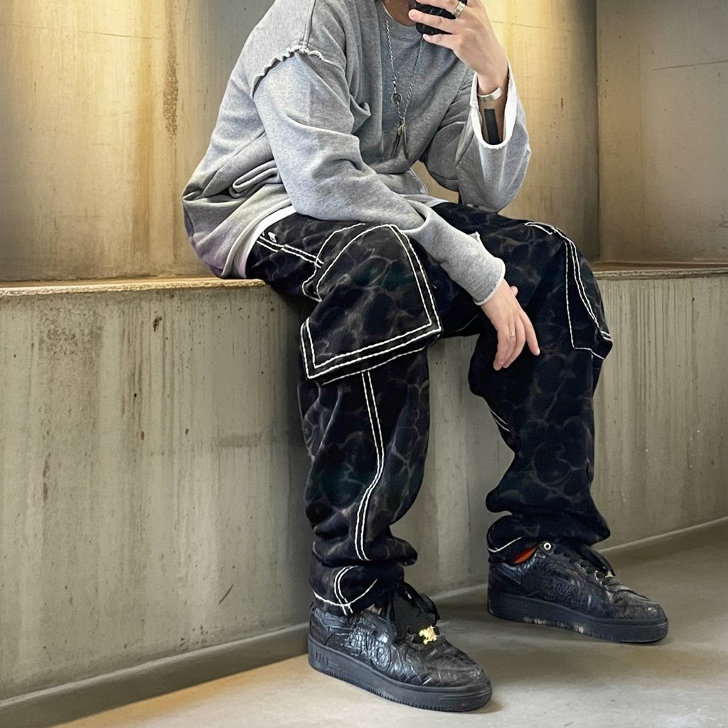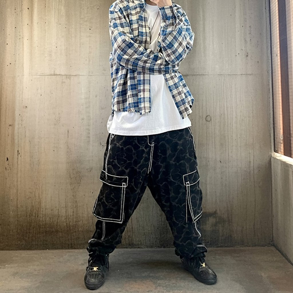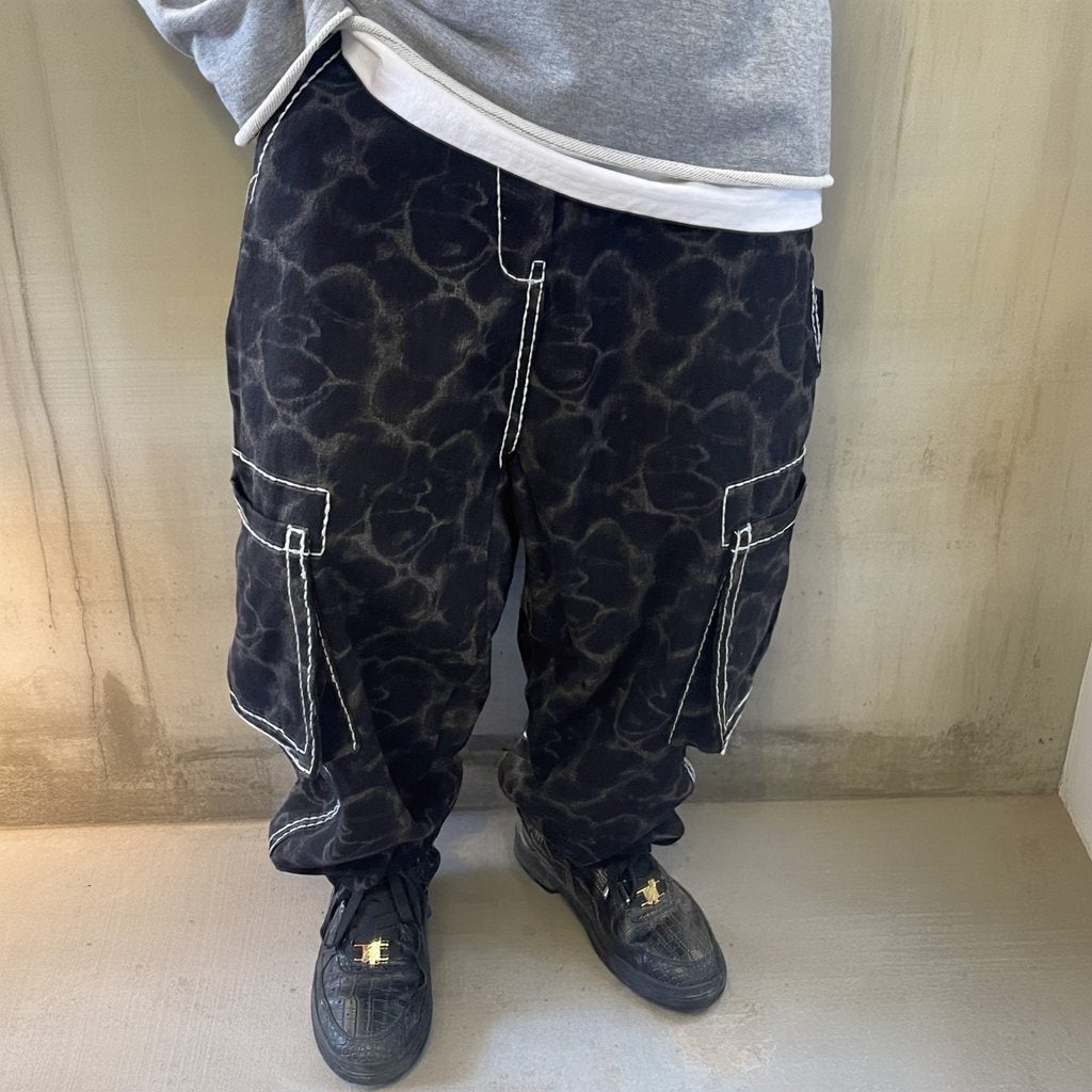 ブラックベースに淡い模様をのせ、ホワイトのコントラストステッチを効かせたカーゴパンツ。