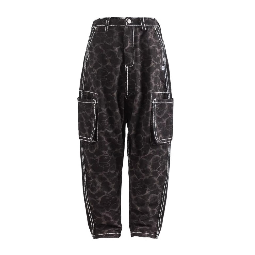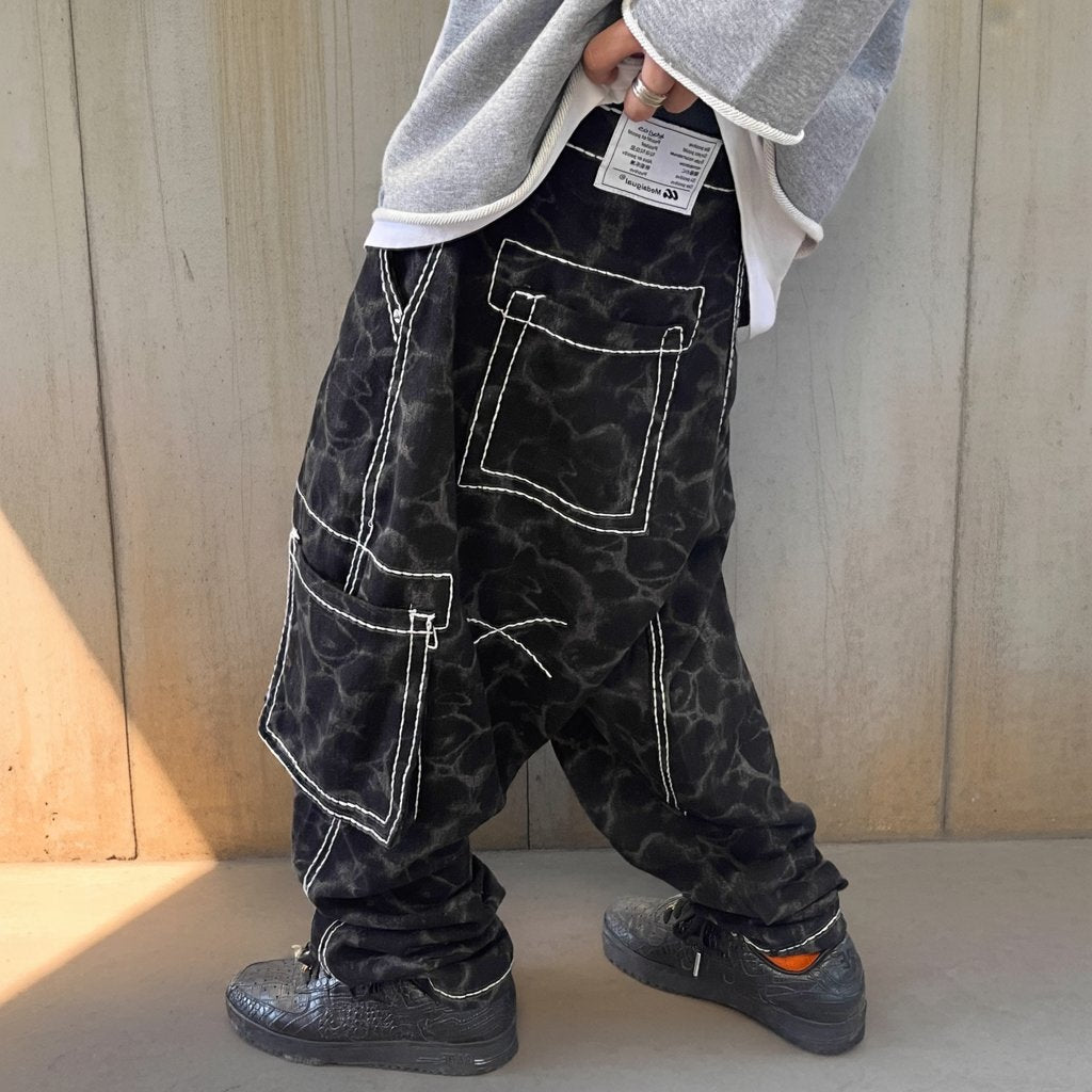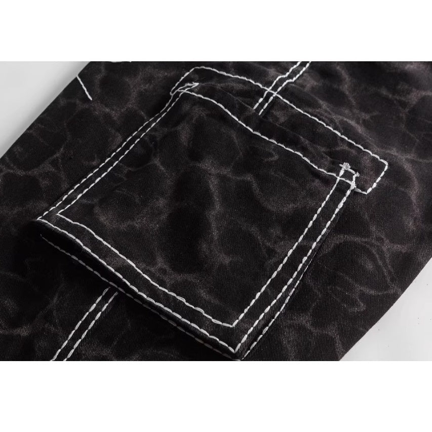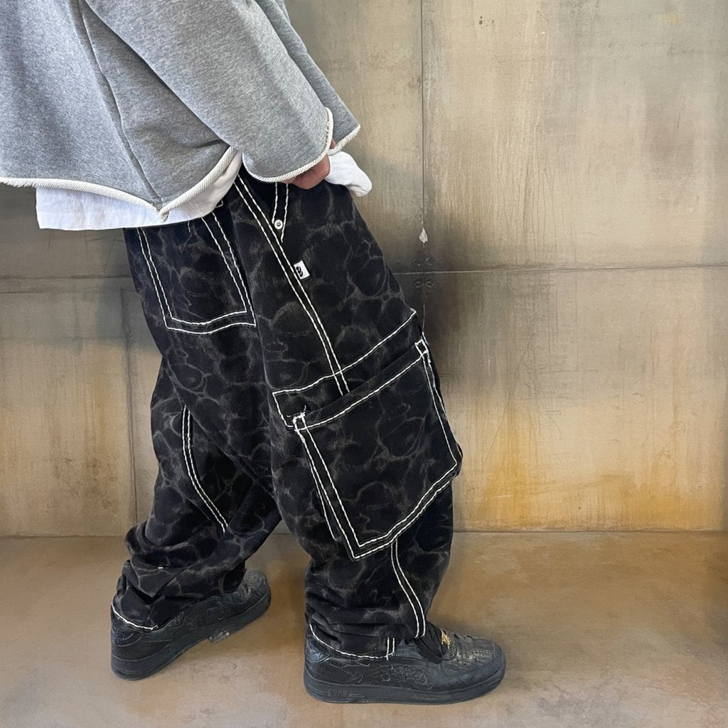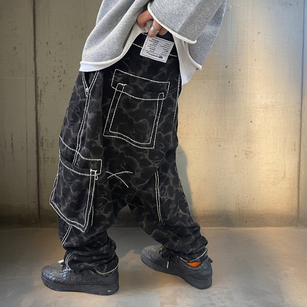 ブラックベースに淡い模様をのせ、ホワイトのコントラストステッチを効かせたカーゴパンツ。