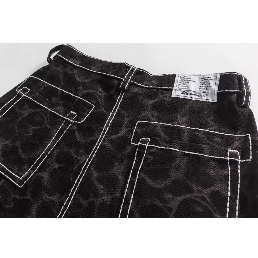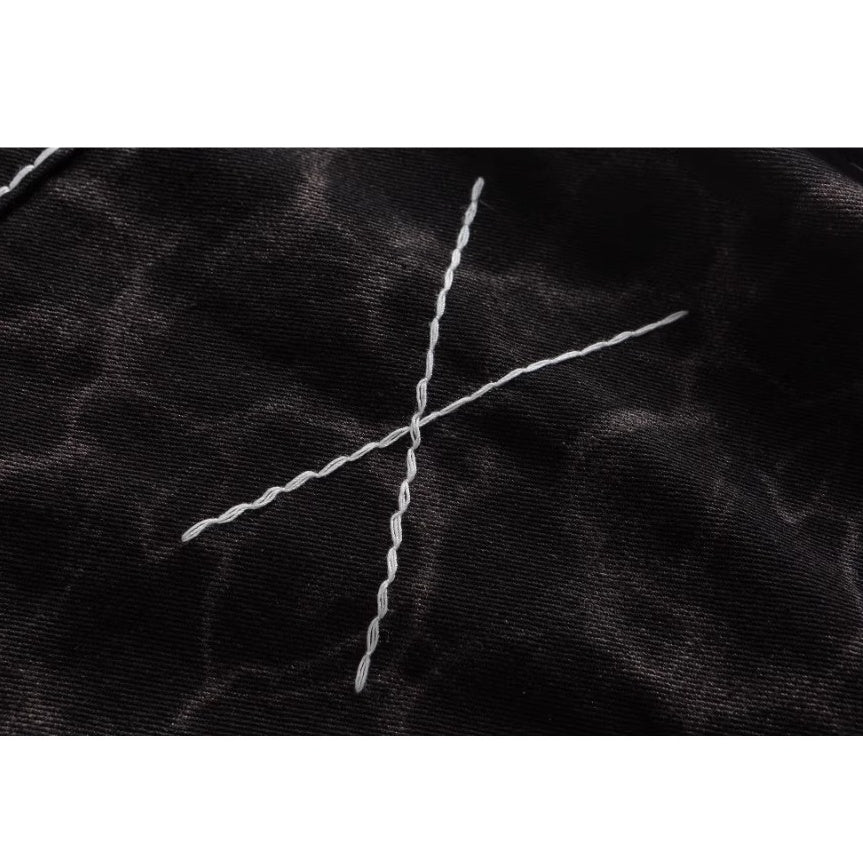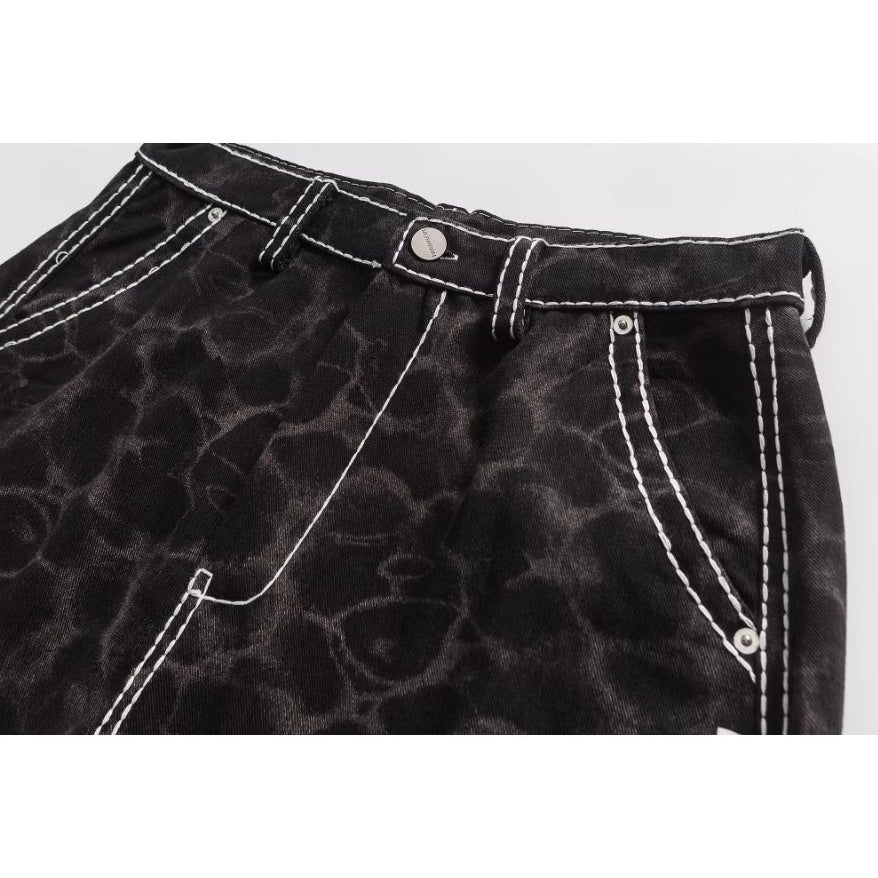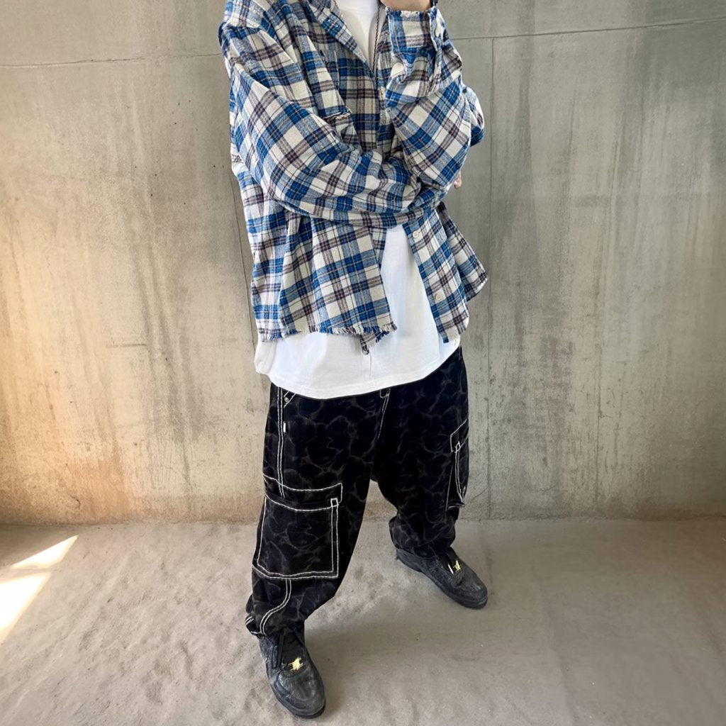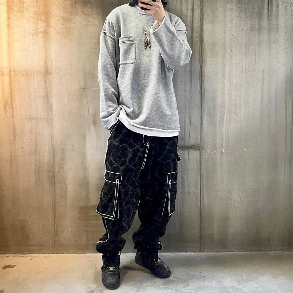 ブラックベースに淡い模様をのせ、ホワイトのコントラストステッチを効かせたカーゴパンツ。