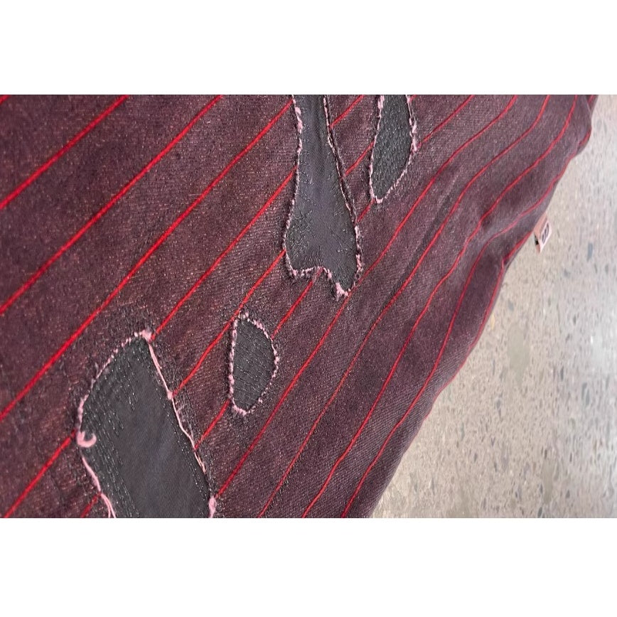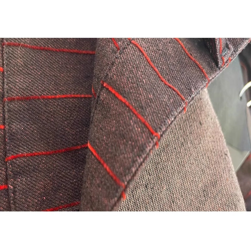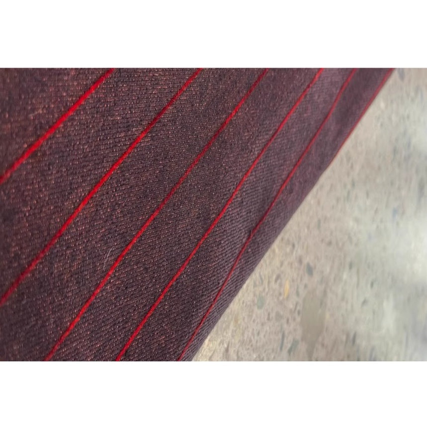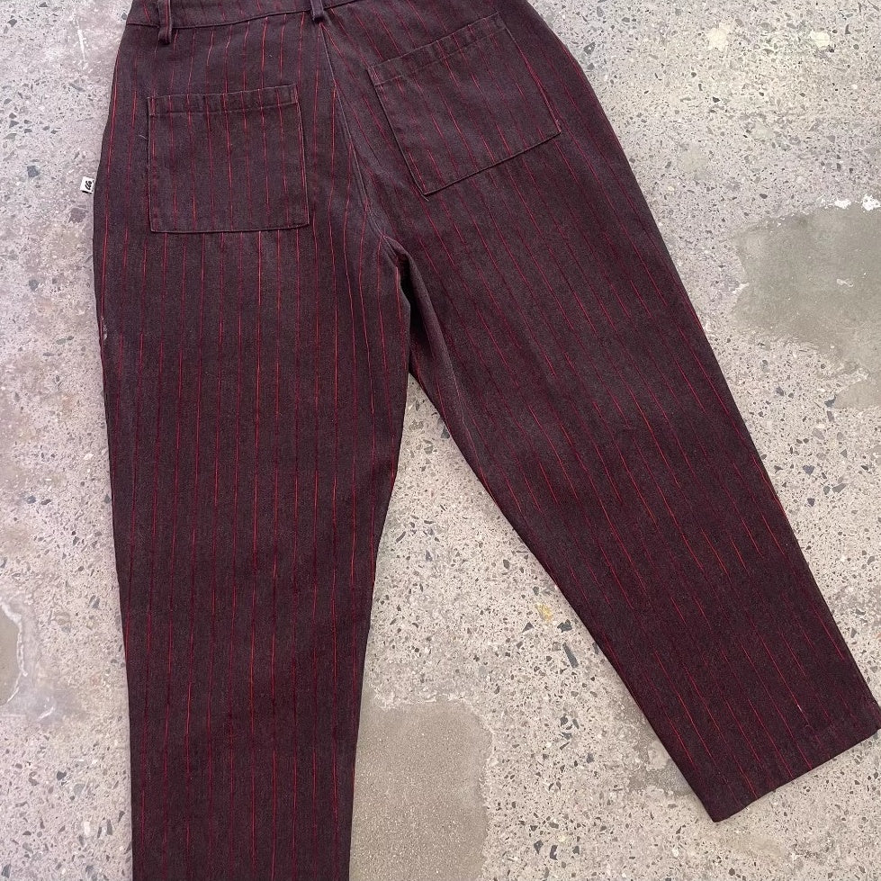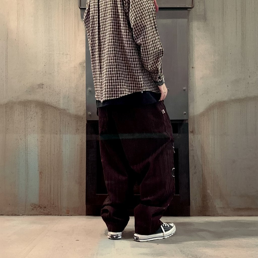 深みのあるボルドートーンに細いレッドストライプを走らせたワイドシルエットパンツ。