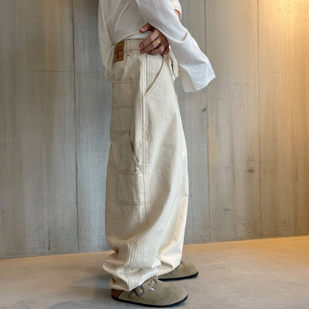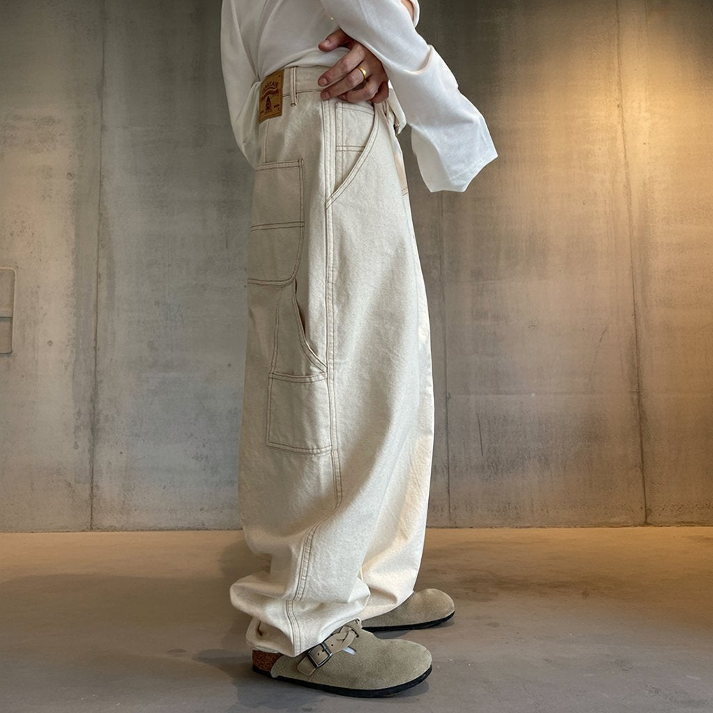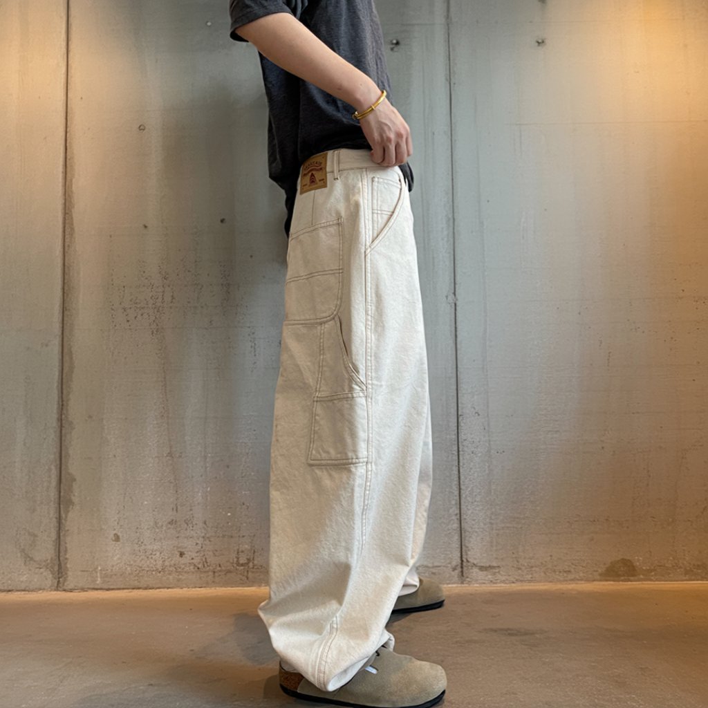 クリーンなホワイトデニムに、ワークテイストのパッチポケットを配したワイドパンツ。