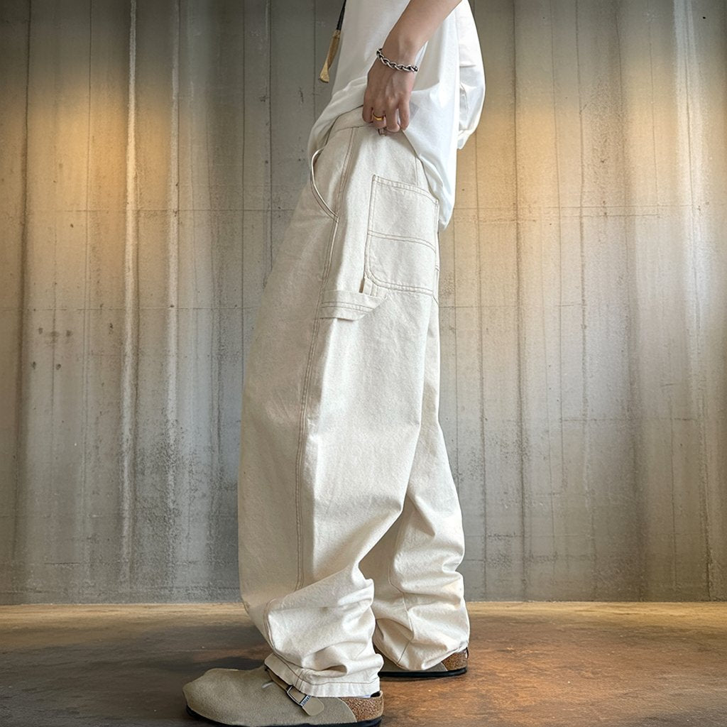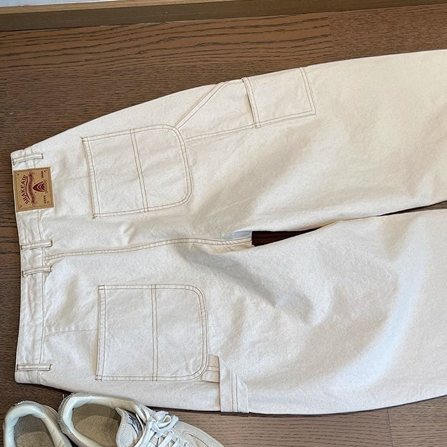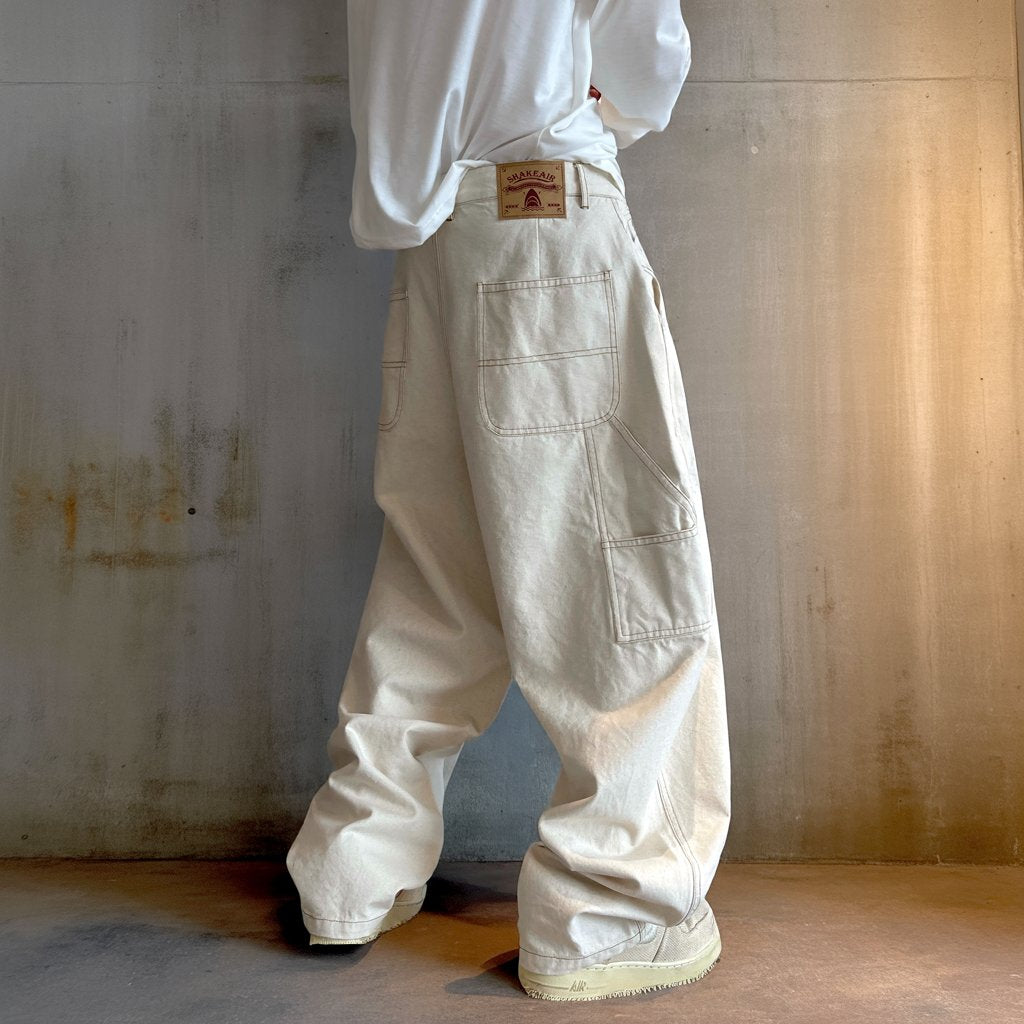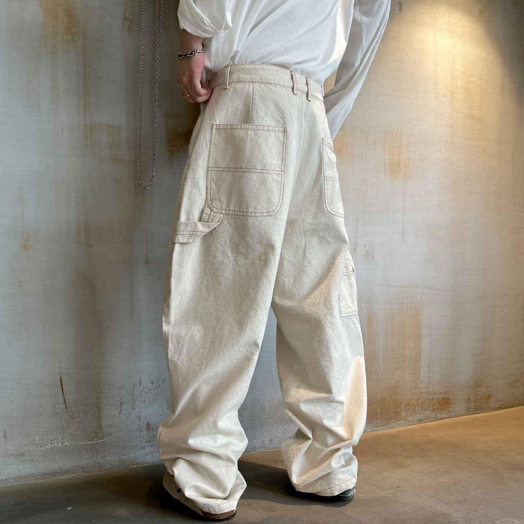 クリーンなホワイトデニムに、ワークテイストのパッチポケットを配したワイドパンツ。