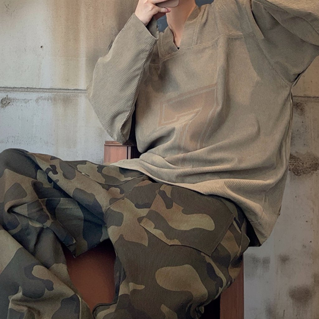 深めのVネックラインとワイドな身幅が抜け感を強調し、ゆるやかなシルエットを描きます。