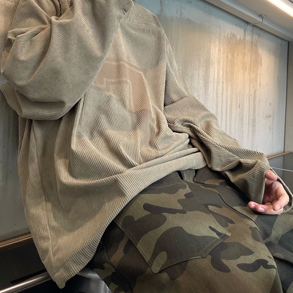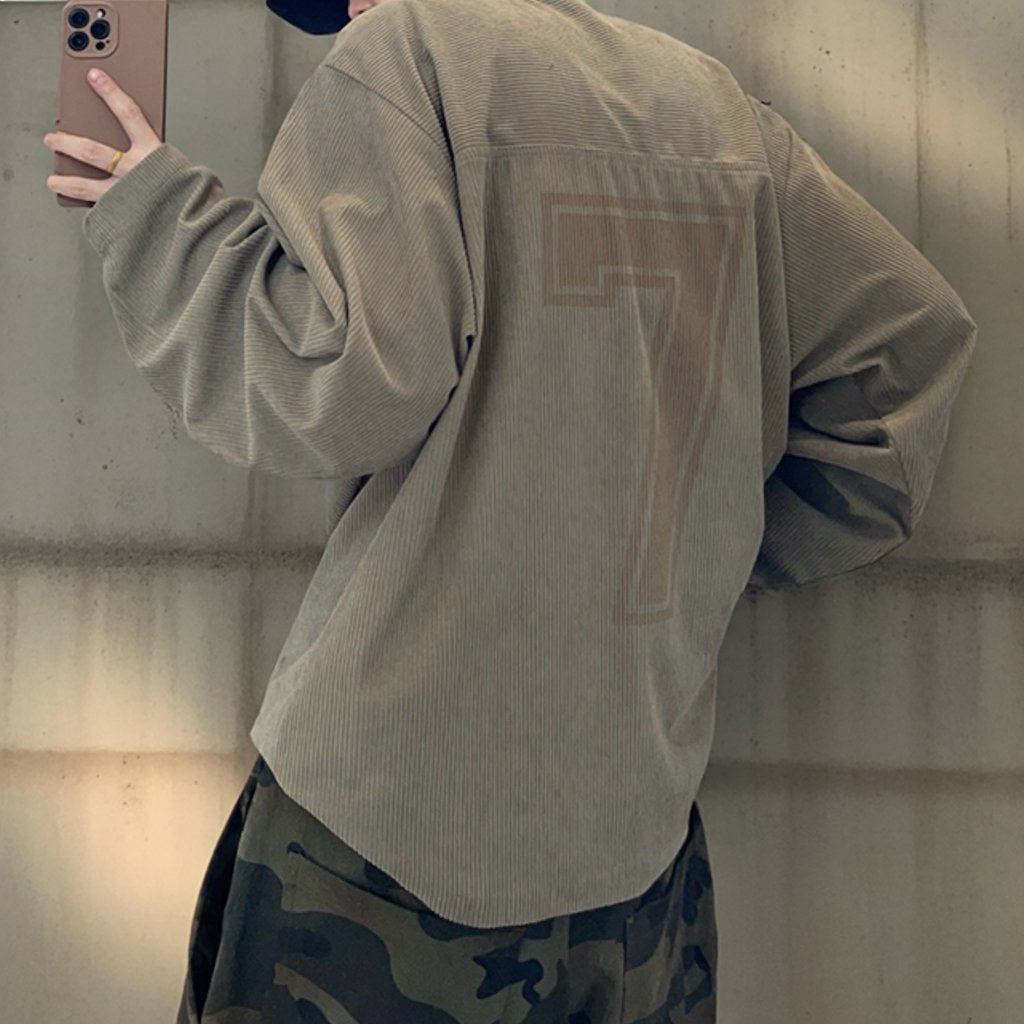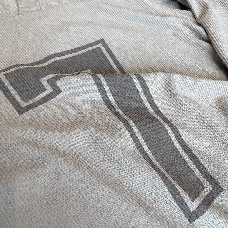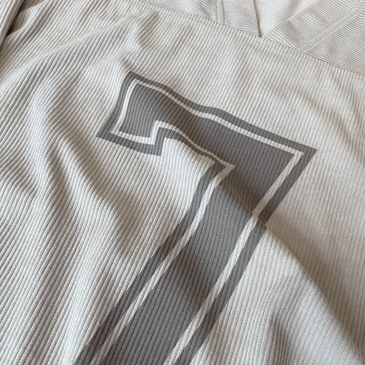 リブ素材の表情を活かし、背面に大きなナンバリングを配したオーバーサイズプルオーバー。