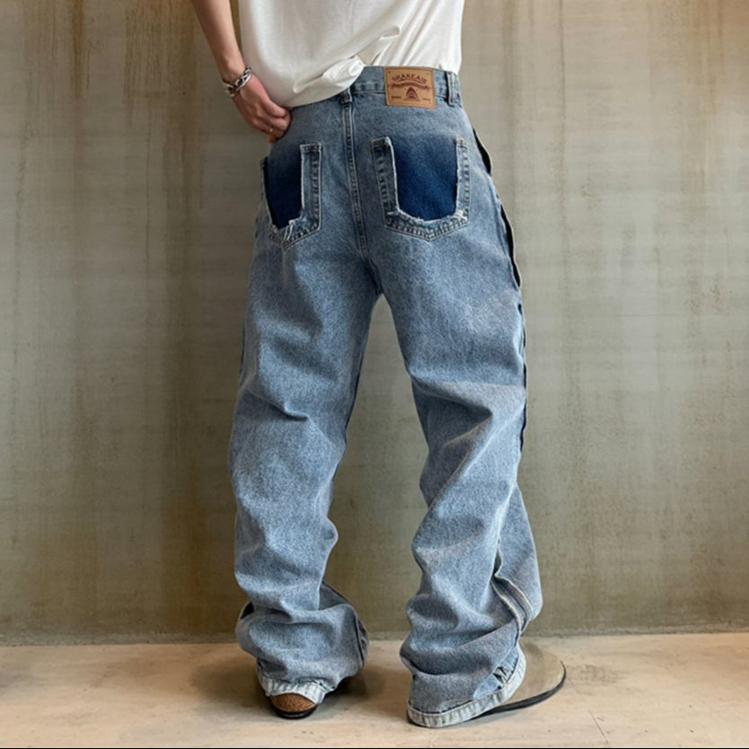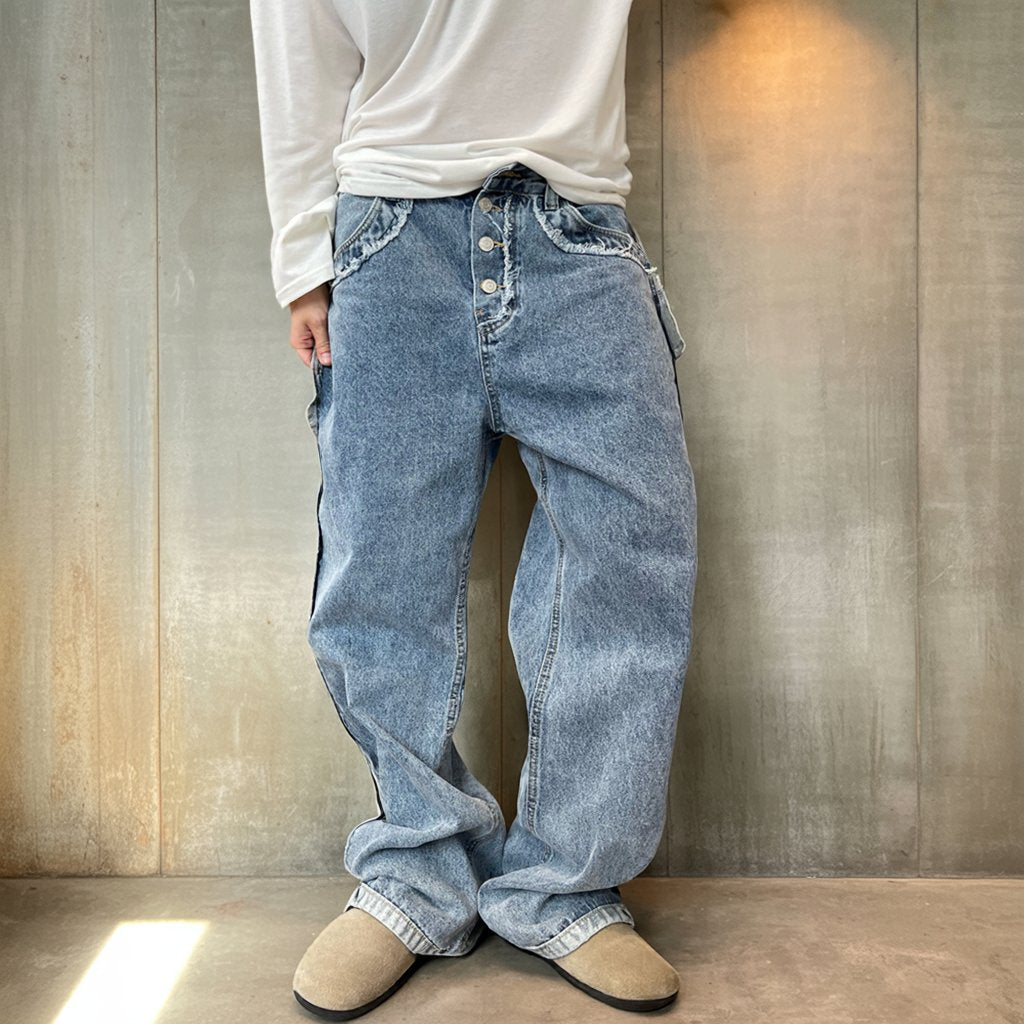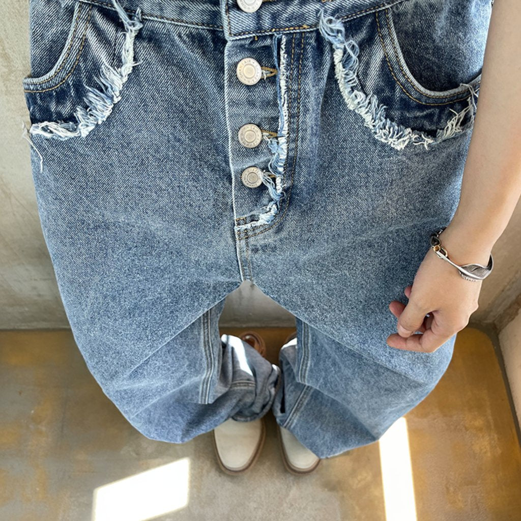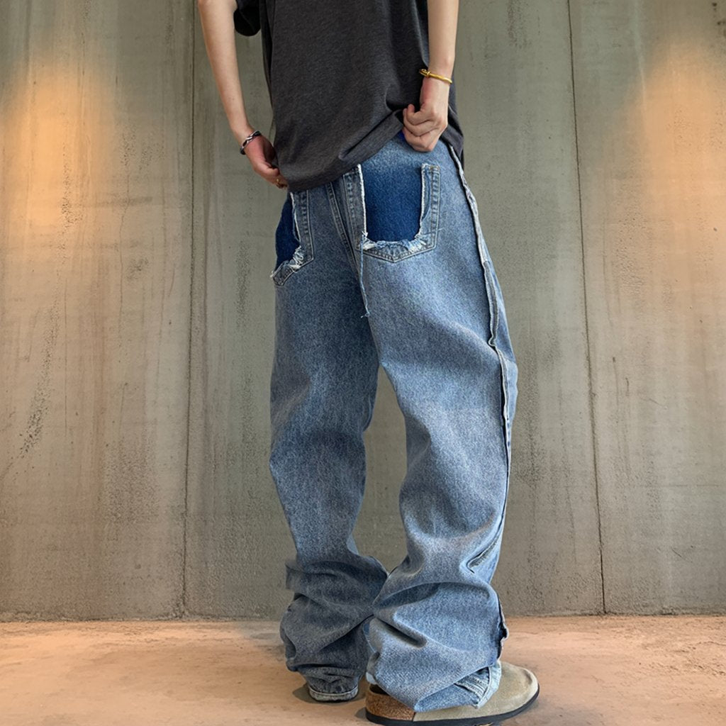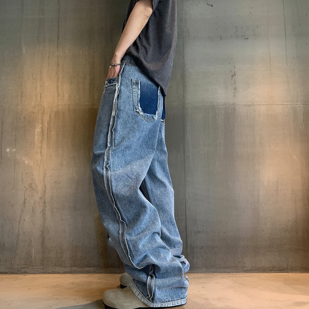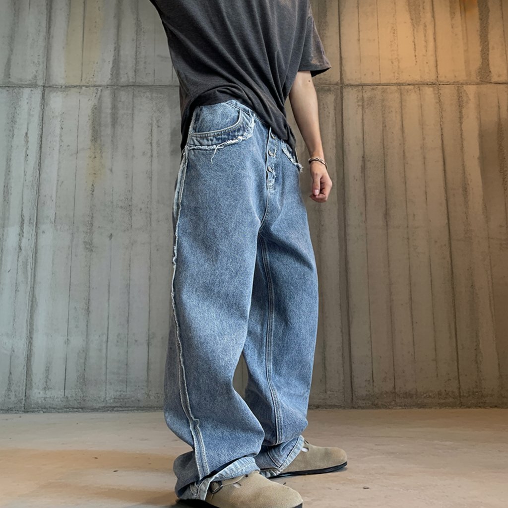大胆なフリンジ加工とバックポケットの濃色切り替えが目を引くワイドデニムパンツ。