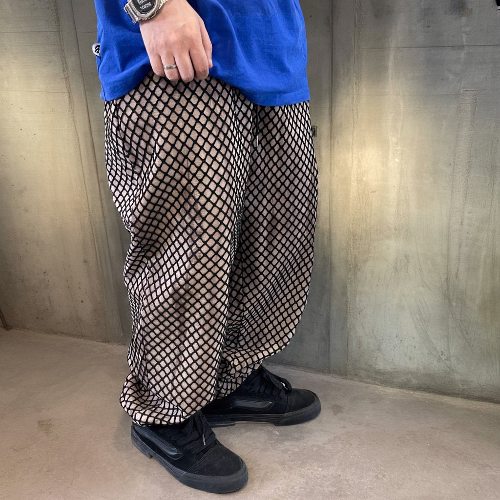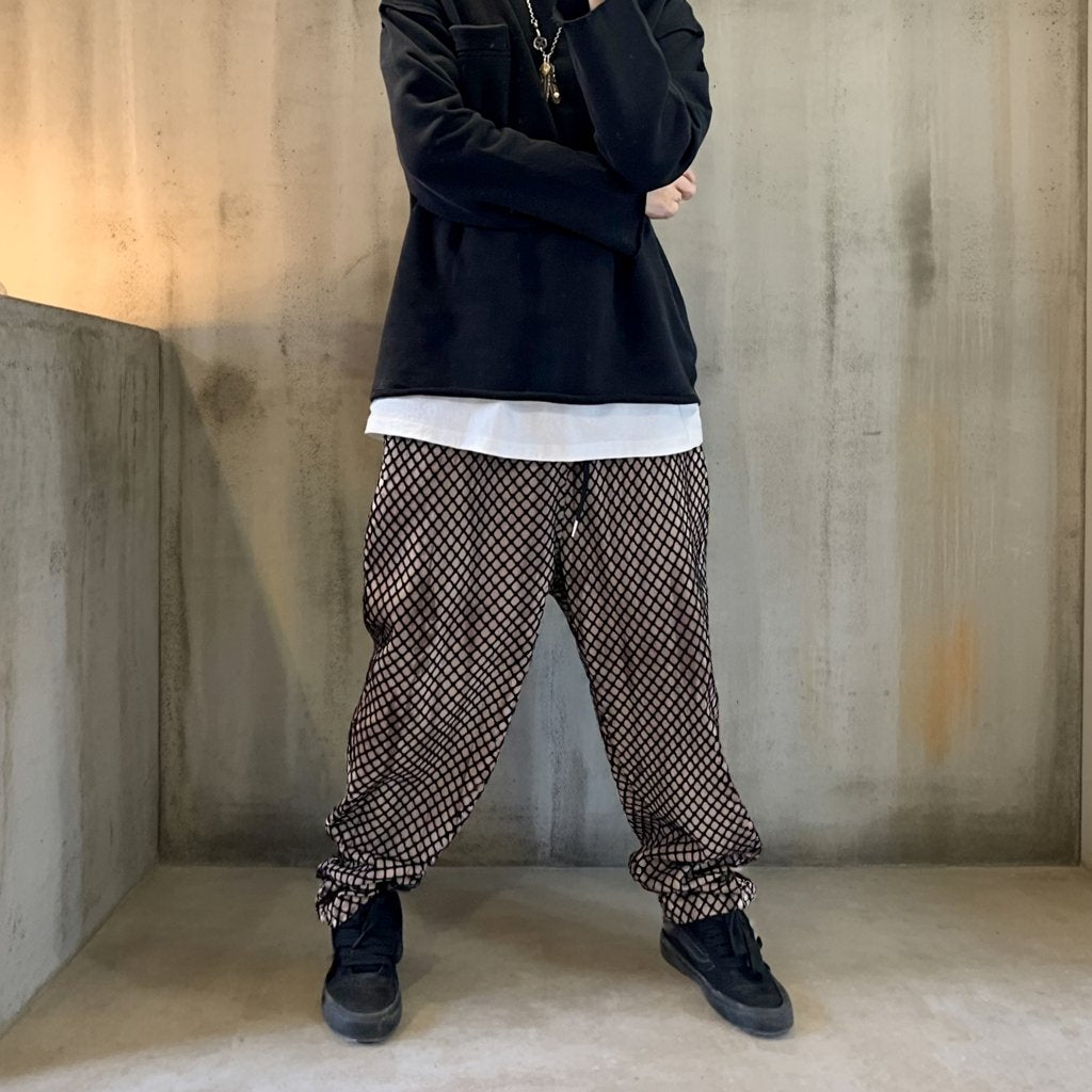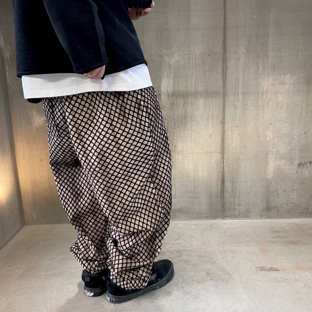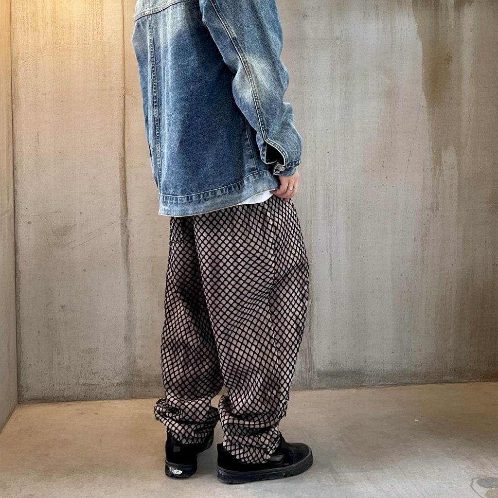 ブラウンベースにブラックの格子柄を全面に配した、個性際立つワイドパンツ。