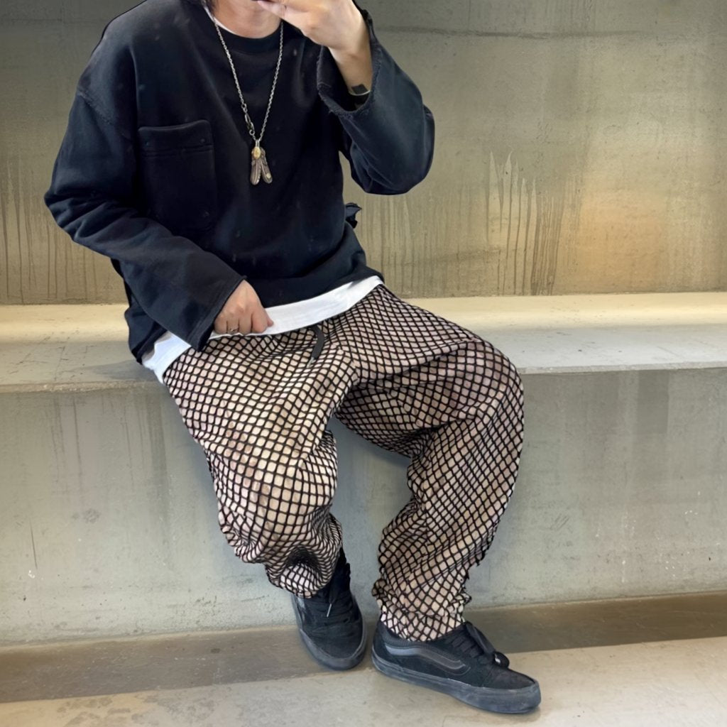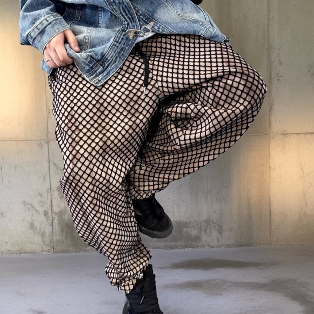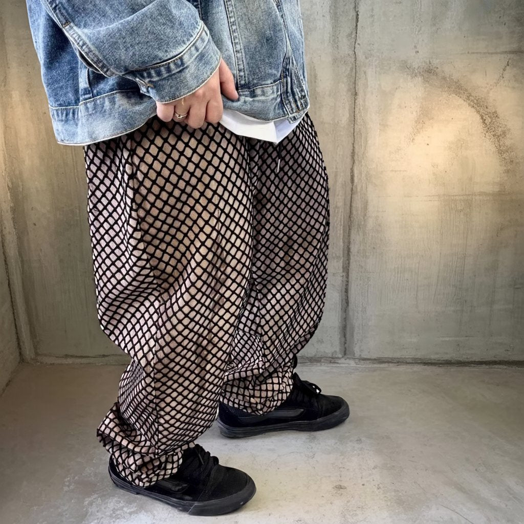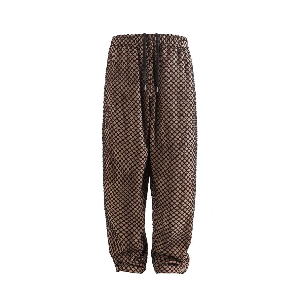 ブラウンベースにブラックの格子柄を全面に配した、個性際立つワイドパンツ。