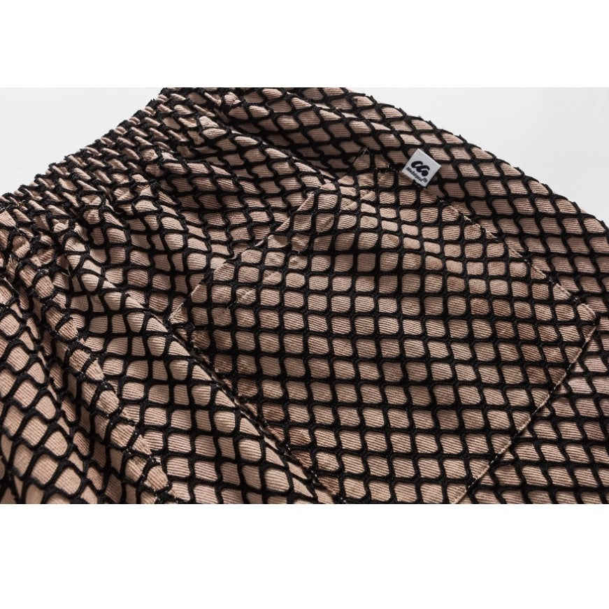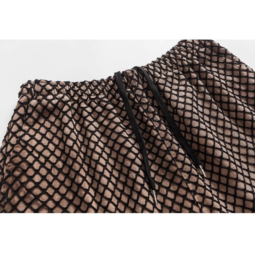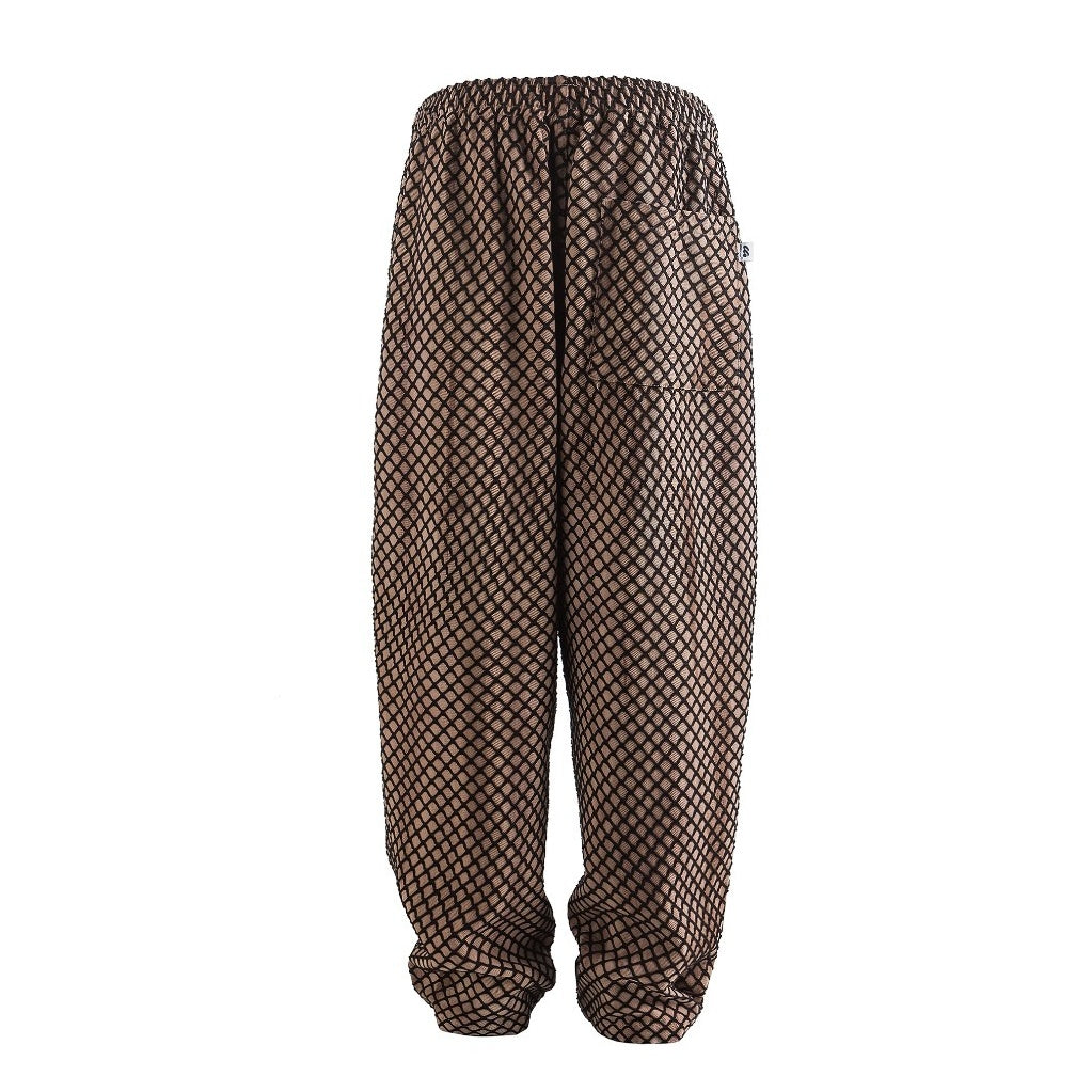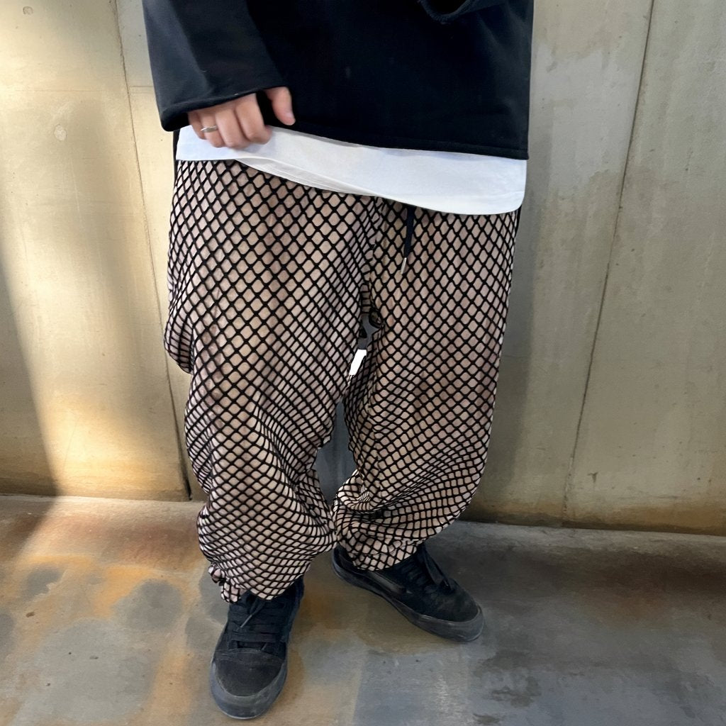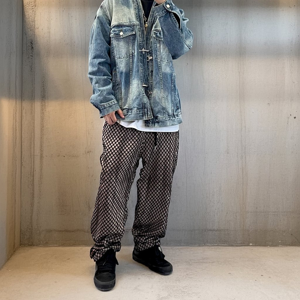 ブラウンベースにブラックの格子柄を全面に配した、個性際立つワイドパンツ。