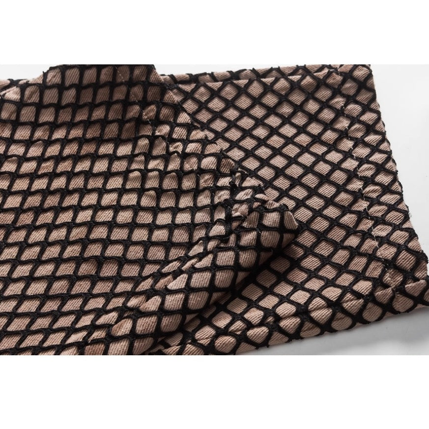 リズミカルなパターンが存在感を放ち、無地トップスとのコントラストも鮮やか。