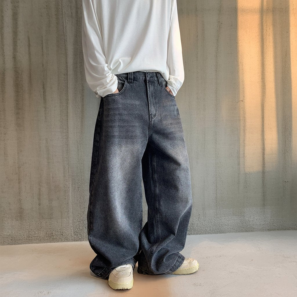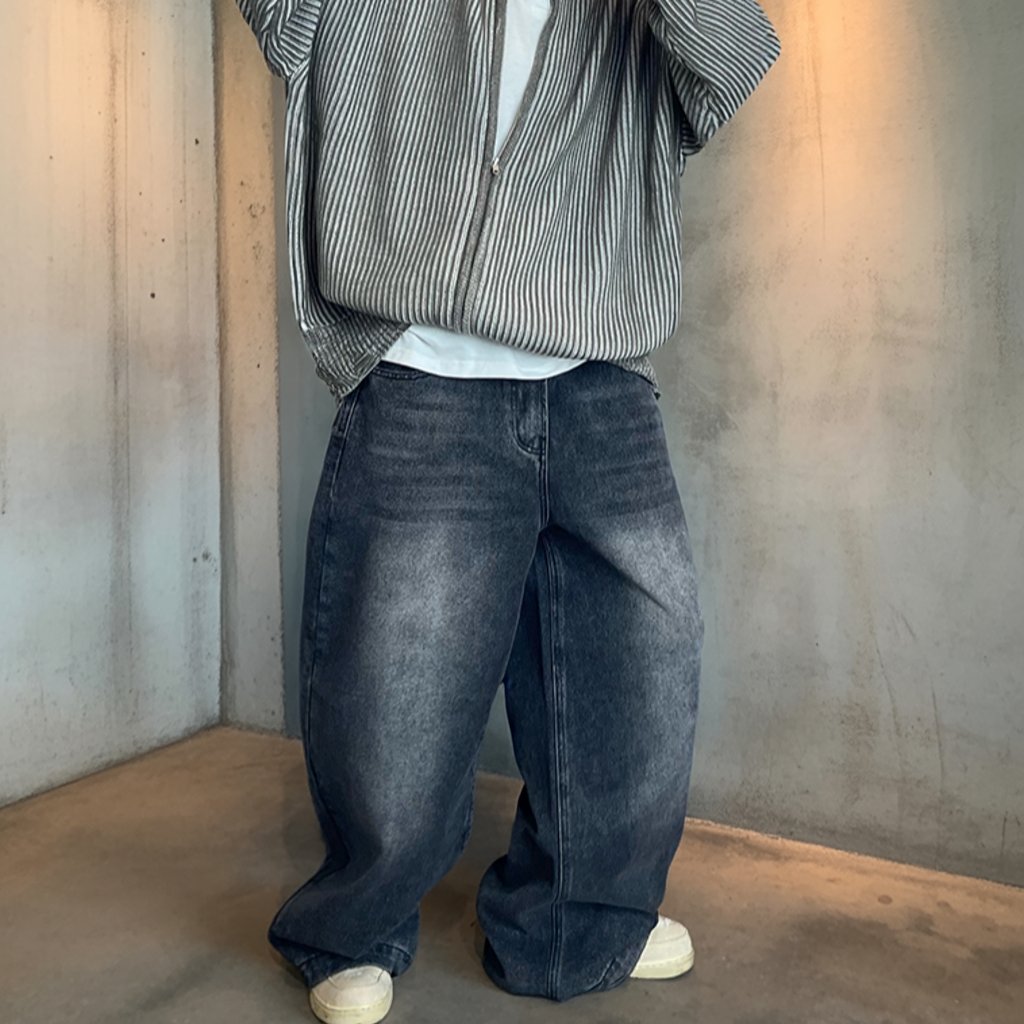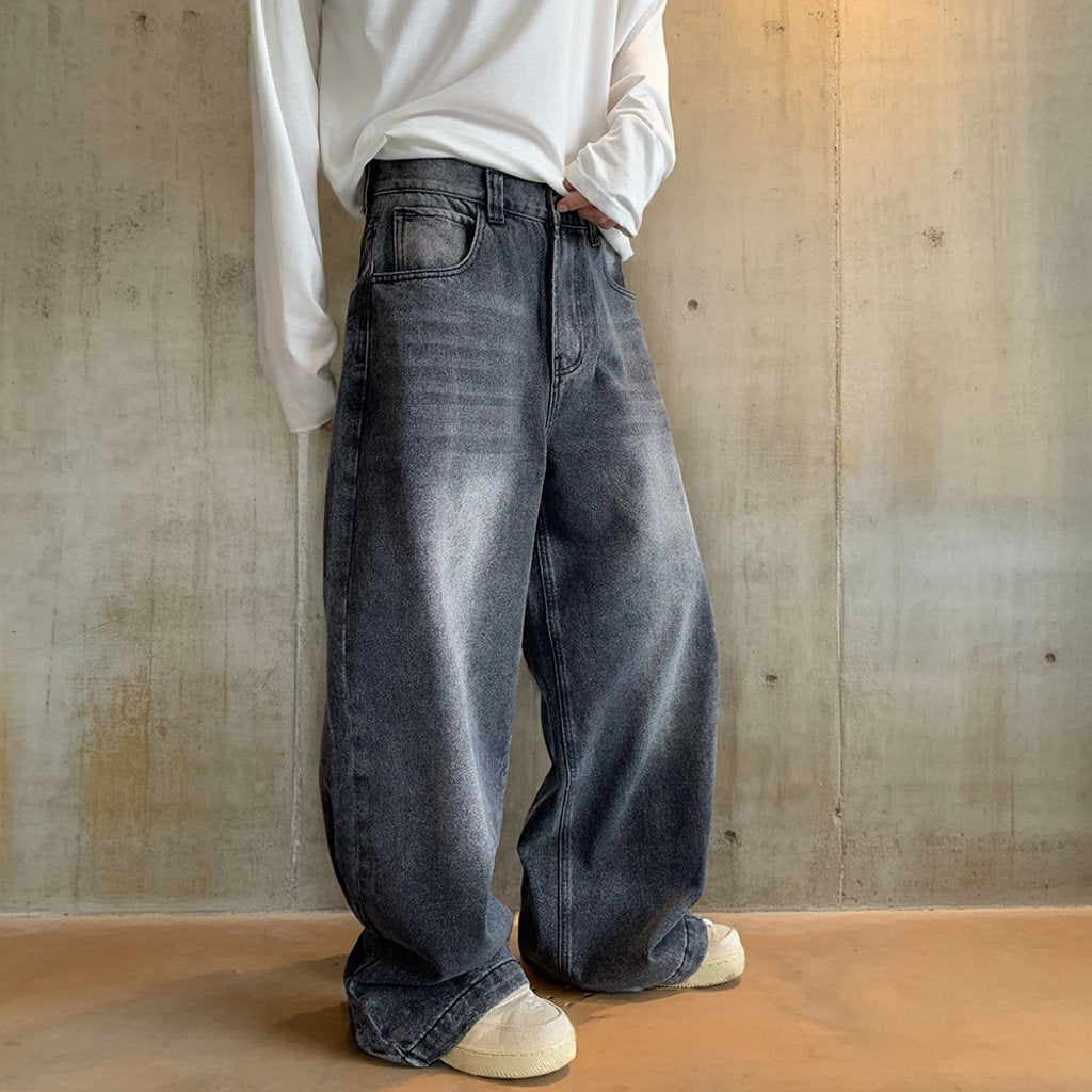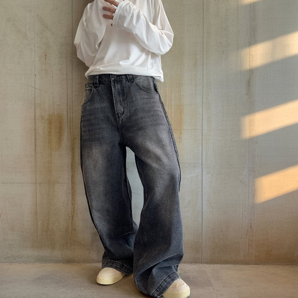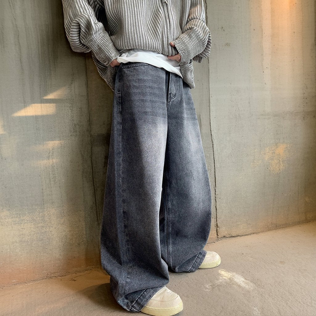 全体に施されたフェード加工が際立つ、存在感のあるワイドデニムパンツ。