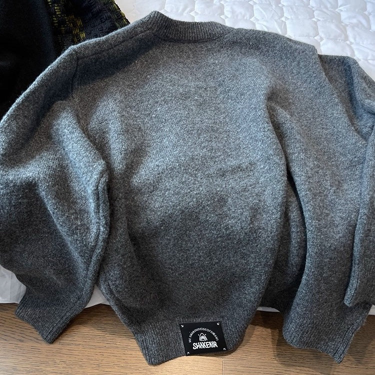 シンプルな無地に、前身頃へ二重に配置されたボタンが印象的なカーディガン。