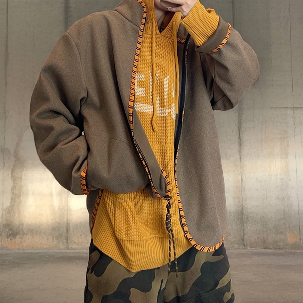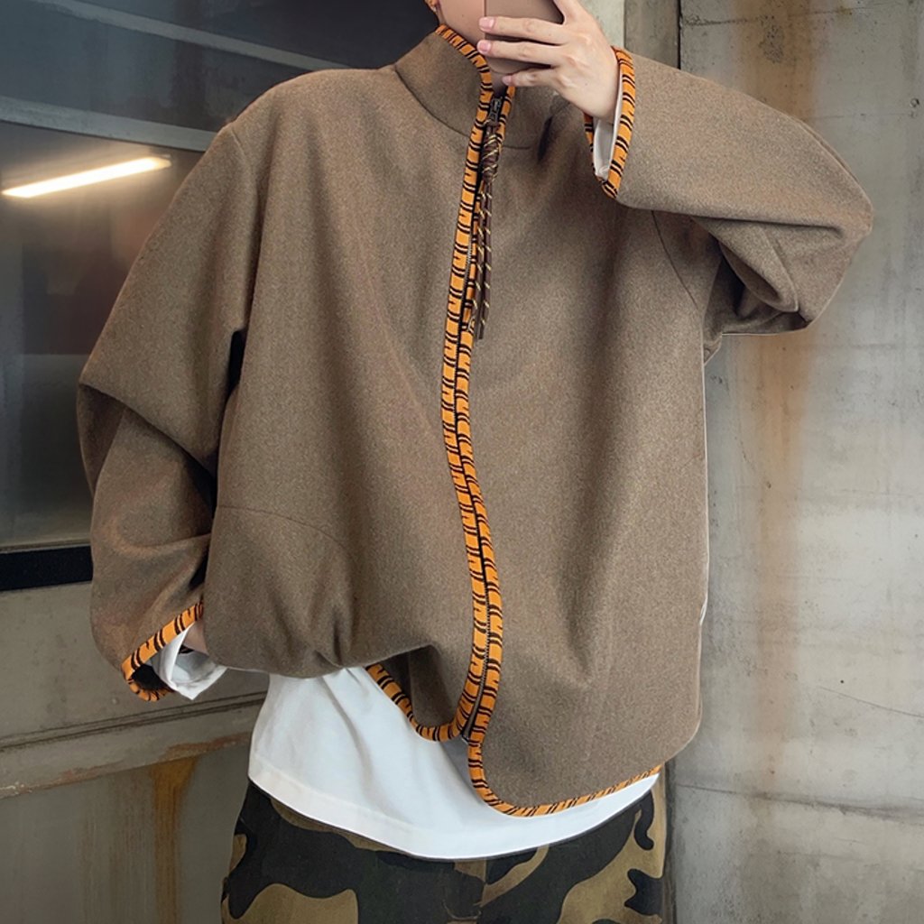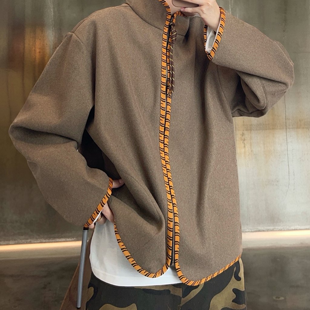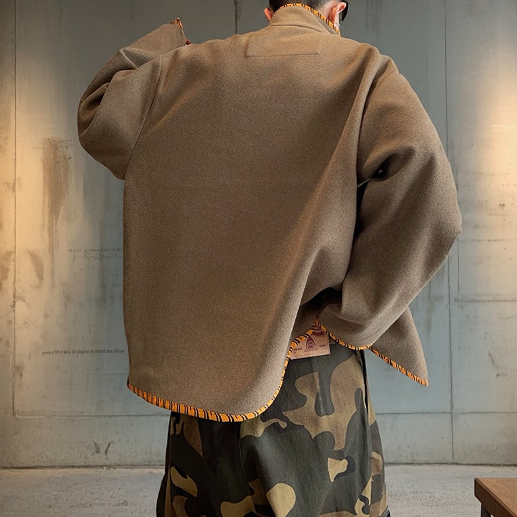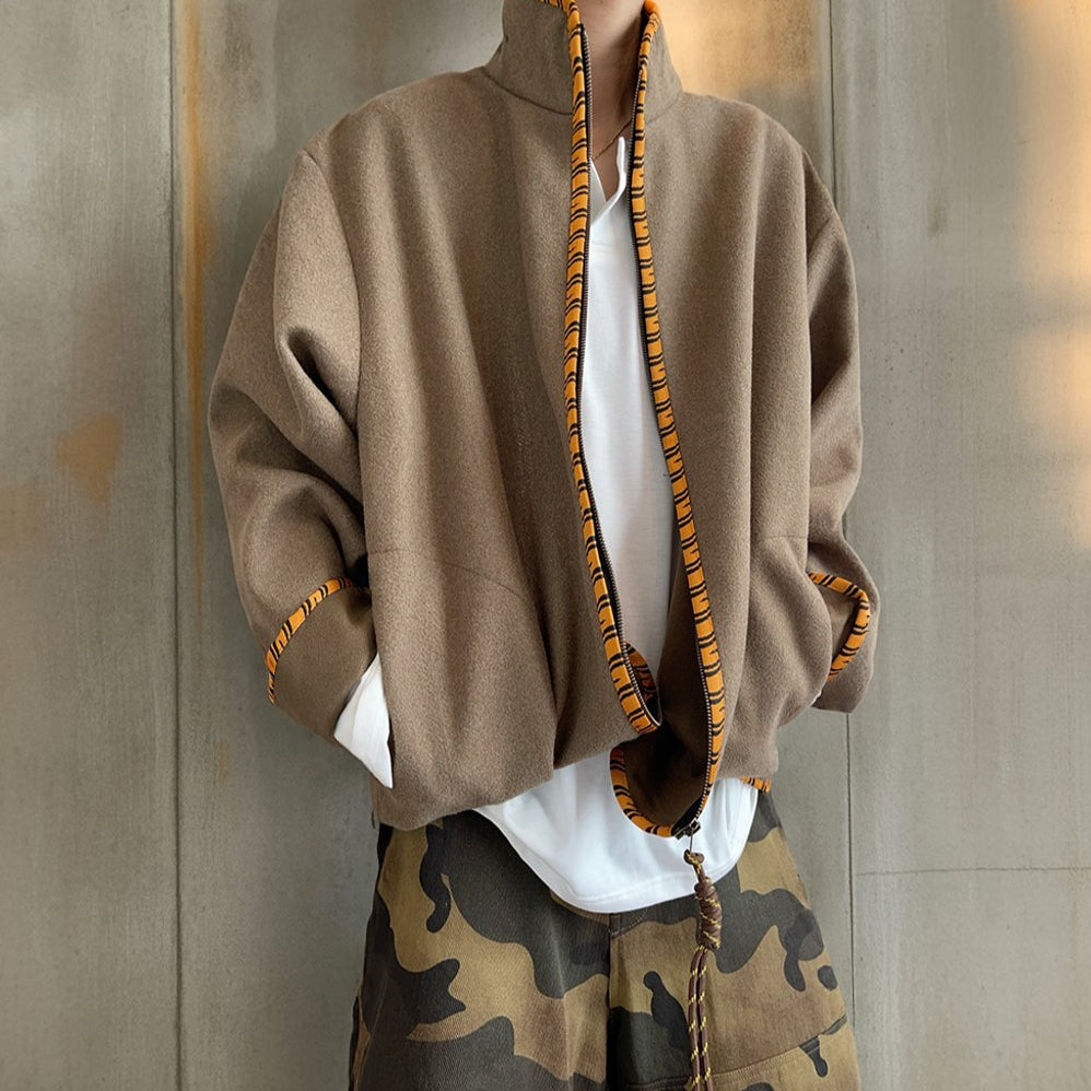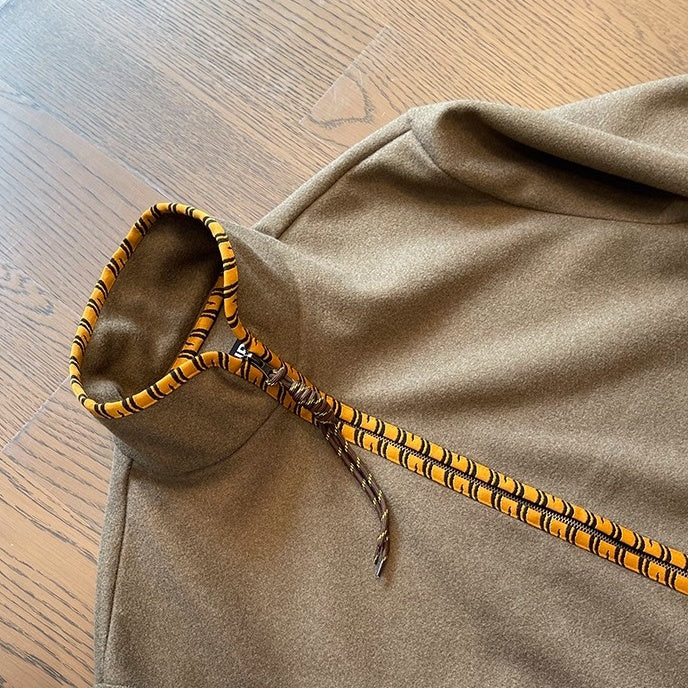 やわらかなモカトーンに、鮮やかなパイピングを効かせたスタンドカラーブルゾン。