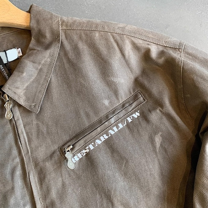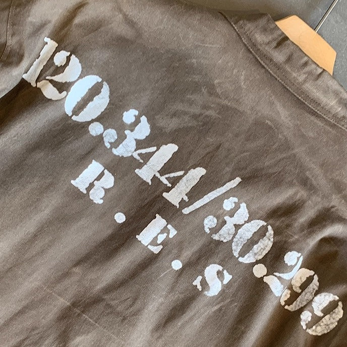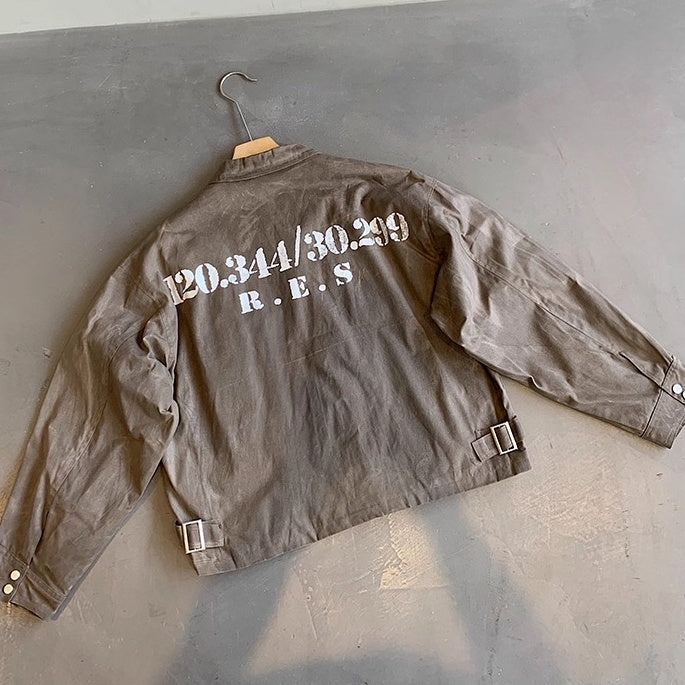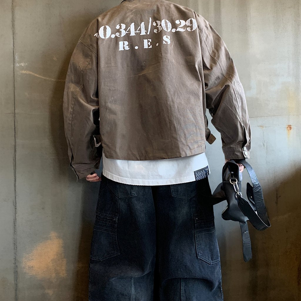 胸元のジップディテールと、背面に大きく施されたステンシル風プリントが存在感を放ちます。