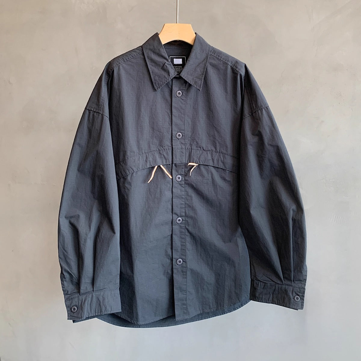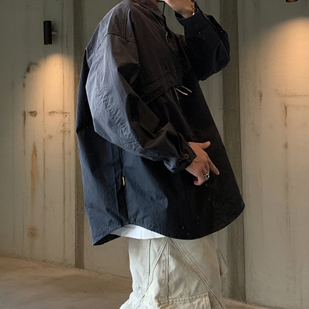 胸元の切り替えラインから伸びるドローコードがアクセントとなり、シンプルな中に立体感を加えています。