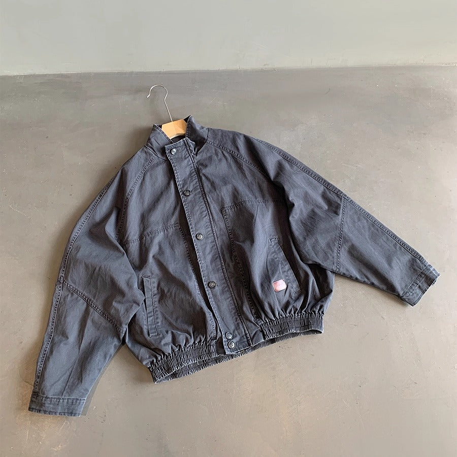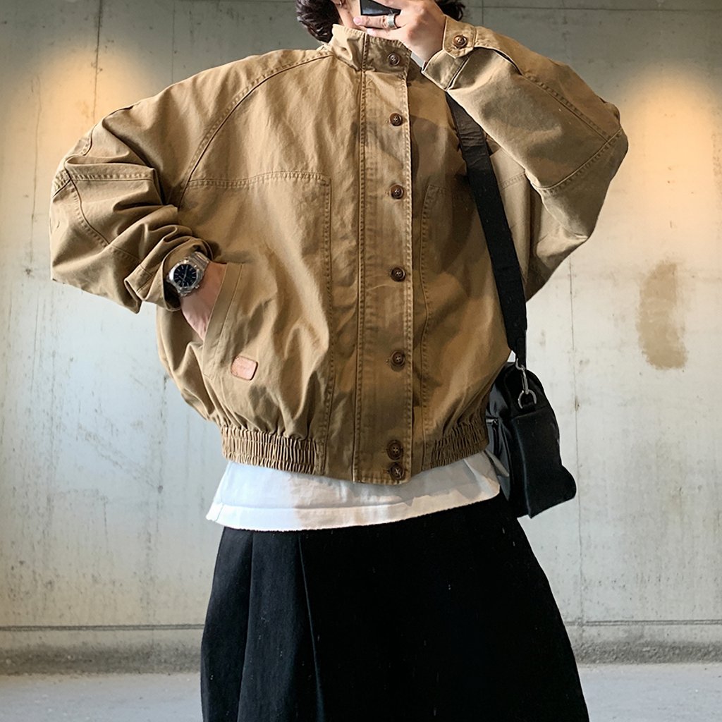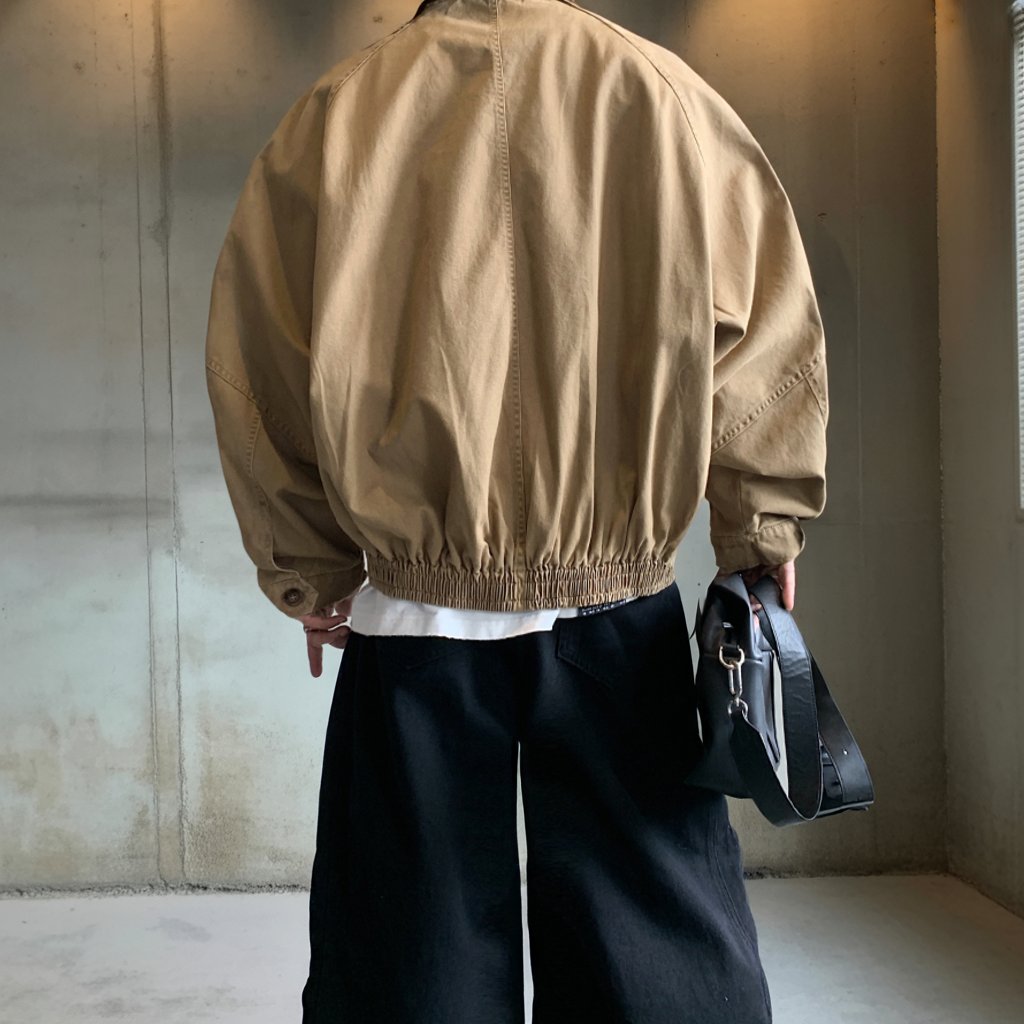 くすんだ色味とボリューム感のあるシルエットが印象的なスタンドボタンブルゾン。