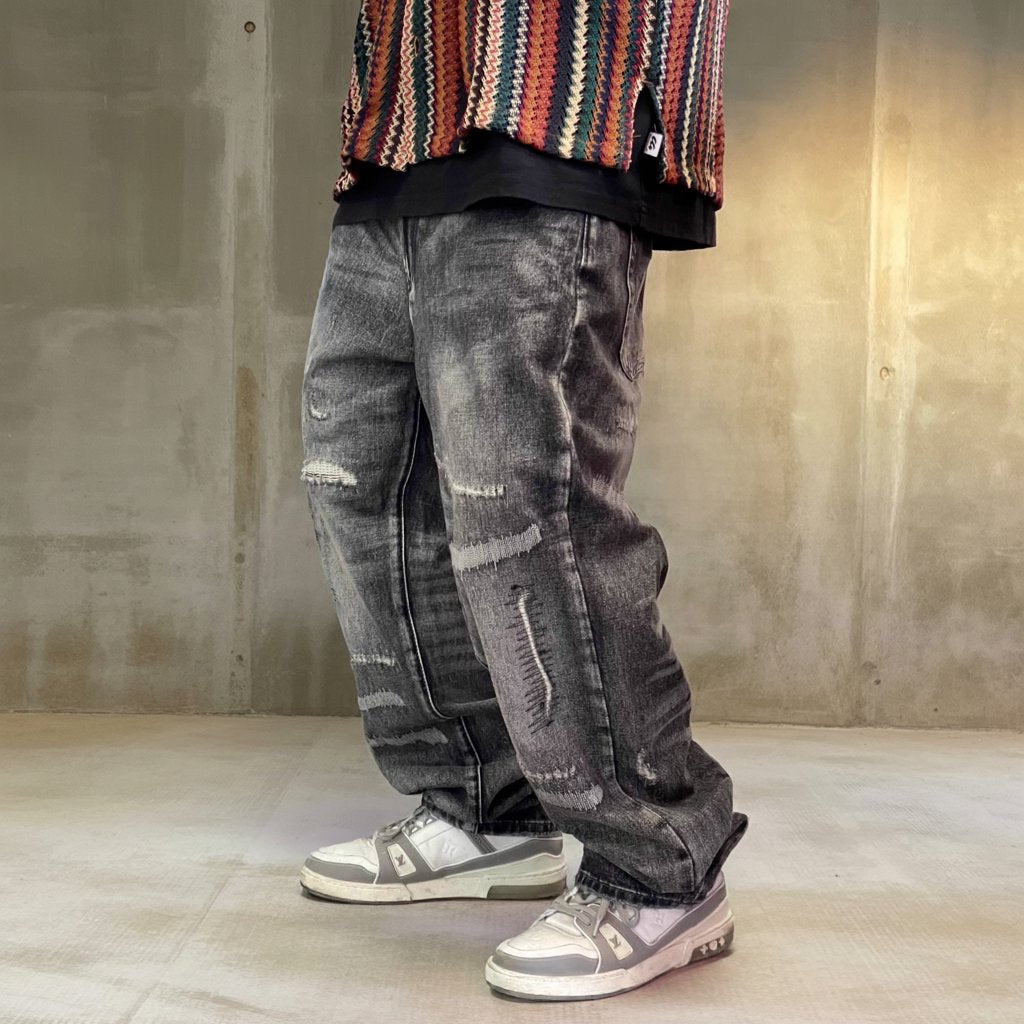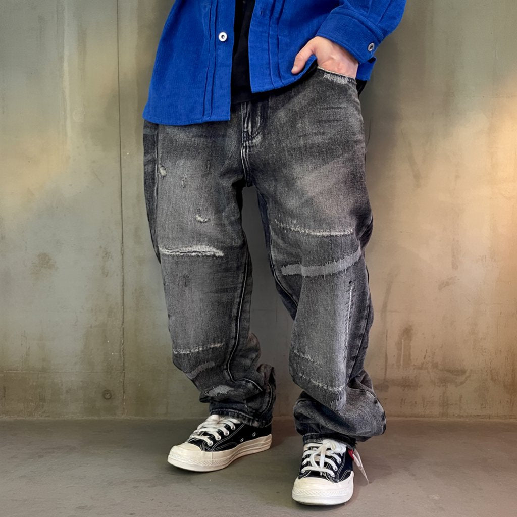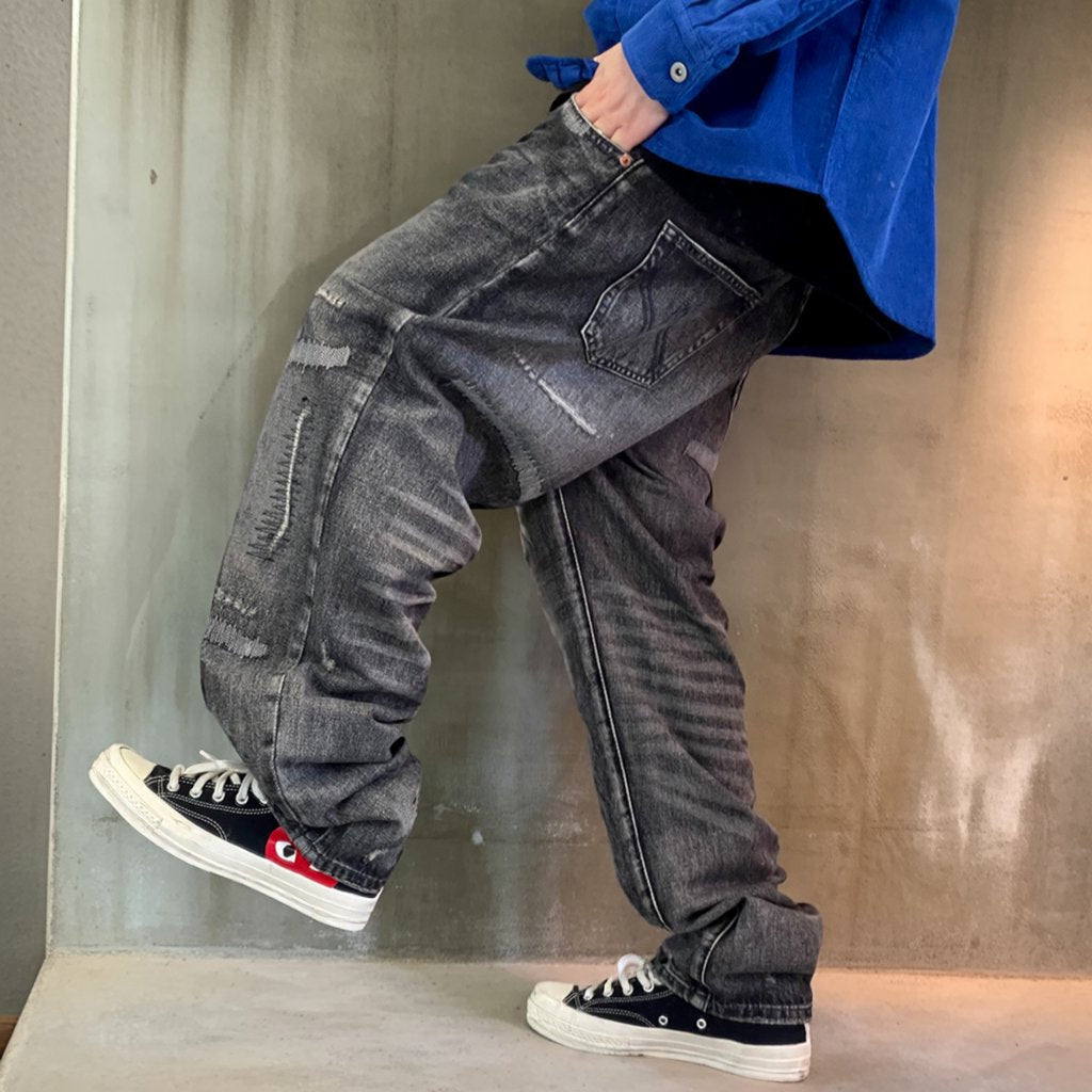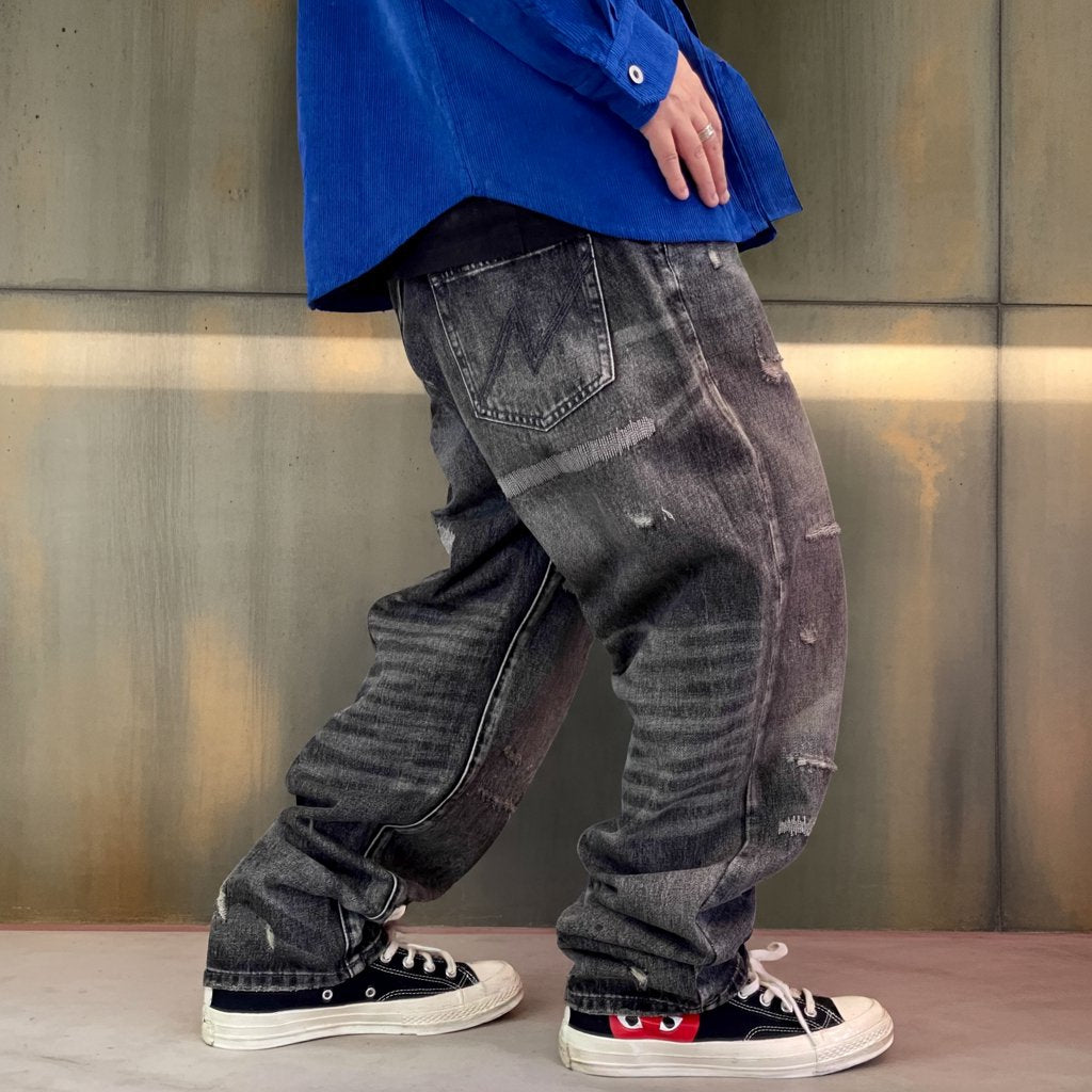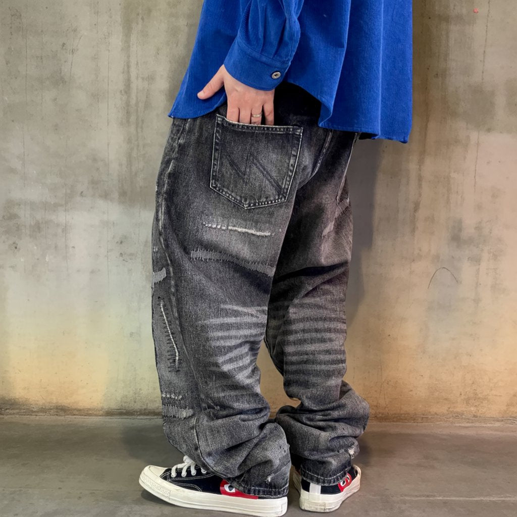 深みのあるブラックグレーに、ランダムなクラッシュとリペアステッチを施したワイドデニムパンツ。