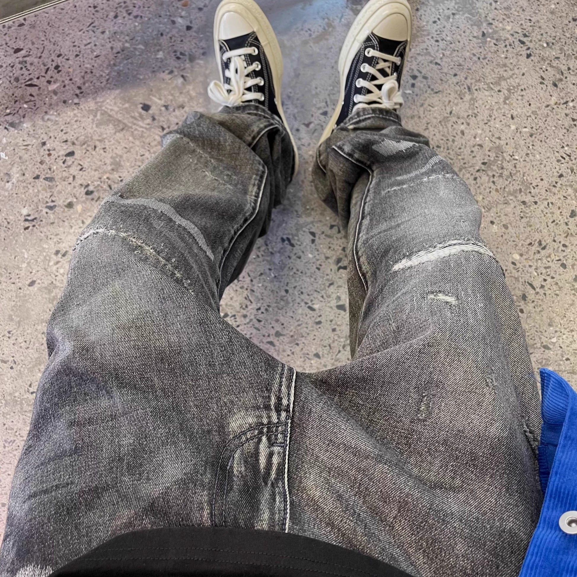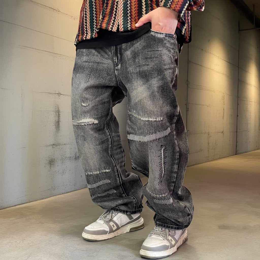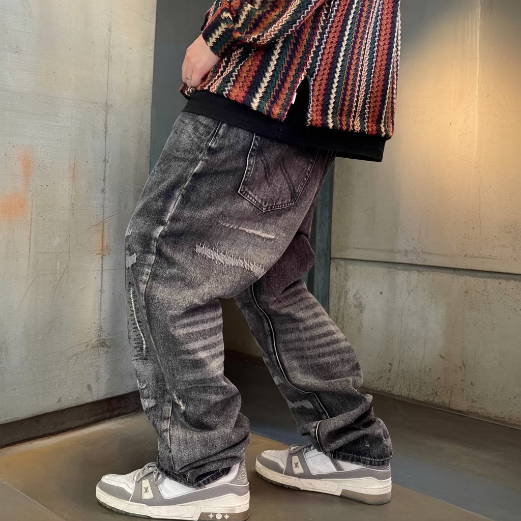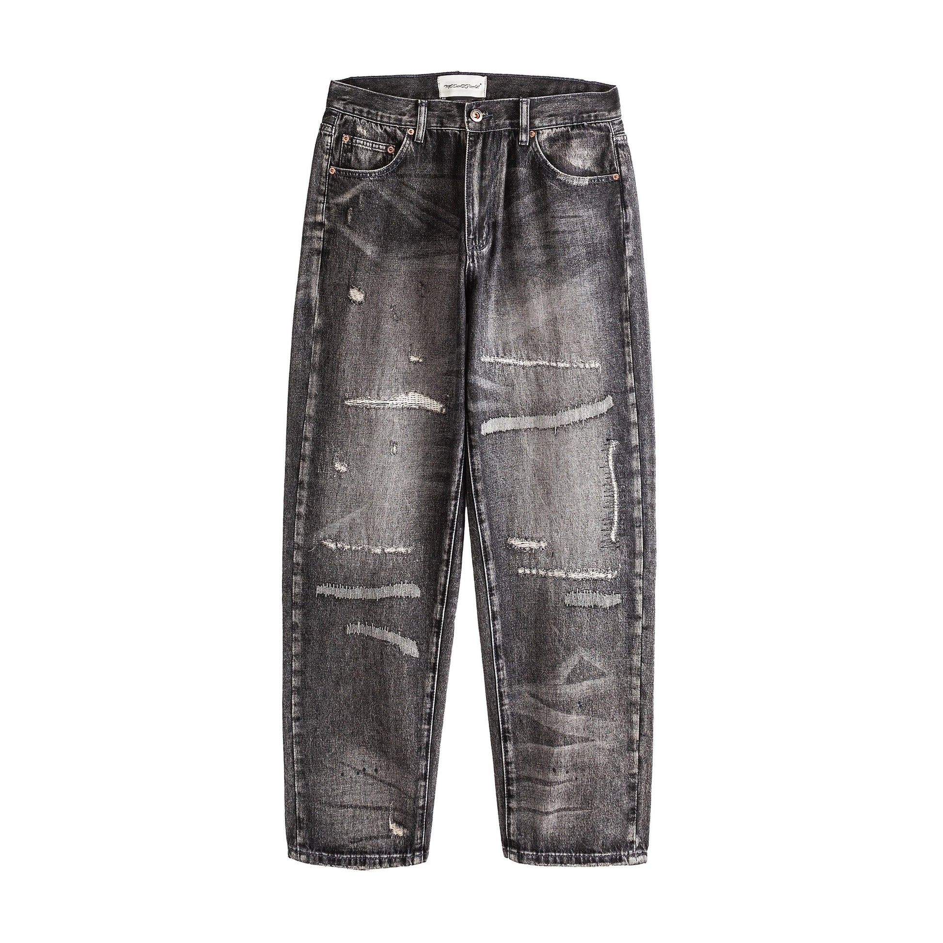 深みのあるブラックグレーに、ランダムなクラッシュとリペアステッチを施したワイドデニムパンツ。