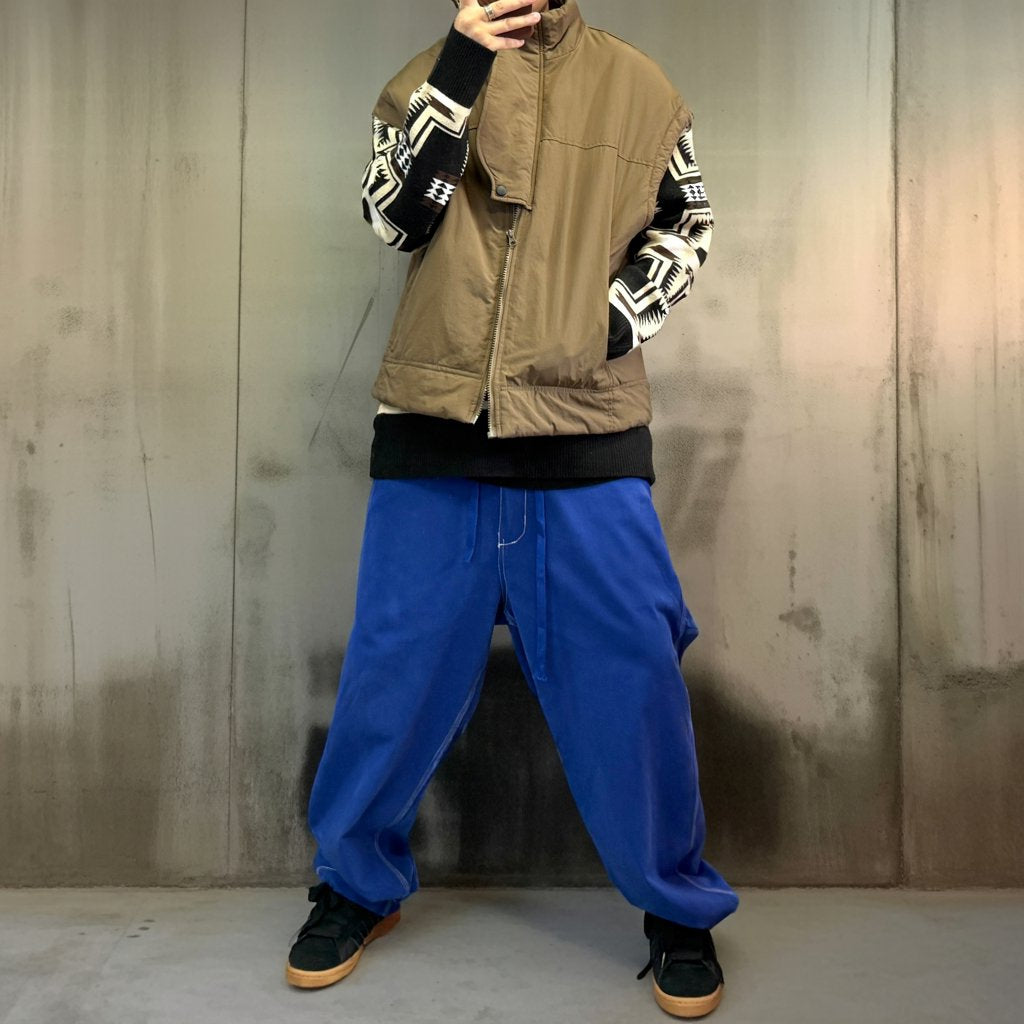 鮮やかなブルーが映えるワイドパンツ。