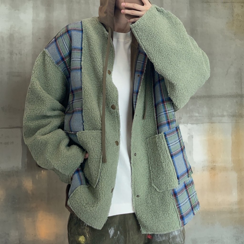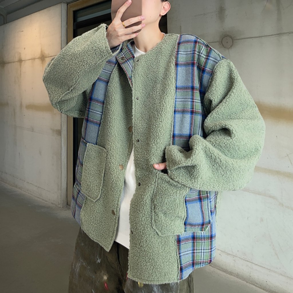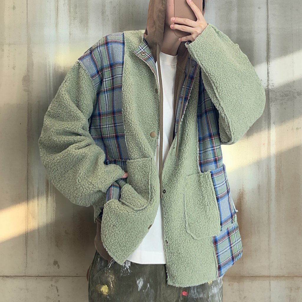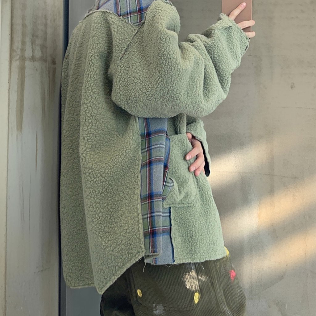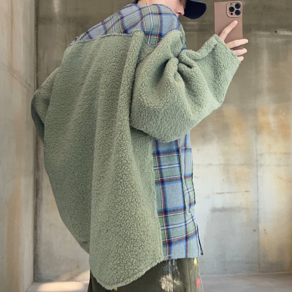 柔らかなボアと起毛チェックを組み合わせたミックスデザインジャケット。