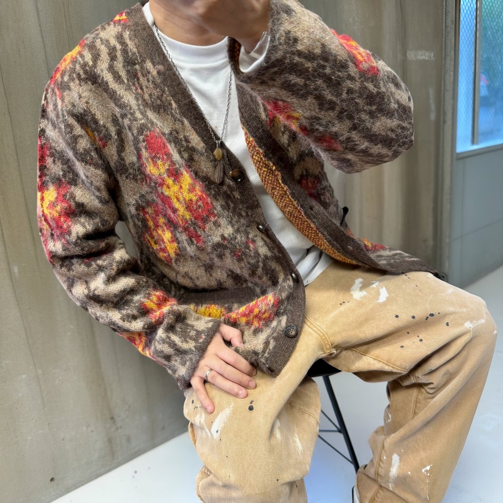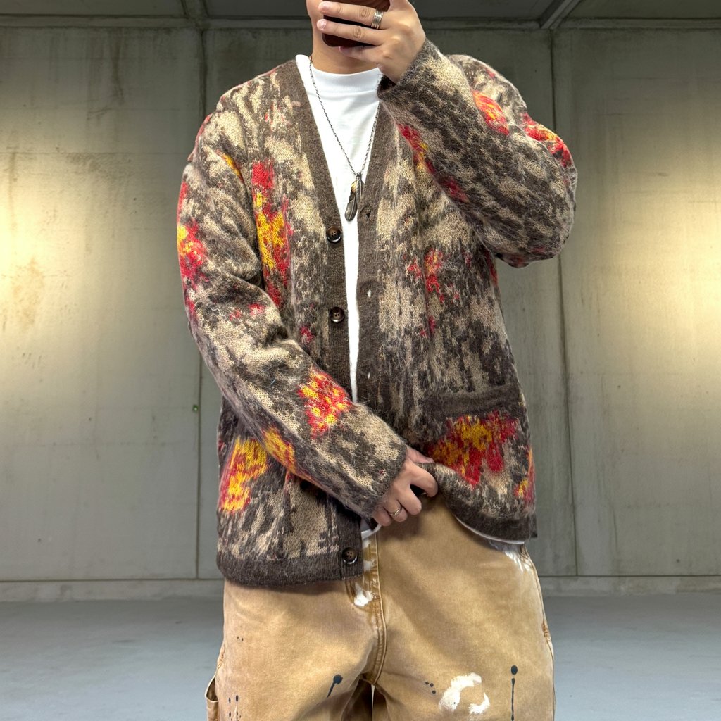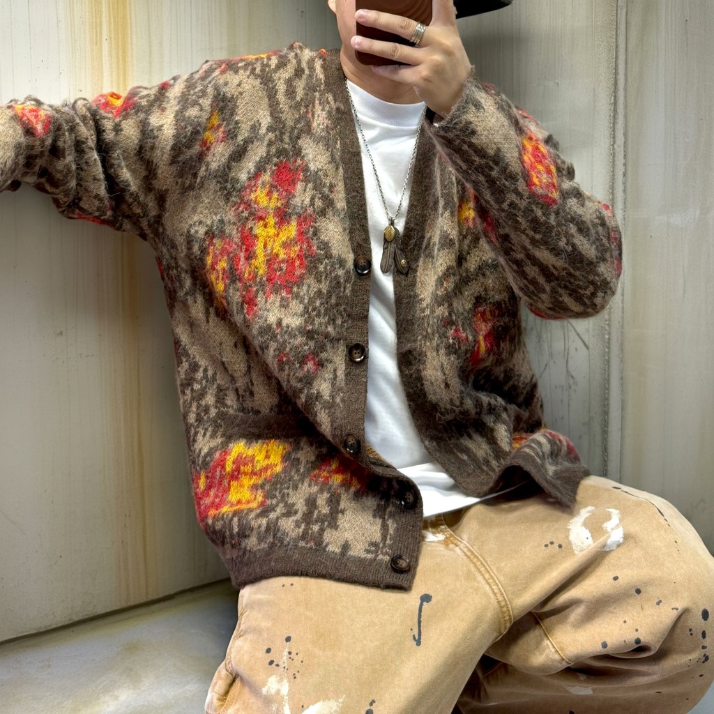 ブラウンをベースに、レッドとイエローの抽象的な模様が印象的なカーディガン。