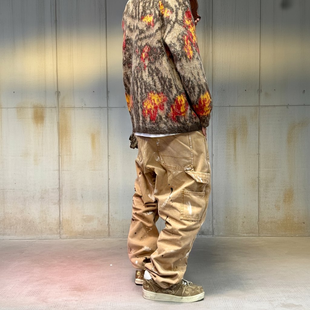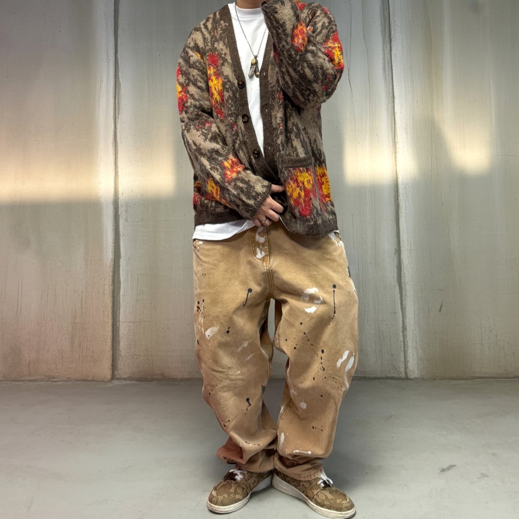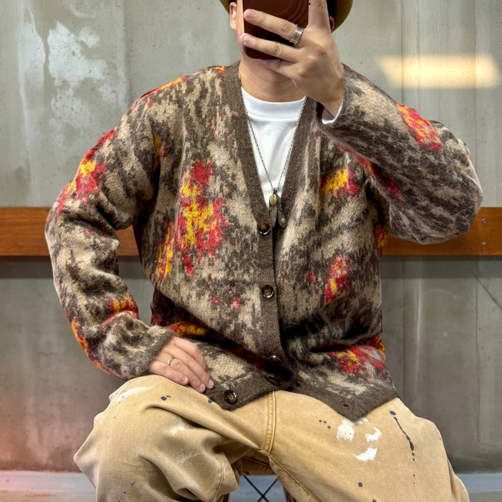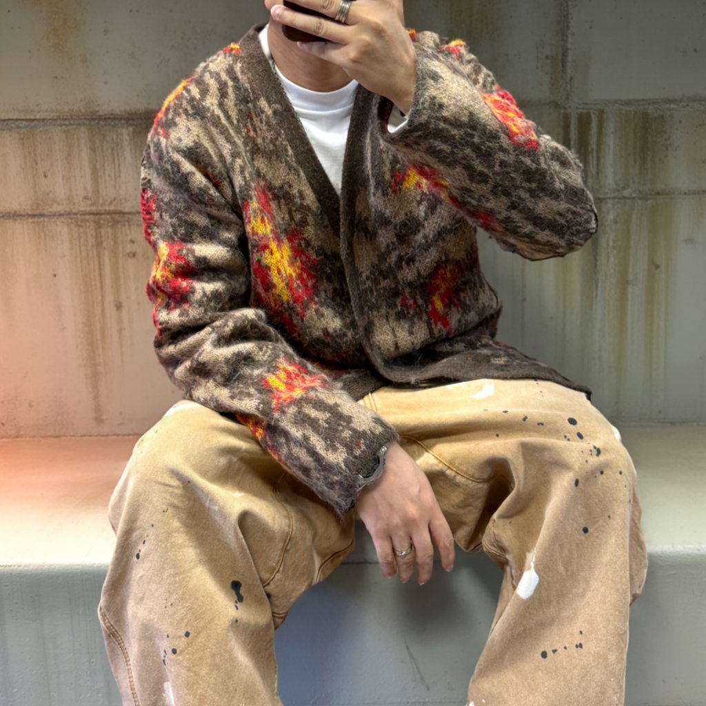 ブラウンをベースに、レッドとイエローの抽象的な模様が印象的なカーディガン。