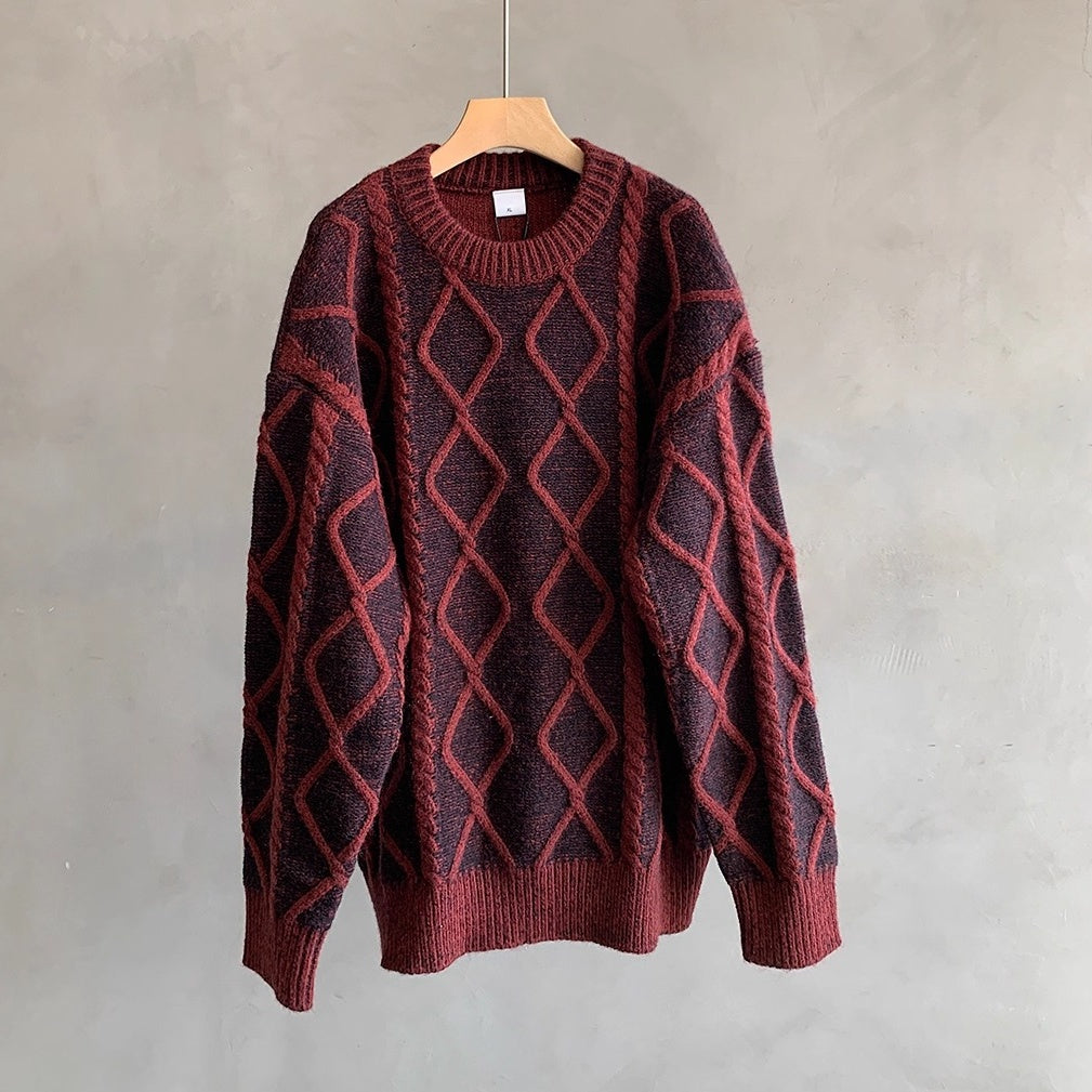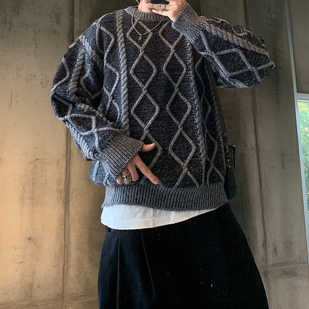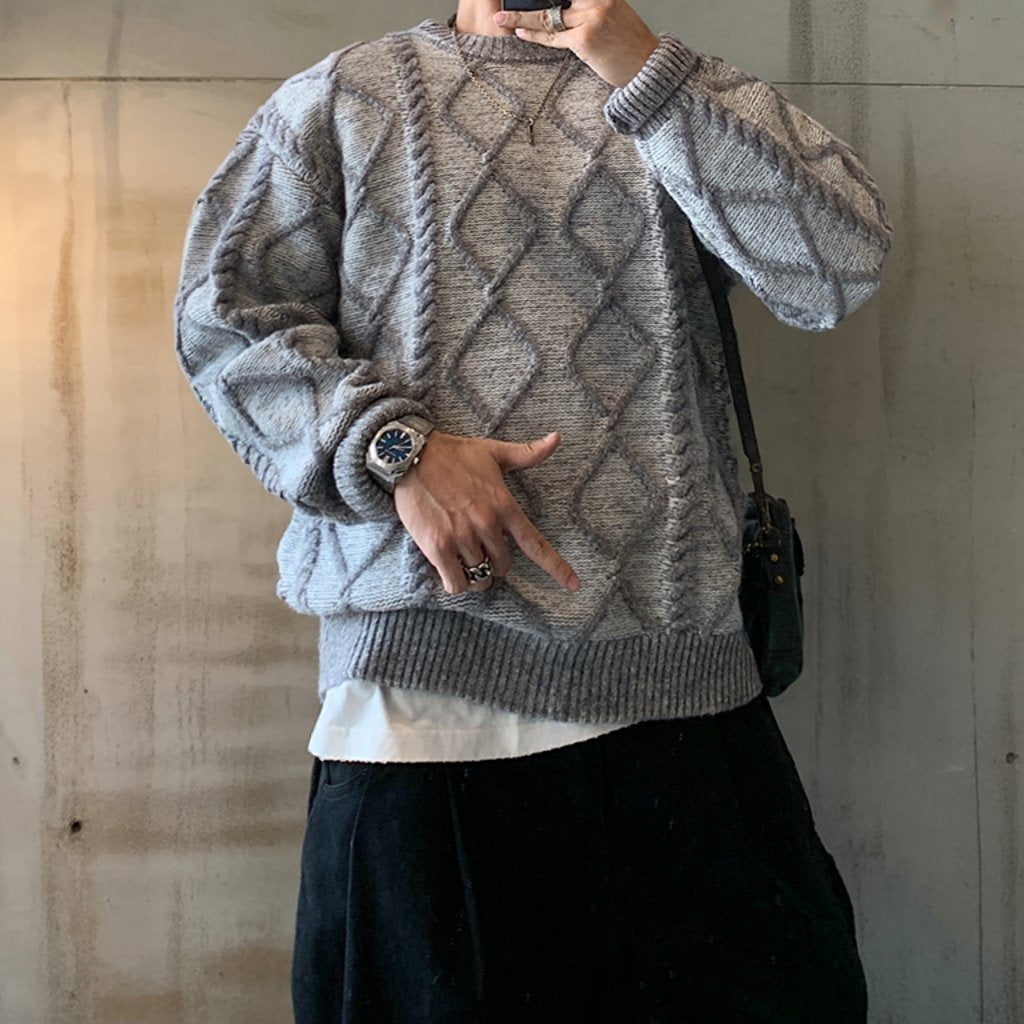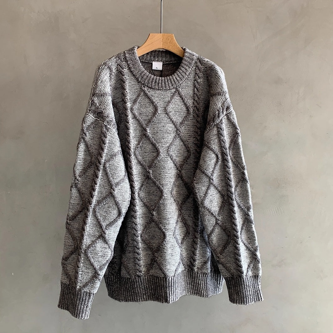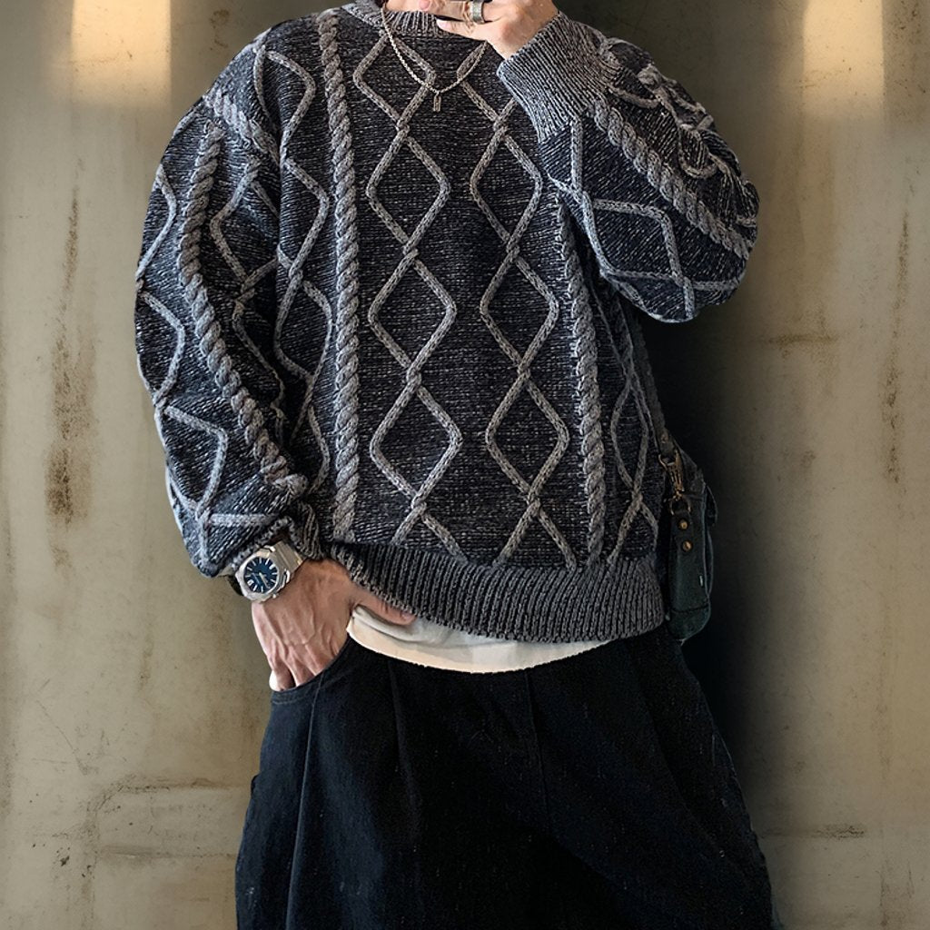 立体的なケーブル編みとダイヤ柄が存在感を放つオーバーサイズニット。