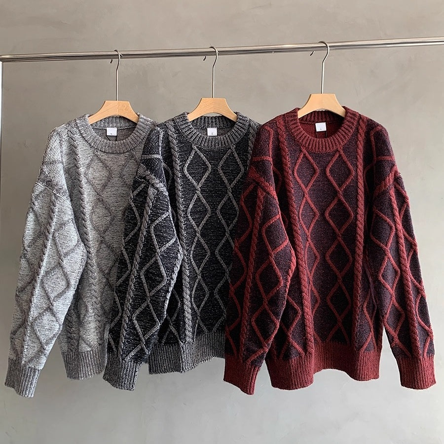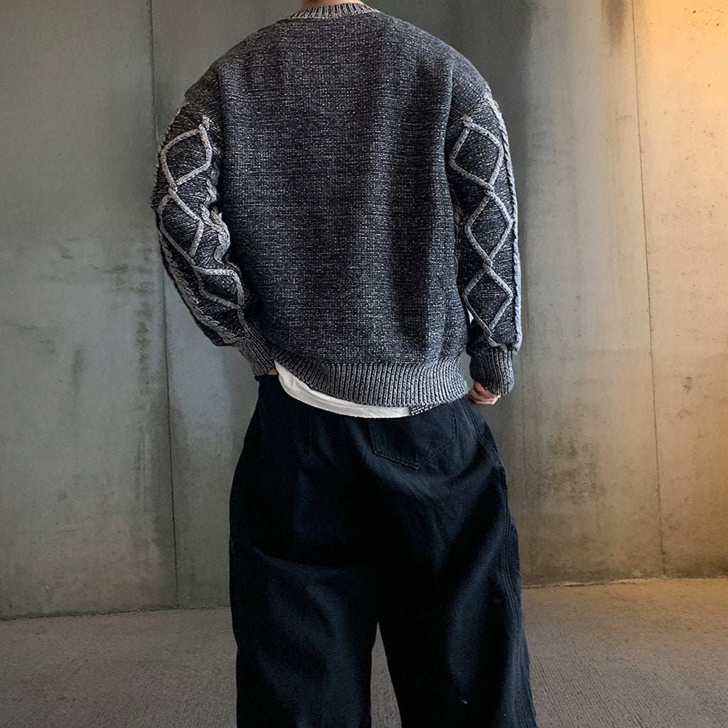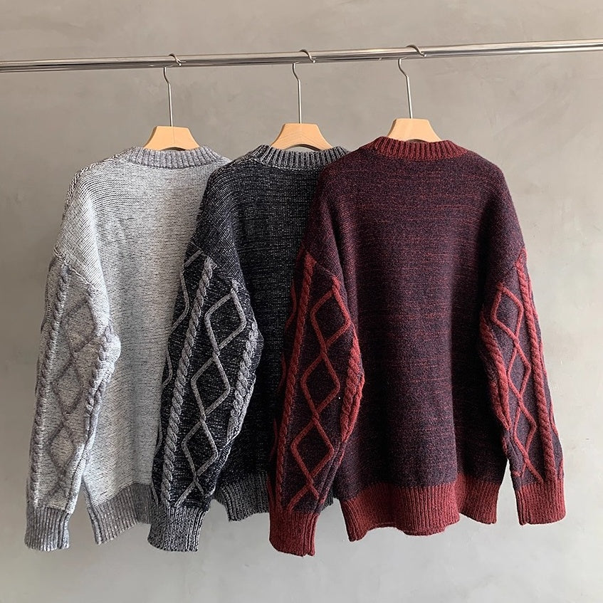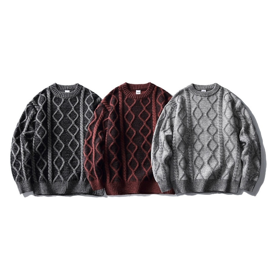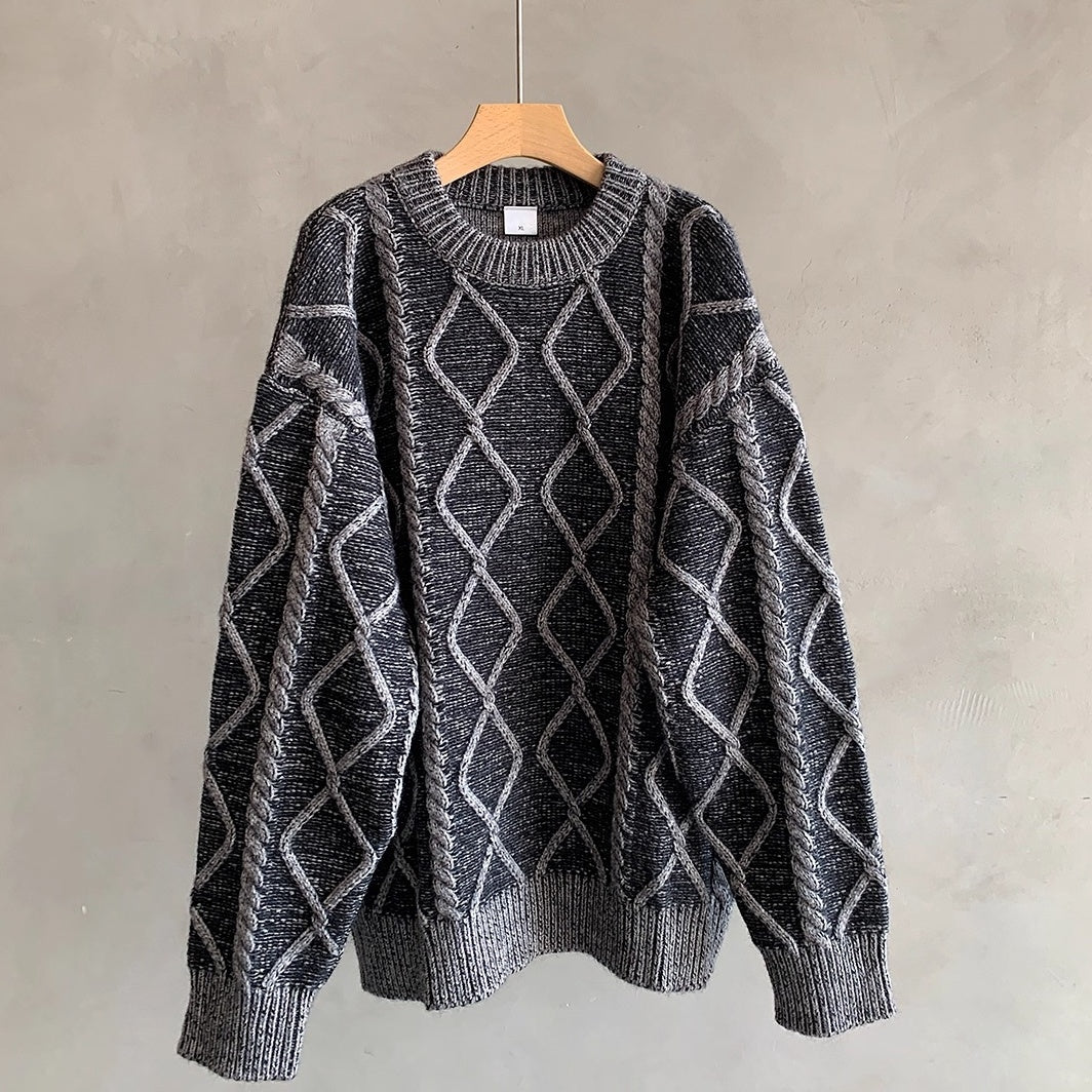 立体的なケーブル編みとダイヤ柄が存在感を放つオーバーサイズニット。
