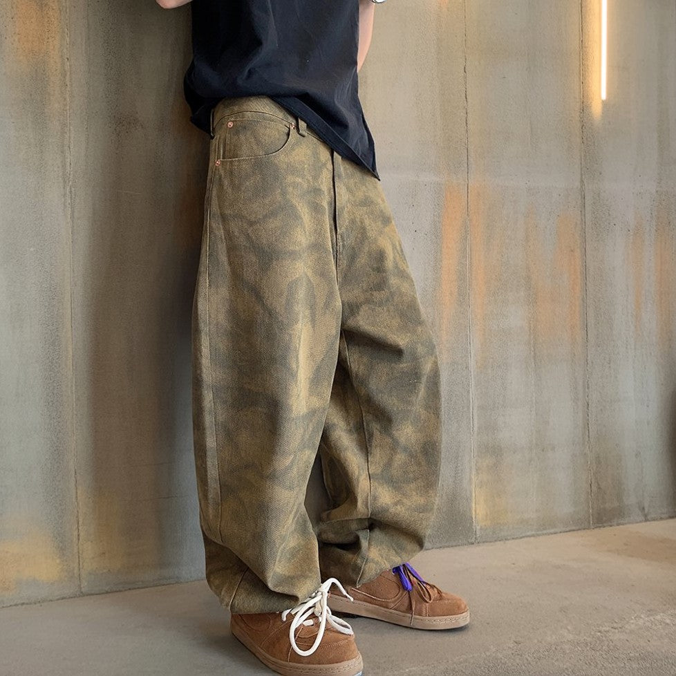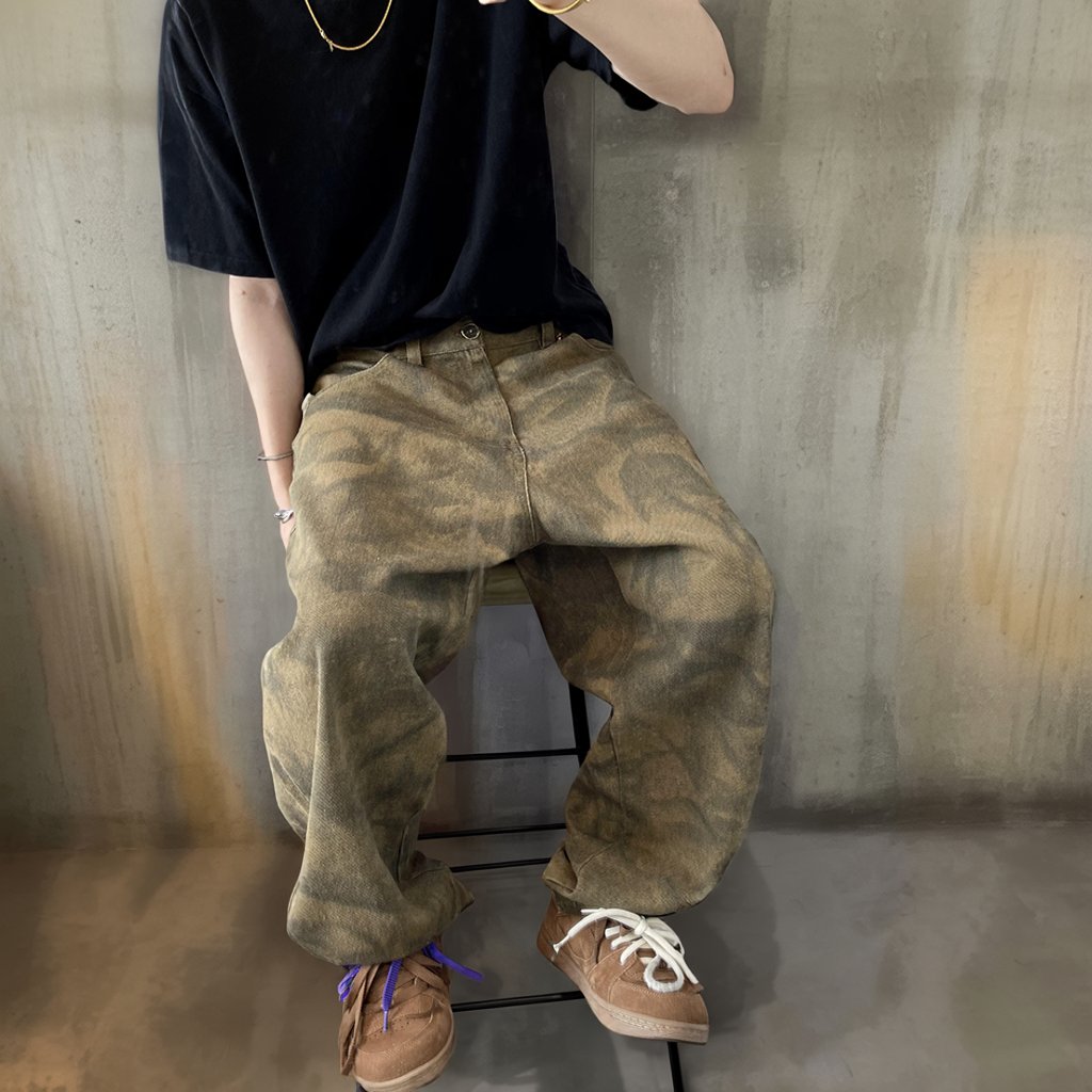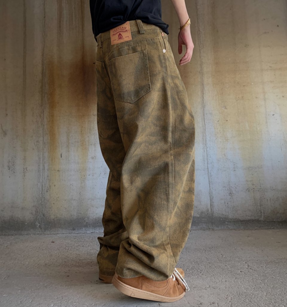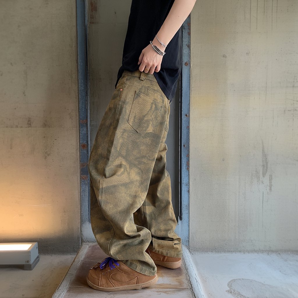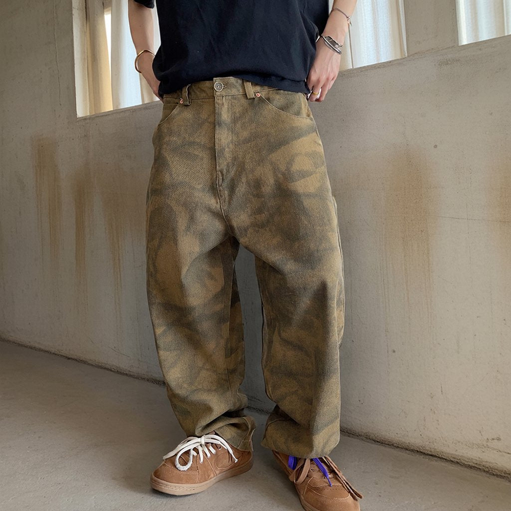 全体に広がる曖昧なウォッシュパターンと、ゆったり落ちる太めのストレートシルエットが印象的なワイドパンツです。