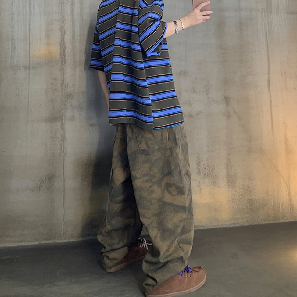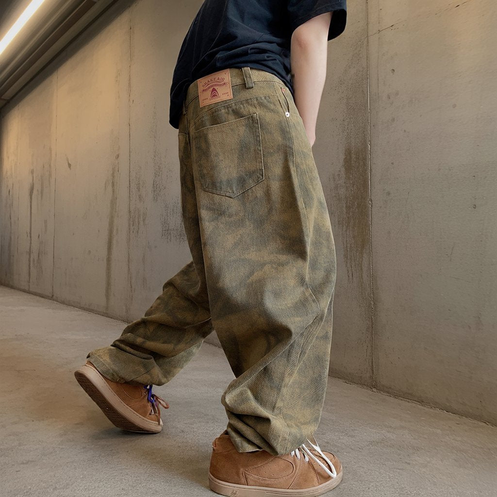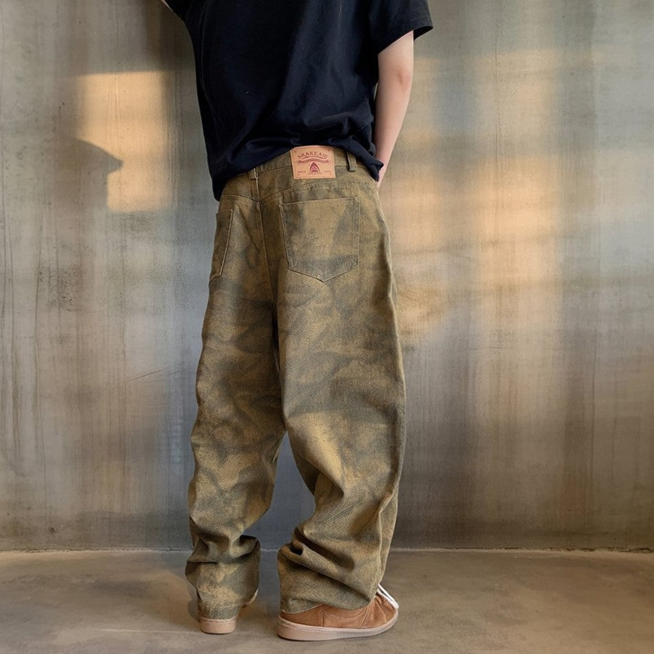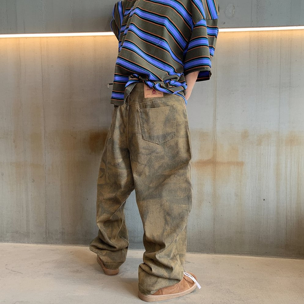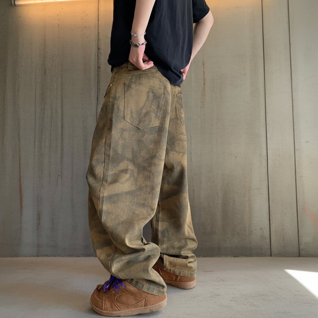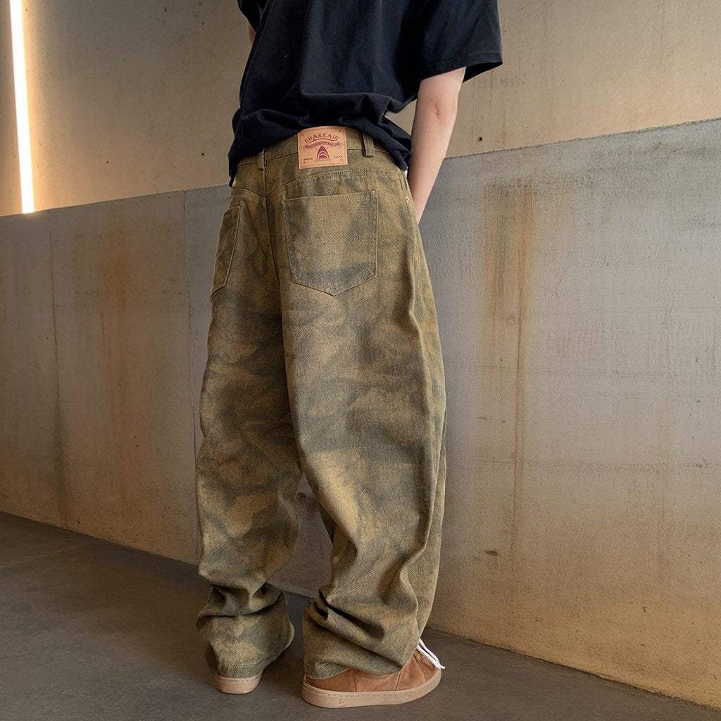 全体に広がる曖昧なウォッシュパターンと、ゆったり落ちる太めのストレートシルエットが印象的なワイドパンツです。