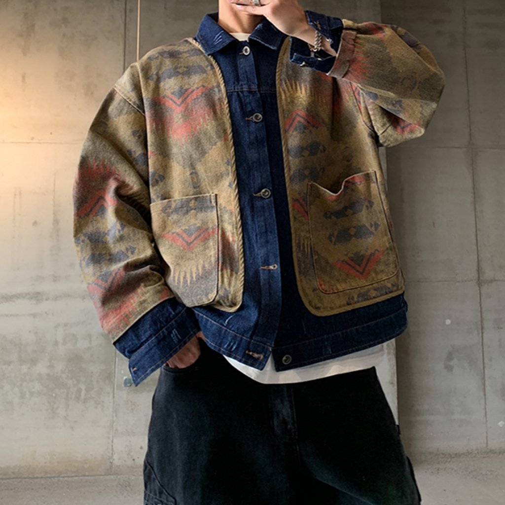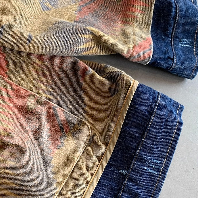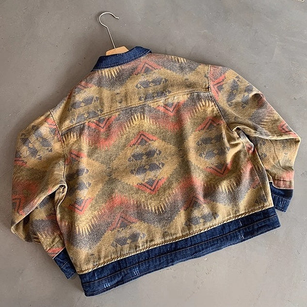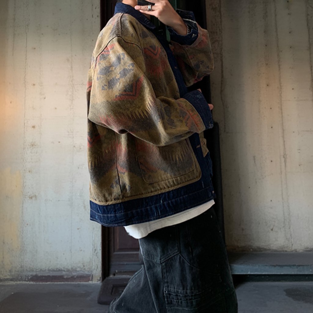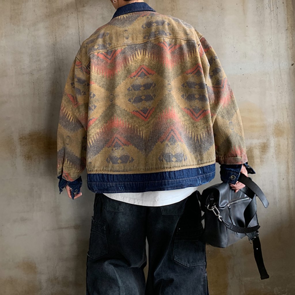 エスニックパターン生地とデニムを組み合わせた、ボックスシルエットのワークジャケット。