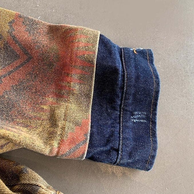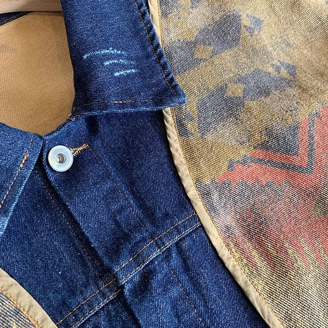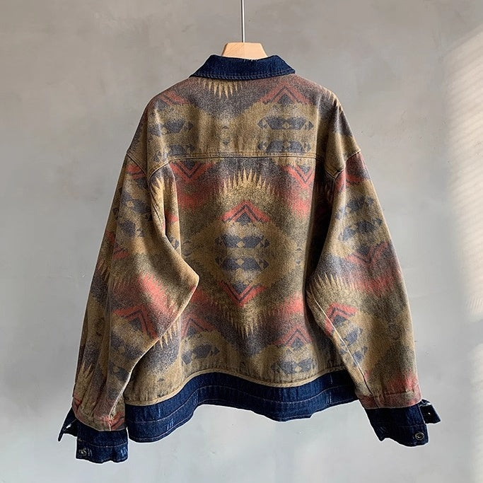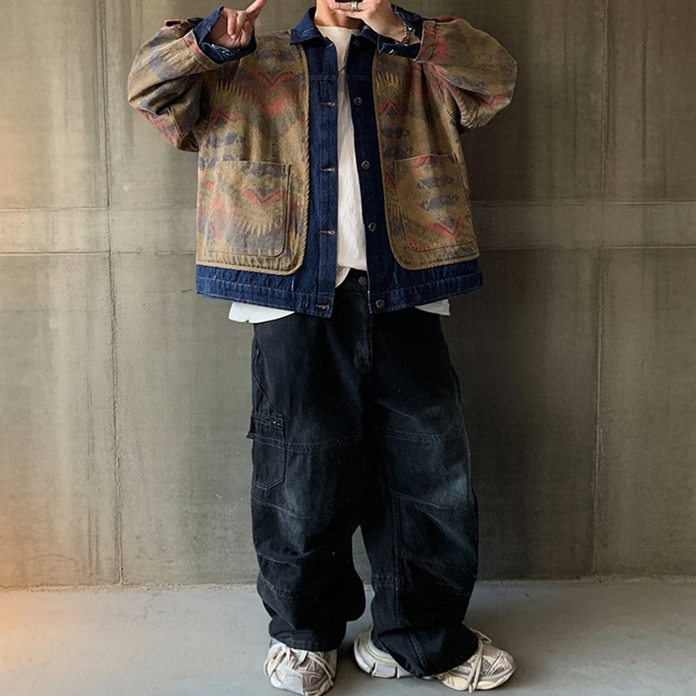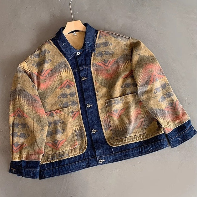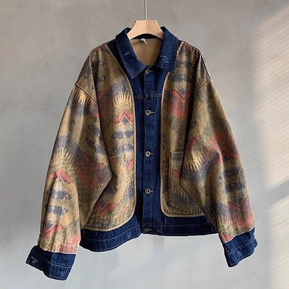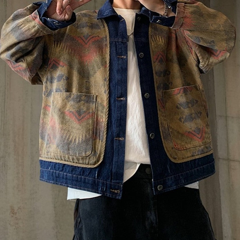 エスニックパターン生地とデニムを組み合わせた、ボックスシルエットのワークジャケット。