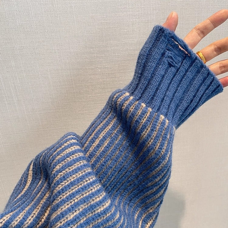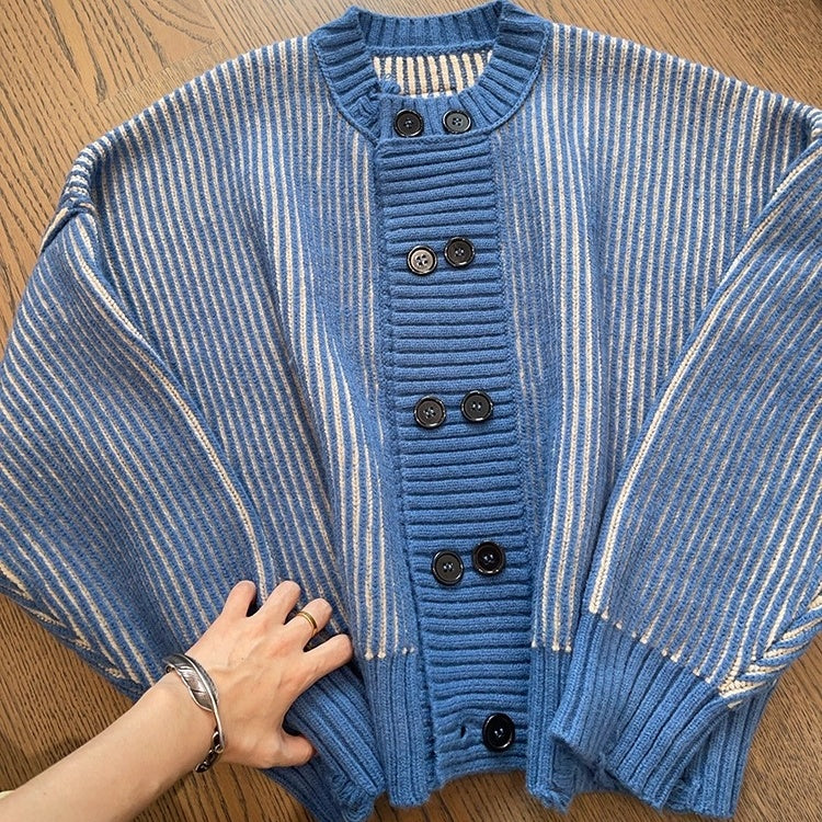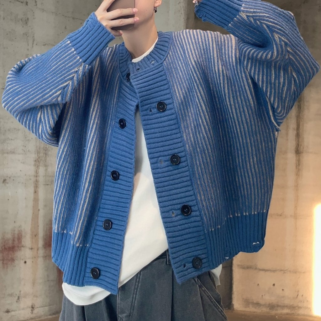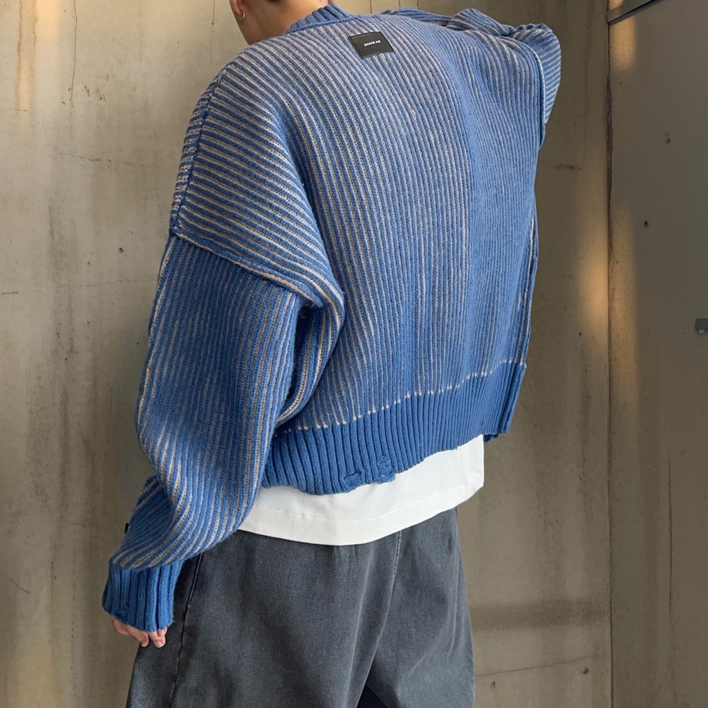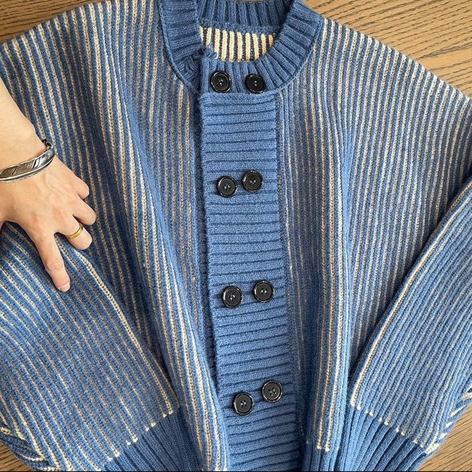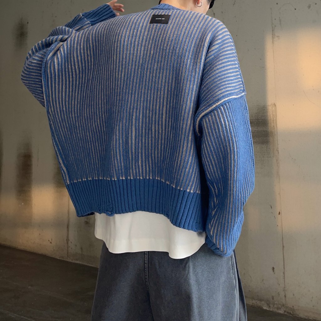 縦方向の配色リブ編みが全面に入った、ボタンフロント仕様のカーディガン。
