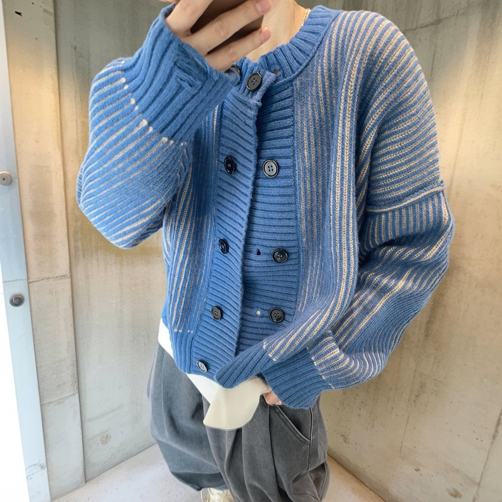 フロントは太めのリブ切り替えと複数ボタンが並び、編み柄の変化がさりげない奥行きをプラス。