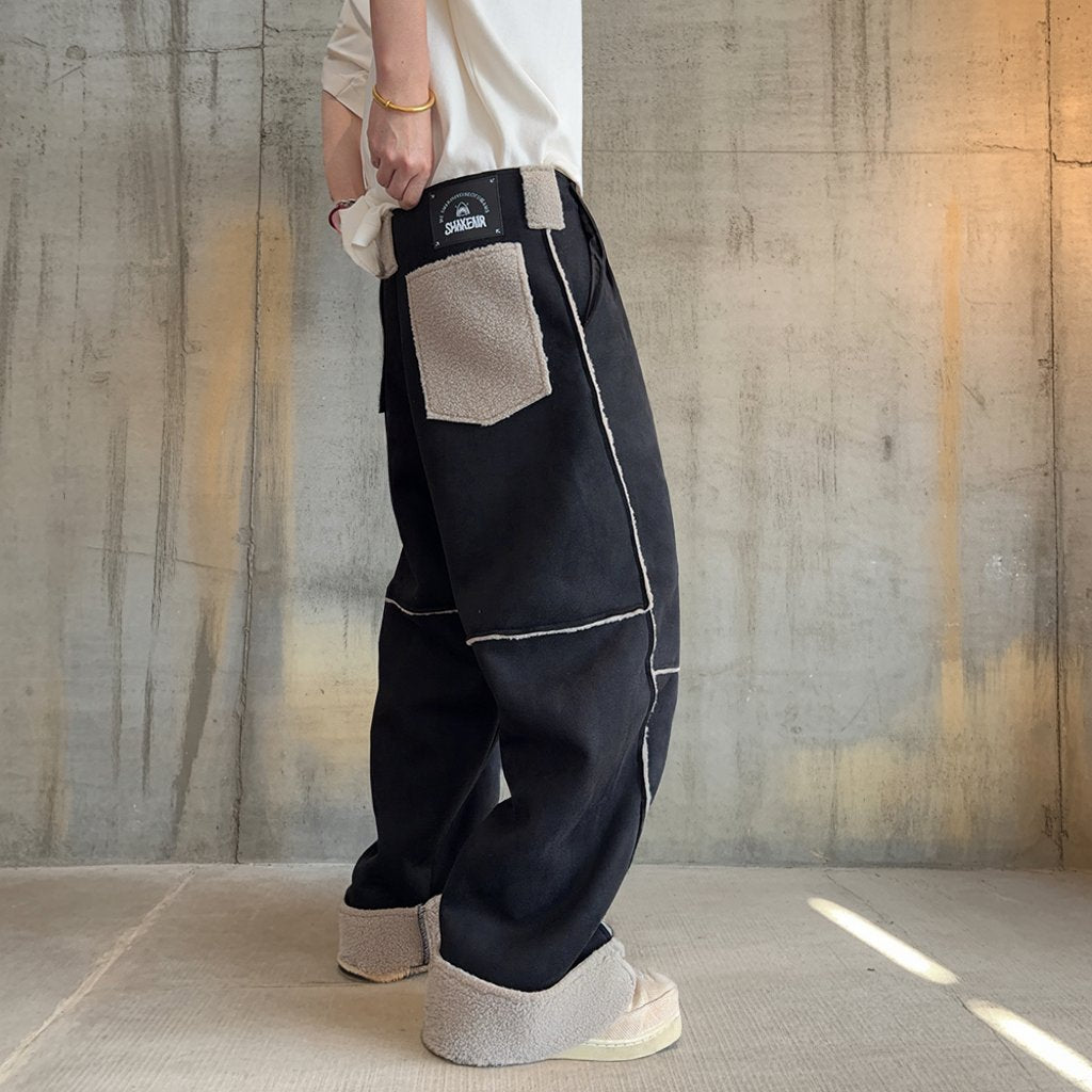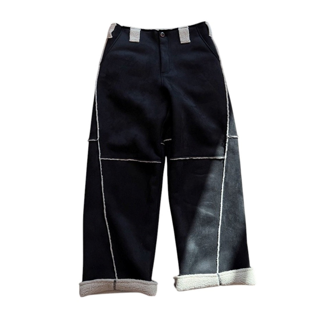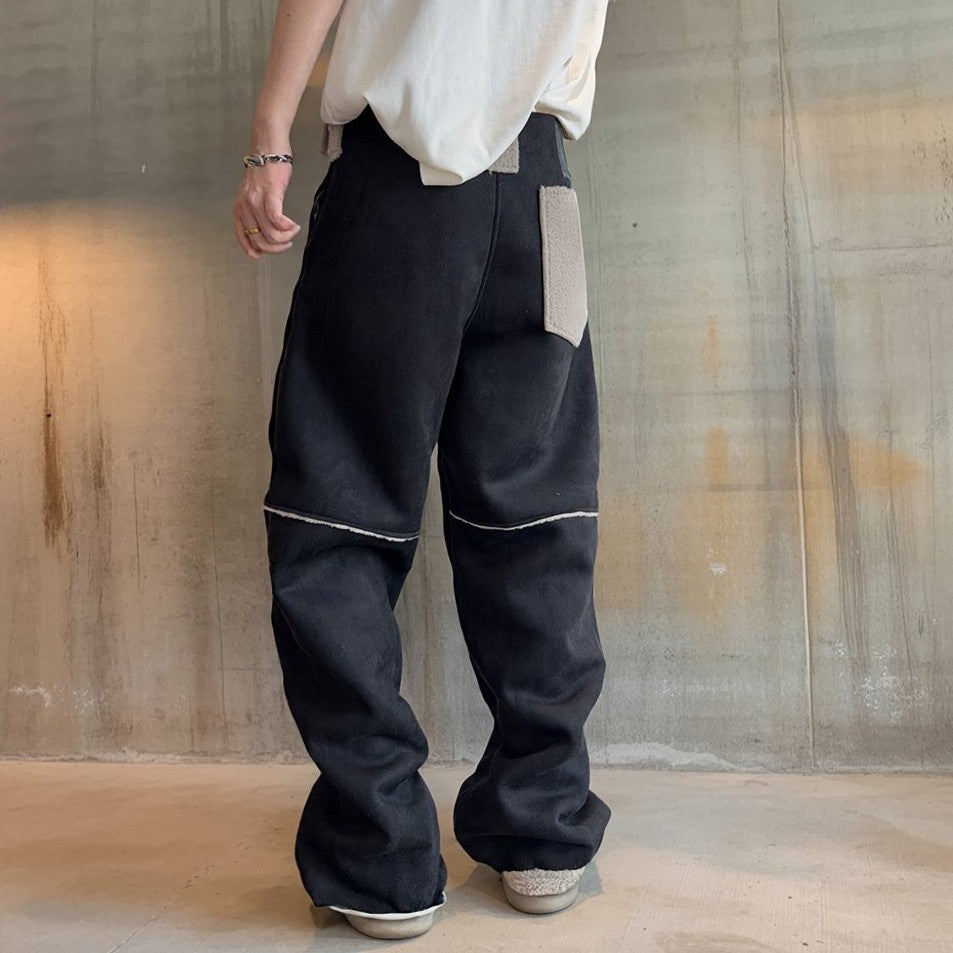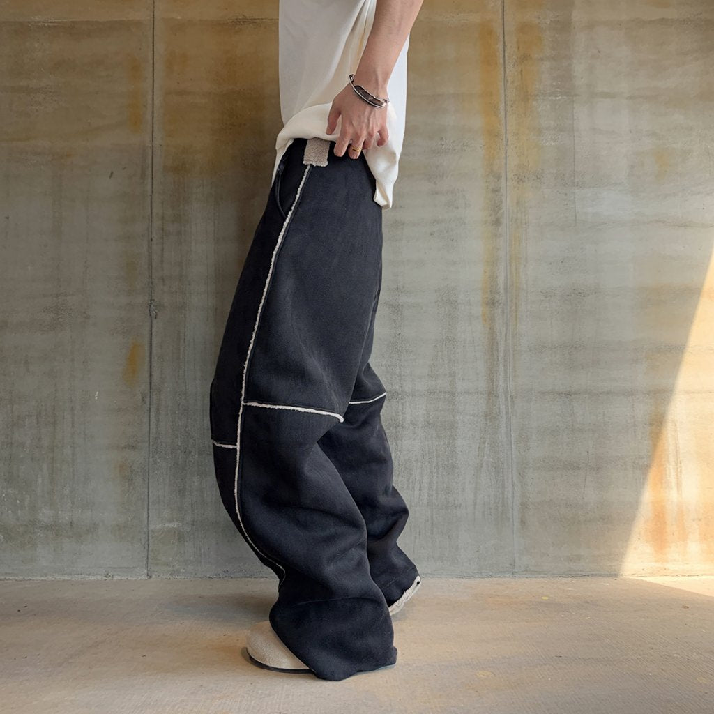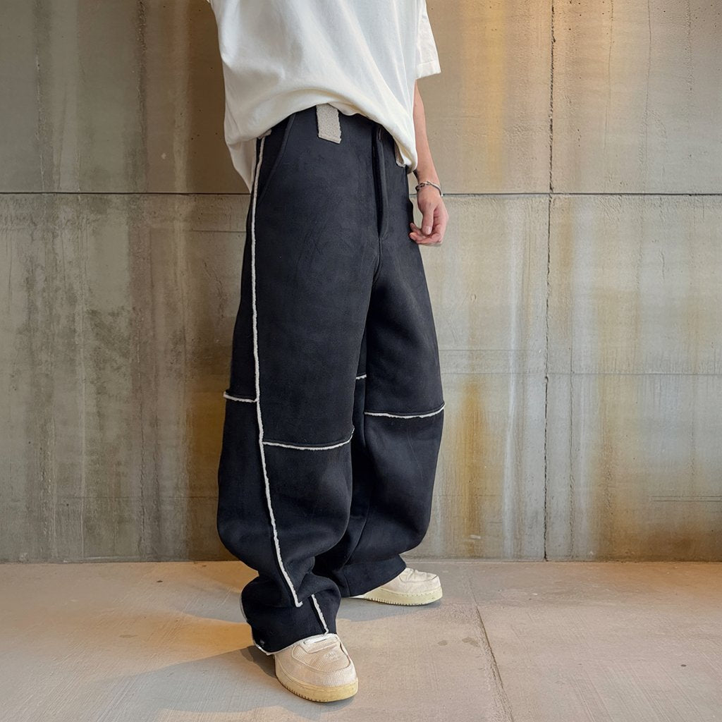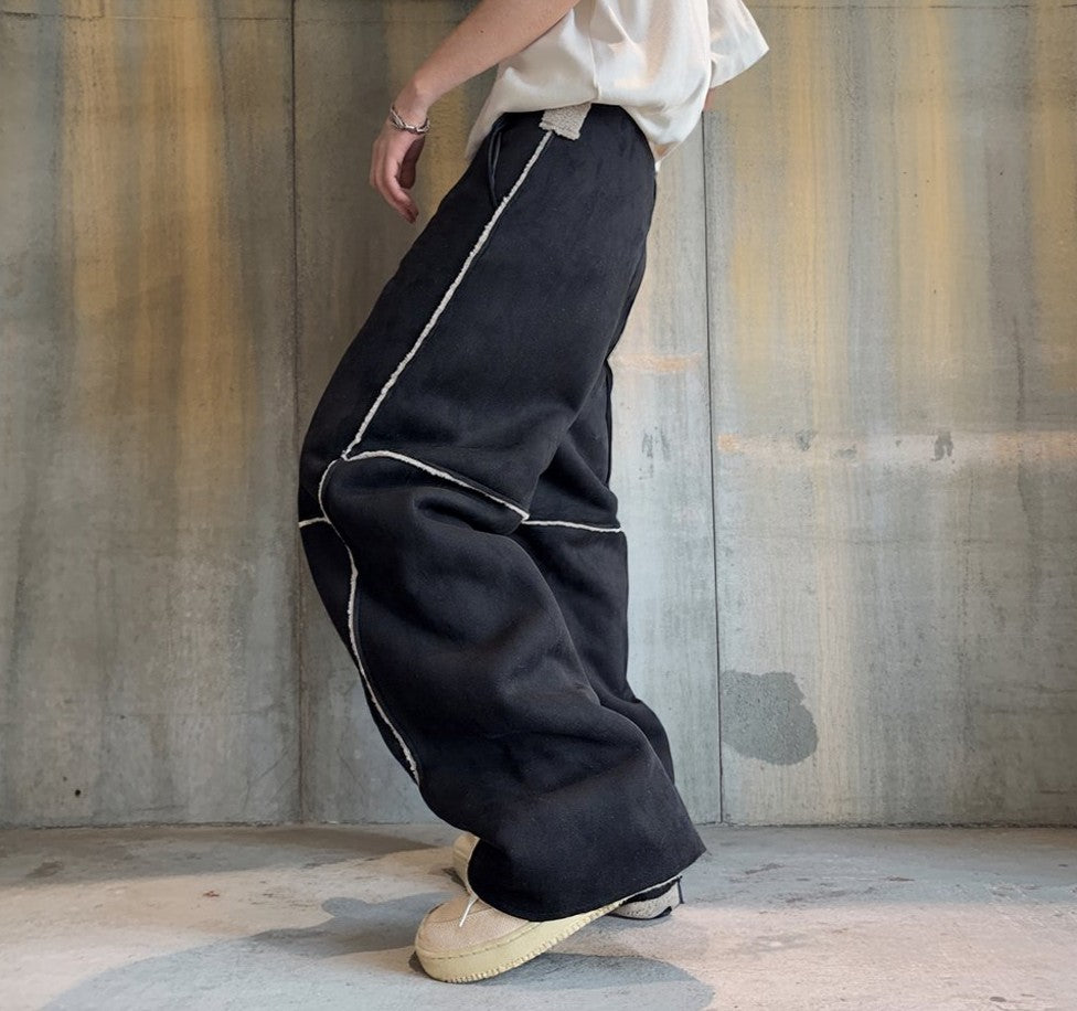 異なる表情のパネルを組み合わせ、全体にコントラストの効いたステッチラインを配したワイドパンツ。
