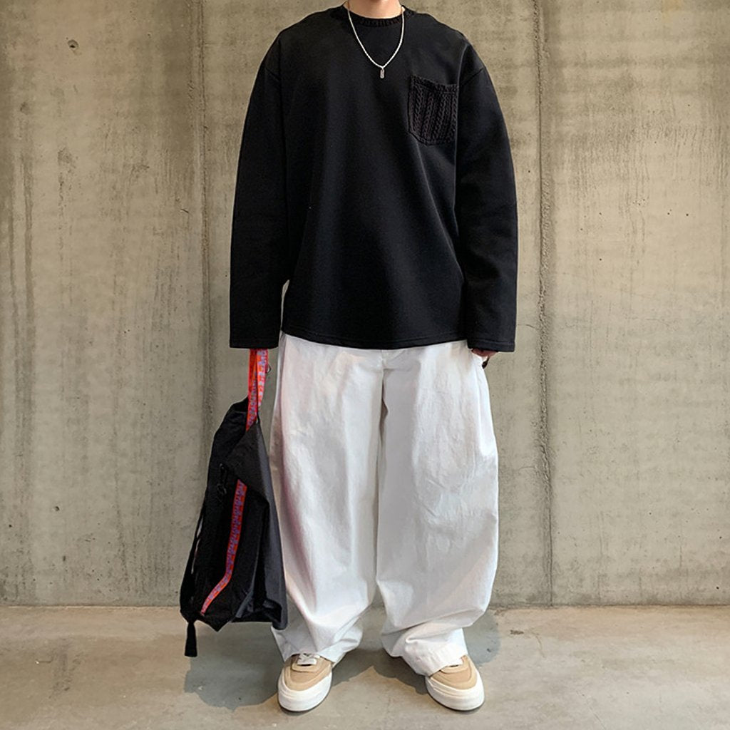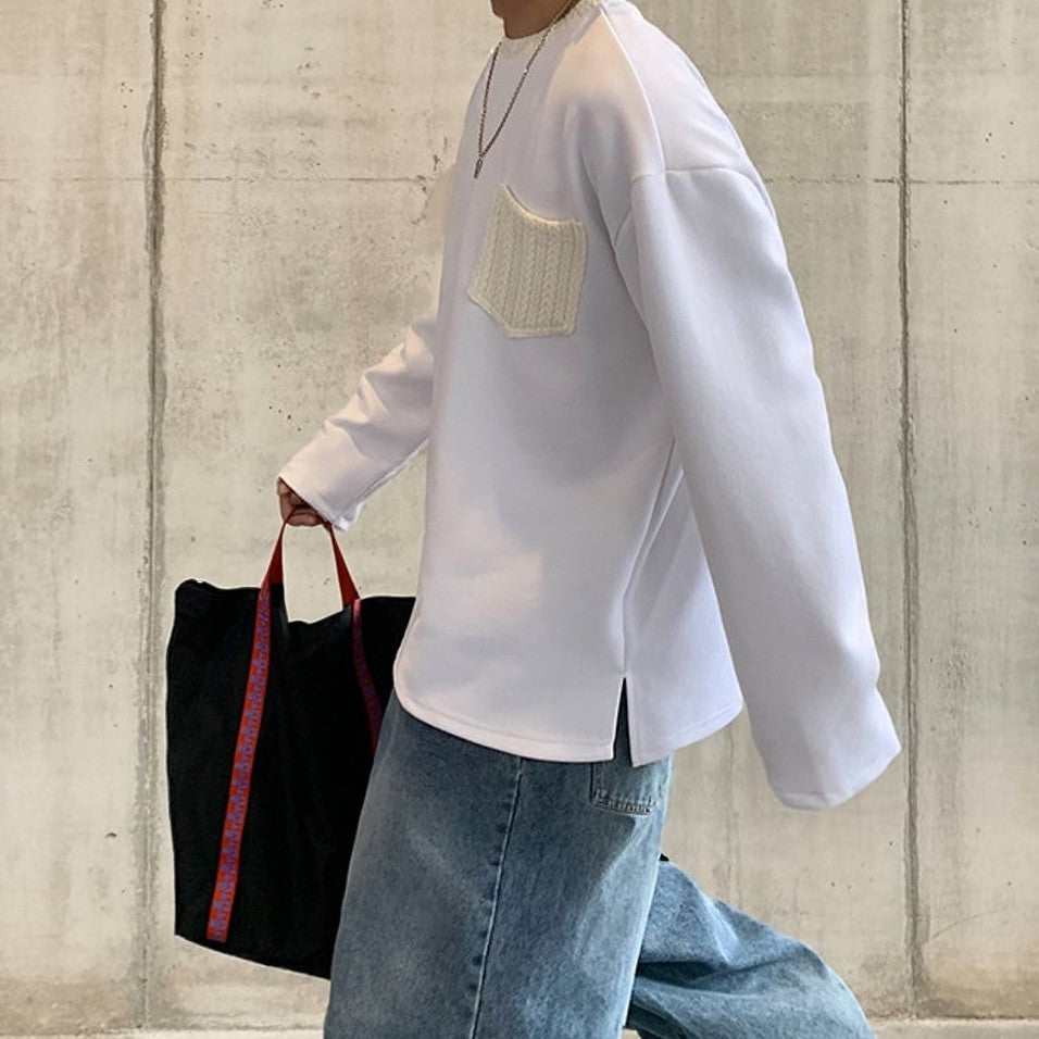 全体はゆとりを持たせたストレートなシルエットに、胸元の切り替えポケットが静かなアクセントとして映える長袖Tシャツ。