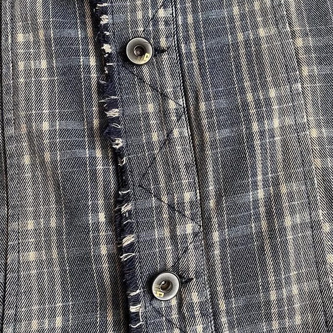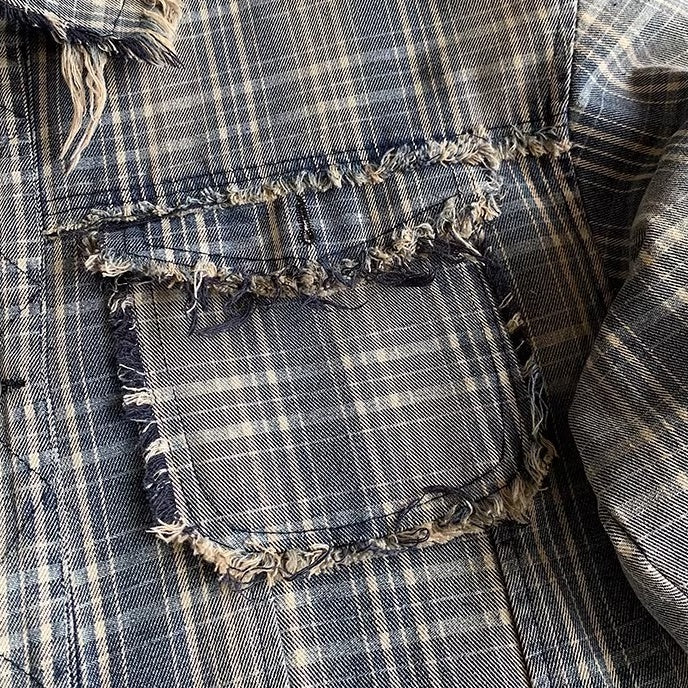 襟元やヨーク、ポケット周りにはフリンジ状のカットオフディテールを配し、ラフで少し荒さの残る表情をつくっています。
